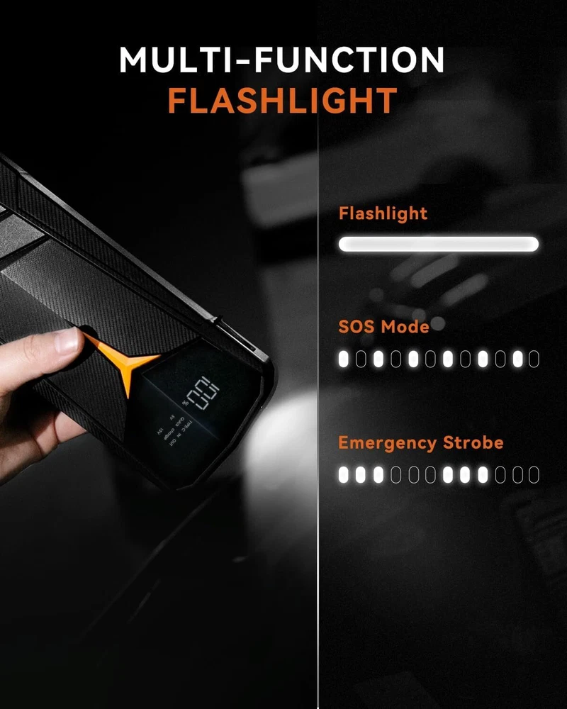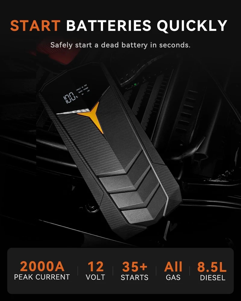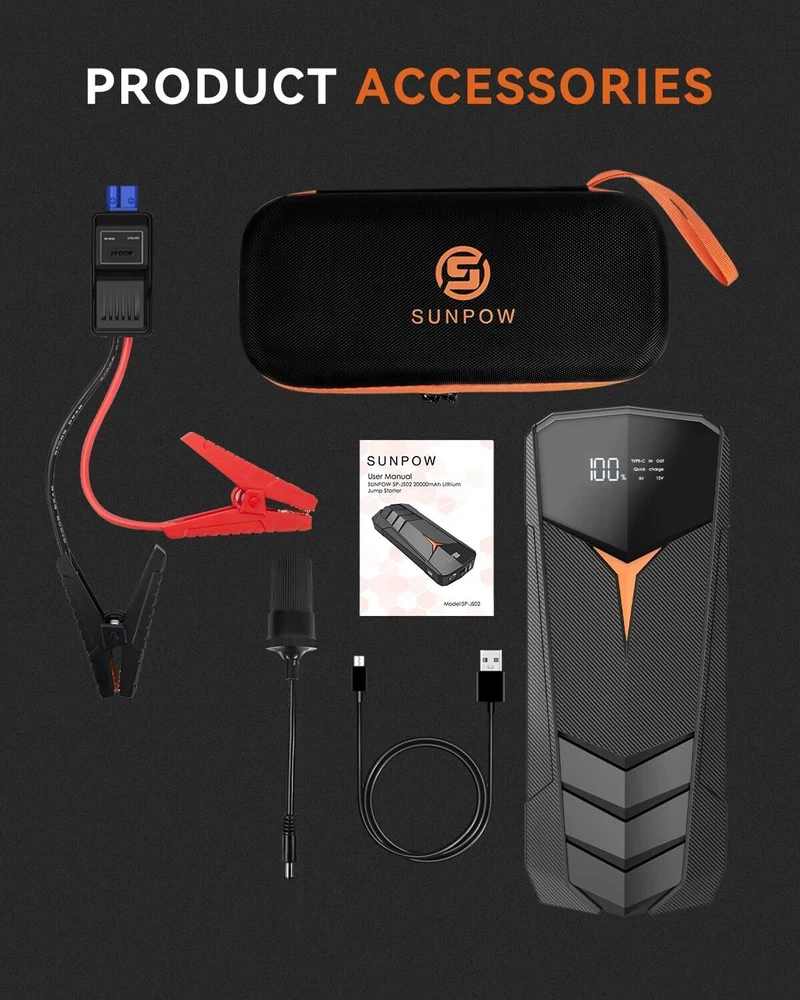 SUNPOW Lithium Jump Starter Battery Pack 2000A Peak 20000mAh (Up to All Gas and 8.5L Diesel),12V Battery Booster for Cars, Trucks, SUV, Portable Power Pack with LCD Screen & LED Light Product Details Manufacturer: SUNPOW Brand: SUNPOW Item Weight: 2 pounds Product Dimensions: 4 x 2 x 9 inches Item model number: SP-JS02 Batteries: 1 Lithium Metal batteries required. Is Discontinued By Manufacturer: No Manufacturer Part Number: 1 Bulb Type: LED Light(Spotlight/Strobe/SOS) Amperage: 2000 Amps Voltage: 12 Volts 【Super Capacity & Peak】:SUNPOW Car Jump Starter used High-speed polymer battery instead of normal starter. With the super 2000A peak and 20000mah capacity, it is easy to start a 12V vehicle (any gas engine or up to 8.5L diesel engine) , SUVs, trucks, vans, lawn-mower, snowmobile, motorcycle, yacht etc up to 35 times(charging only takes 4 to 5 hours). 【Portable & Quick Charging Jumper box】Type-C input/output 15W port and dual USB ports (one is a quick charge 3.0 port) can quickly and efficiently charge your smartphone, camera, tablet or any other compatible electronic devices. 【Multi-Function】The specially designed indicator notifies you of incorrect use with an audible buzz and flashing lights. It also has a built-in LED flashlight with 3 modes: Flashlight, Strobe, SOS. The digital LCD screen clearly displays the remaining power. The 12V/10A DC port can power for other car products (cigarette lighter adapter is included). 【Strong Protection】Advanced intelligent technology has spark proof protection, over charge protection, short circuit protection, over current protection, overload protection,over-voltage protection, reverse polarity protection, high temperature protection, low temperature protection etc. It can be started in extreme weather from -4℉~140℉. 【Professional After-Sales Service】YOU WILL GET: 1* SUNPOW Lithium Jump Starter, 1* Smart Jumper Cables, 1* Type-C Cable, 1*12V DC Cable, 1*User Guide. Any problems or questions, contact us at any time. We will help you solve it ASAP.