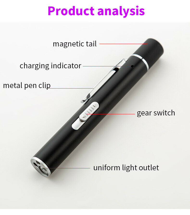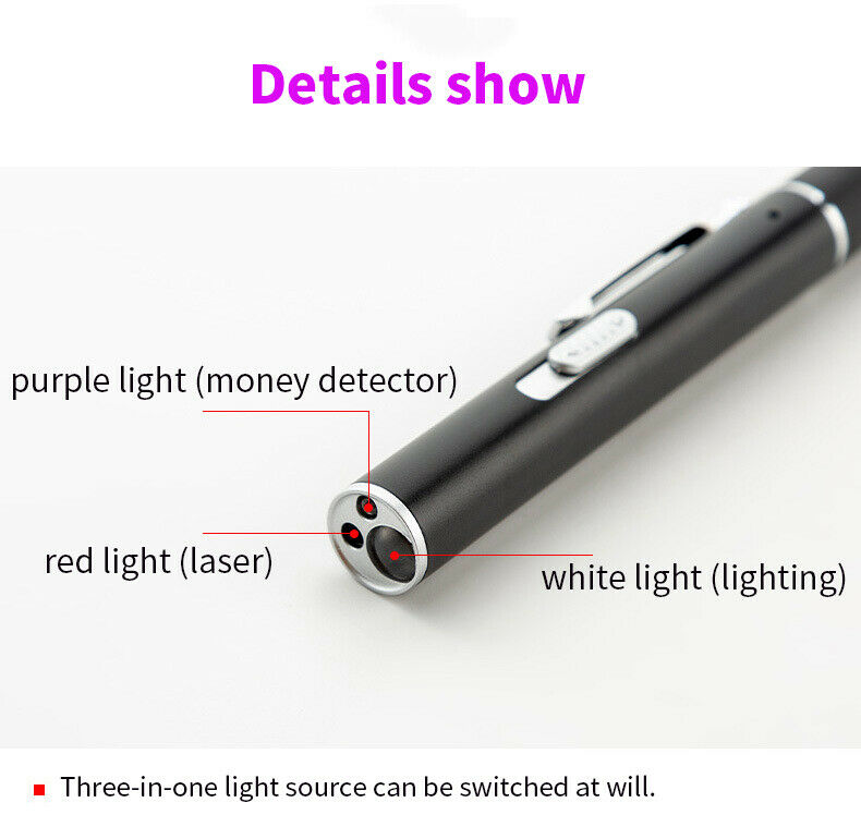 SUPER ~~ Flashlight / Laser Pointer / UV Light / Magnetic Tip ~ 4-In-1 ~~ *STYLISH PEN DESIGN* w/ Magnetic Tip in Black Case ! 4 Functions: Flashlight , Presentation laser pointer or pet toy, UV light for detection, and Magnetic Tip ~~ This is a great toy keeping your cats entertained and exercised time after time! Come with other features too ~ Travel companion and great for outdoor activities like camping, fishing & hiking Great Interactive toy -- there is no easier way to play or exercise your cat than with these handheld light pointers Your pet will be thrilled and engaged ~ this pocket-toy will capture your pets interests time after time! USB rechargeable -- Built-in USB plug ON/OFF switch design -- you don't need to hold the button down all the time -- just one push does the job! Magnetic Tip ~~ handy to stick to metal surface for hard to reach places Lighting function -- red point, LED and UV light -- use it as a handy flashlight! Safe and Convenient -- This multi-functional interactive lighting toy is safe to use and harmless w/o directly pointing to your pets' eyes