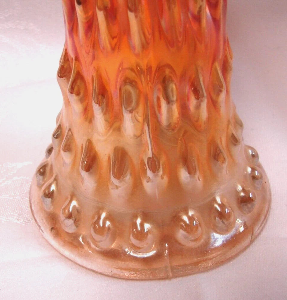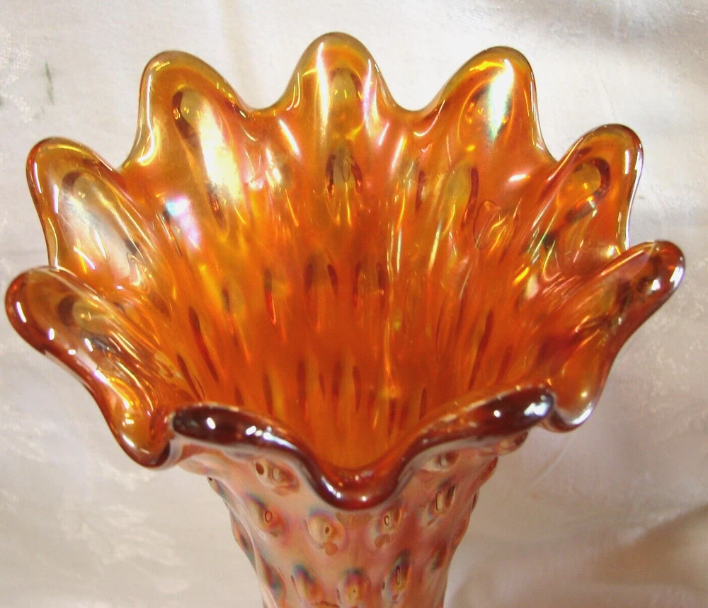 This is one of several pieces of really nice and beautiful glassware I am listing today. This all came from same estate sale of a woman that collected high end decorative glassware. Most of this is not marked and I am going by what I was told or by internet research on maker so please look at pictures and decide for yourself who made these beautiful pieces. All pieces unless noted are in great condition with no chips or cracks found. This piece is a super nice marigold rustic swung glass vase possibly by FENTON. It is 16 1/4" tall x 4 1/4" across at base. I will be glad to combine won auctions when size and weight permit so thanks and please check out my other auctions.