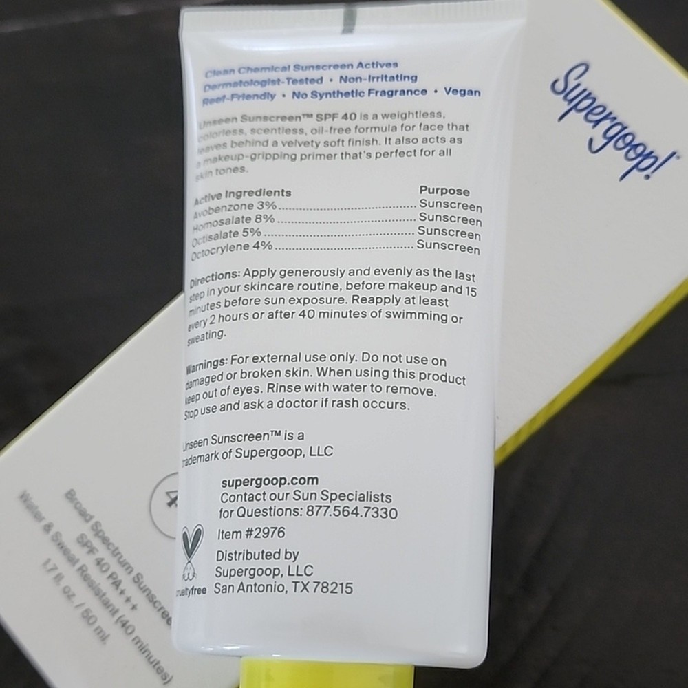 NEW WITH BOX & SEALED SUPERGOOP Unseen Sunscreen Broad Spectrum SPF 40 Fragrance Free. "A sheer, weightless, scentless sunscreen that’s recommended for sensitive skin, with expert SPF protection & a cloud-like formula to seamlessly blend in with a natural finish. Water and sweat-resistant (40 min). Non-comedogenic. Doubles as a makeup-gripping primer." Supergoop! Sunscreen. Sun Care. SPF. Beauty. Skin. Skincare. Face. Body. Suncare. Size: Full Size 1.7 oz Condition: NEW WITH BOX & SEALED ✔ NEXT DAY SHIPPING ✔ NON-SMOKING ✔ NO TRADING 0194 - 1 / 0 / 3 oz