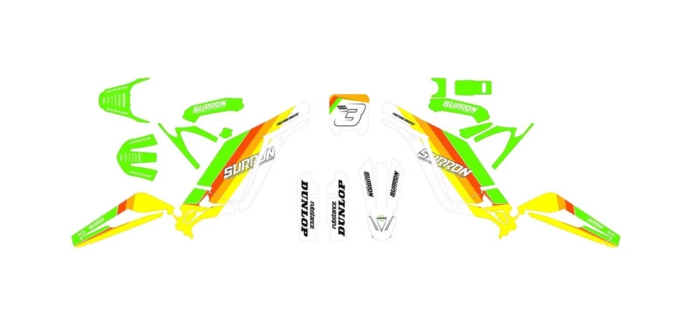 WRITE US "GLOSSY" OR "MATTE" SURFACE, IF WE DO NOT GET MESSAGE OR NOTICE ON ORDER, OTHERWISE WE WILL SHIP GLOSSY GRAPHICS! STICKER ARE CUSTOM MADE AND WE CAN CHANGE COLORS IN ORDER - FULL KIT GRAPHICS FOR SUR RON LIGHT BEE X, L1E GRAPHICS MADE FROM 200 MICRONS LAMINATED NANOTECH VINYL BUBBLE FREE ADHESIVE MATERIAL ATTENTION! INCLUDES ALL PARTS FROM PICTURES WE DELIVER ALL PARTS FROM PHOTOS REVIEW PARTS IN PHOTOS THAT WILL MATCHES YOUR BIKE PARTS ESPECIALLY FRONT FORK STICKERS BECAUSE STOCK SUR-RON COME WITH 3 DIFFERENT TYPE FORKS. SOMETIMES COLORS FROM PICTURES CAN BE DIFFERENT BECAUSE OF YOUR SCREEN DISPLAY, PLEASE REVIEW PHOTOS FROM SEVERAL DEVICES TO BE SURE THAT COLORS WILL MATCH YOUR WISHES PLEASE USE HELP OF PROFESIONALS TO ATTACHING THE APPLIQUE GRAPHICS NEED TO BE HEATED TO STICK WELL AND MAKE CURVED SURFACE LINES BUT NOT TOO MUCH FOR KEEPING GLUES ON GRAPHICS AND NOT STRETCHED STICKER FORMS GRAPHICS, STICKERS, DECALS APPLYING MANUAL INCLUDED WITH SET ORDER WILL BE SHIPPED 2 DAYS AFTER PAYMENT RECEIVE ALL GRAPHICS CUSTOM MADE BY ORDER AND CAN NOT BE RETURNED SHIPPING USUALLY TAKES 3 WEEKS FROM ORDER BUT SOMETIMES DELIVERY CAN BE LATE BECAUSE OF TRANSITION TIME WE ALSO ACCEPT FULLY CUSTOM DESIGNS FOR SURRON JUST WRITE US BEFORE ORDER OR IF YOU HAVE ANY QUESTION DO NOT HESITATE TO WRITE US!