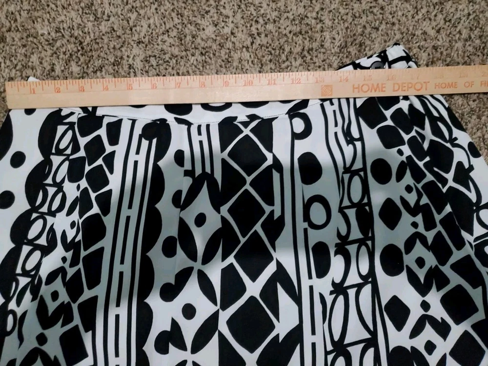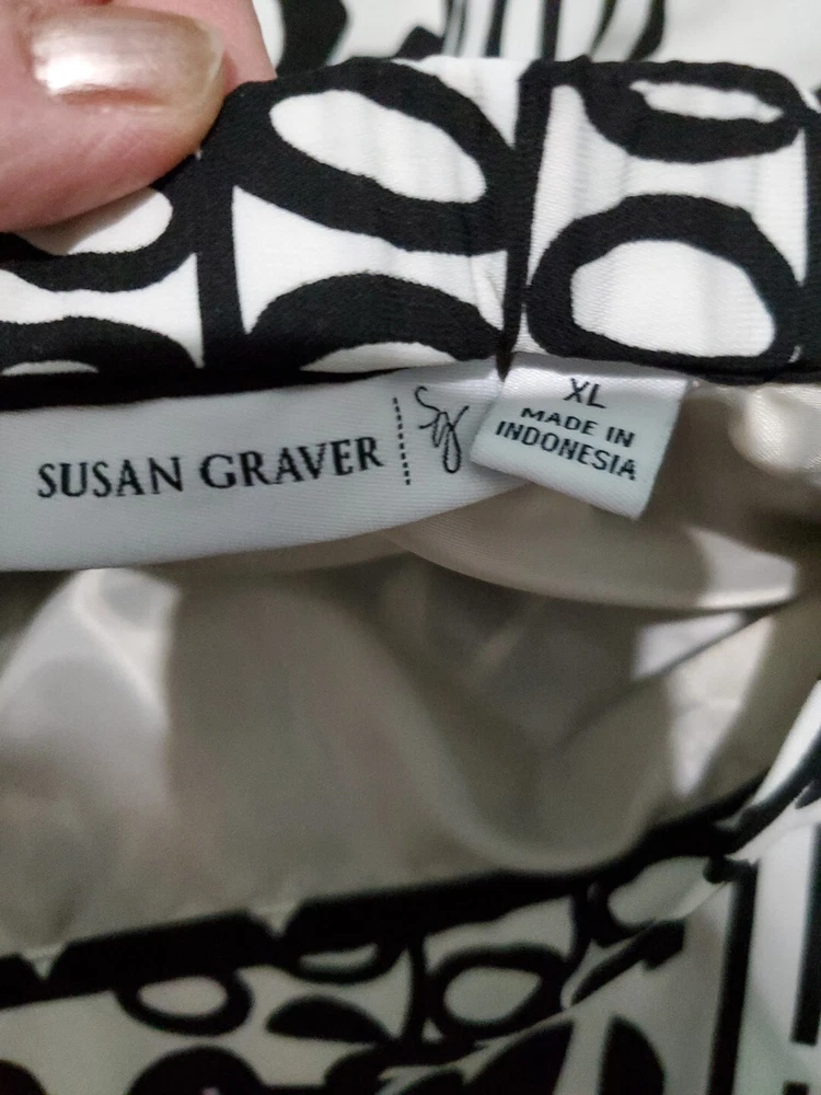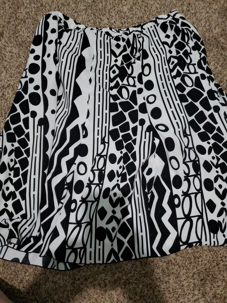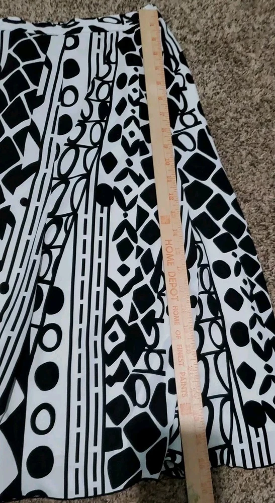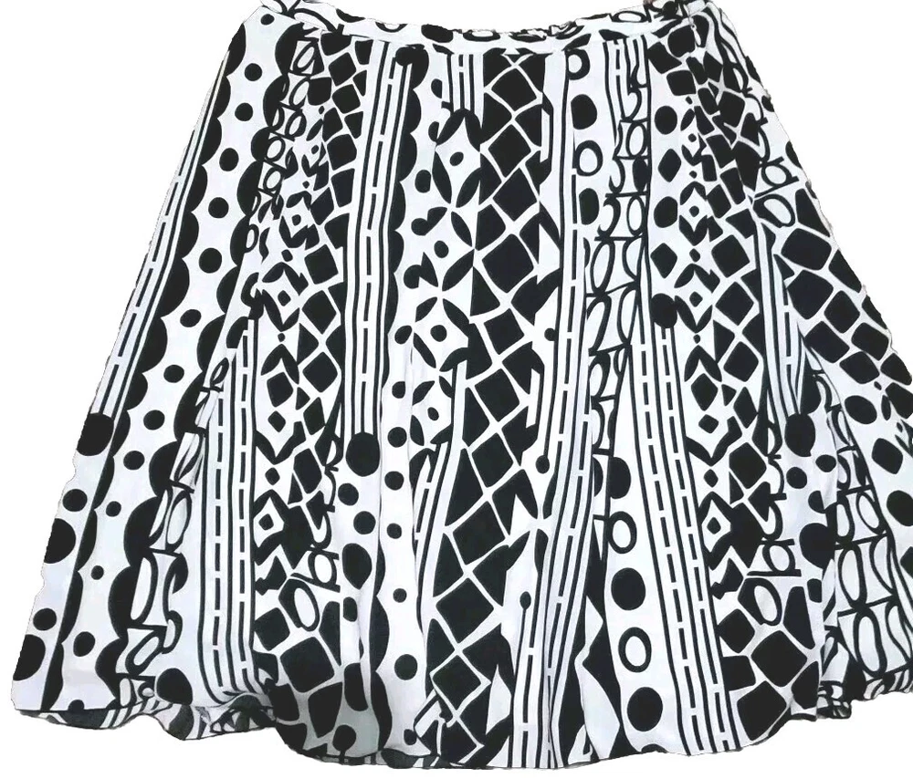 Elevate your wardrobe with this chic black and cream abstract midi skirt from SUSAN GRAVER. Featuring a flattering A-line style and an elastic waist for a comfortable fit, this skirt is perfect for any occasion. The lightweight and stretchy knit fabric make it suitable for all seasons, while the ruffle and layered accents add a touch of bohemian flair. Pair it with your favorite top and accessories for a stylish and modest look that can take you from work to a wedding or a party with ease. Designed with pull-on closure and made of polyester and spandex, this skirt is machine washable for easy care. Invest in this versatile piece from Chico's and elevate your wardrobe today.