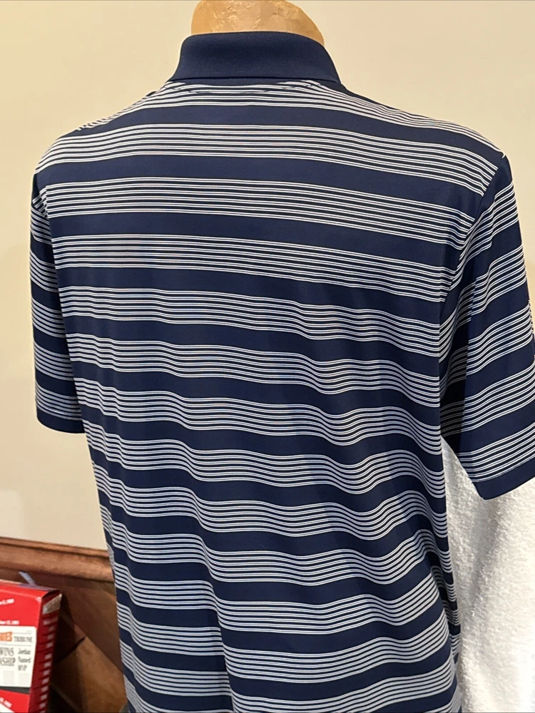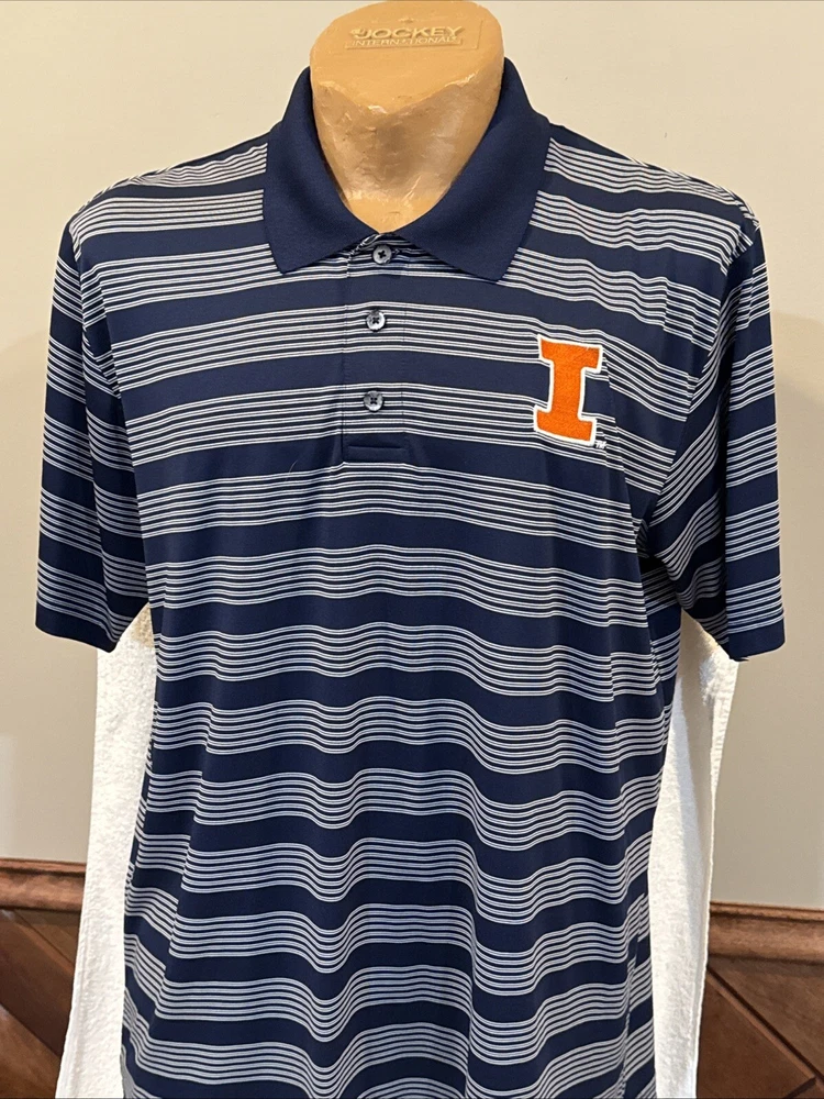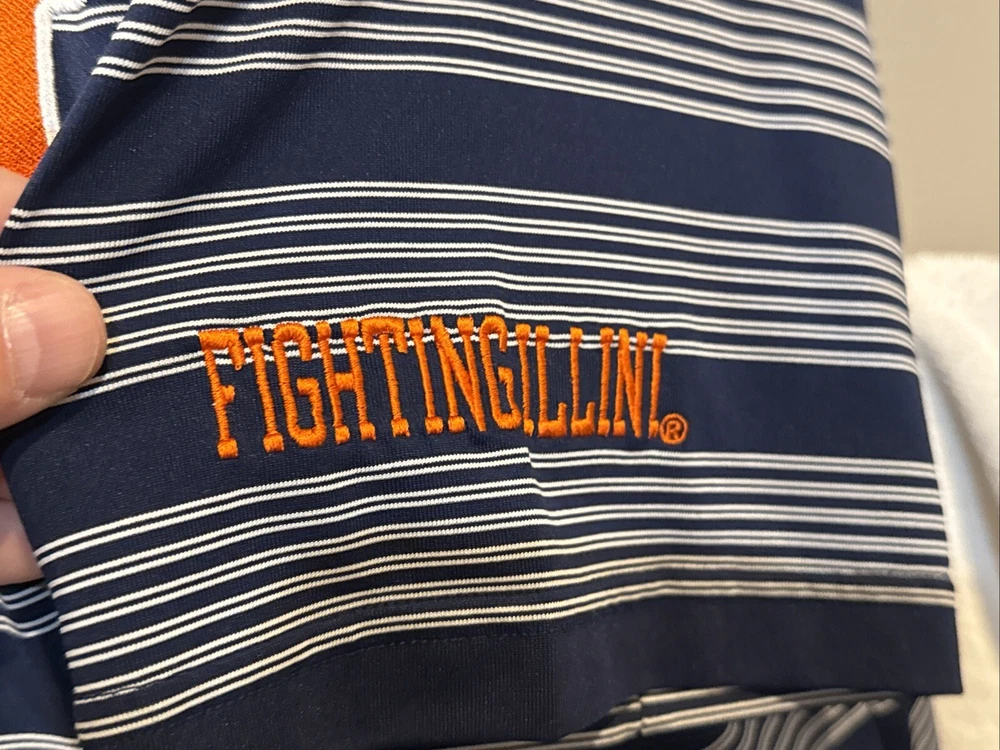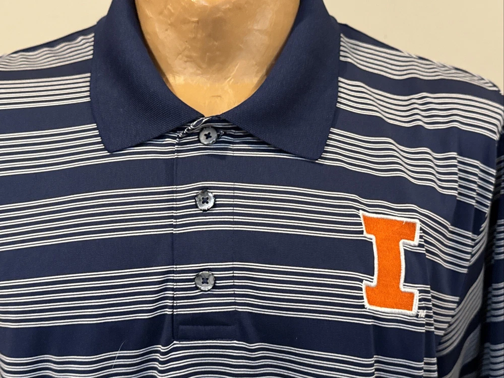 You are purchasing a BEAUTIFUL Illinois Fighting Illini short sleeved Polo style dress shirt. Shirt is an adult size X-large 46-48. Shirt is dark blue in color with white striping. Shirt has beautifully embroidered Illinois I logo on front left chest. Fighting Illini is embroidered on left sleeve as shown. No markings on back side of shirt or on sleeves. 3-button up front. Lapel collar. Shirt is 100% light weight polyester material. Made by KA Inc/Knights Apparel. Shirt is new, never worn condition, no tags. BEAUTIFUL shirt for any Illini fan! Buyer pays $5.00 shipping. Shipping combined on multiple lots whenever possible. Thanks for your business! Please check out my Ebay store for more great items!