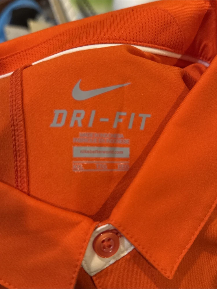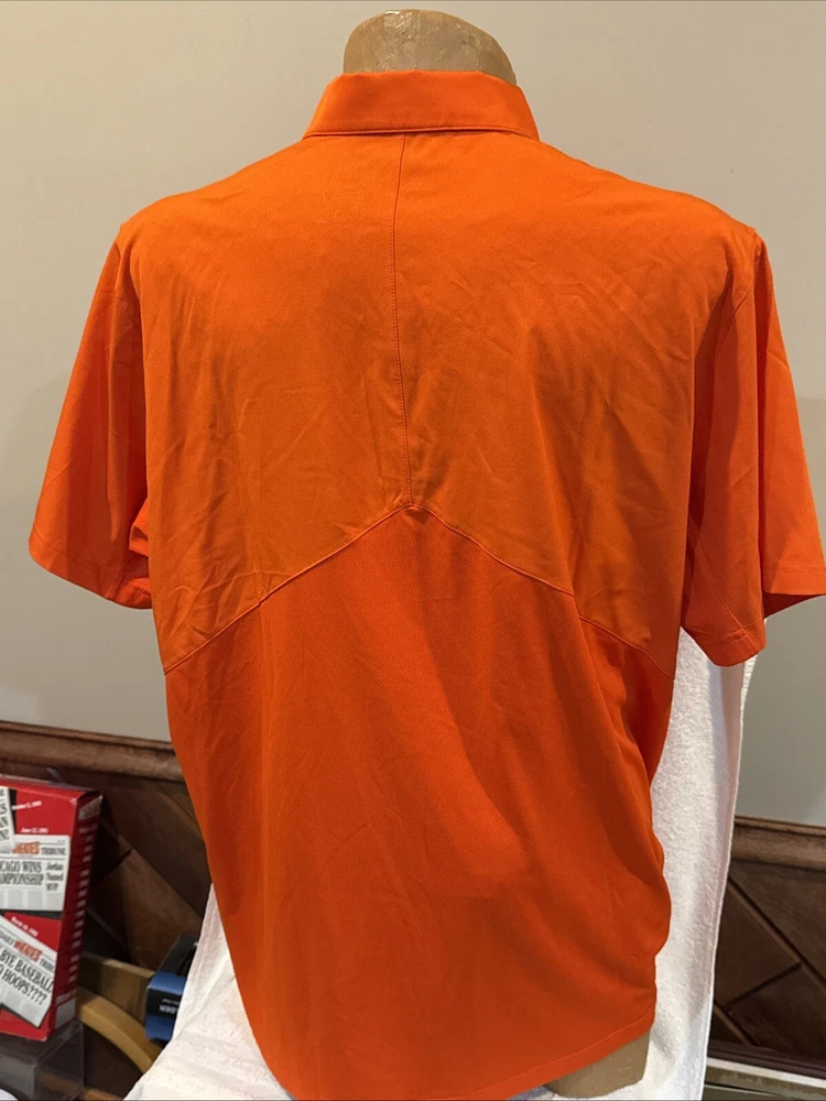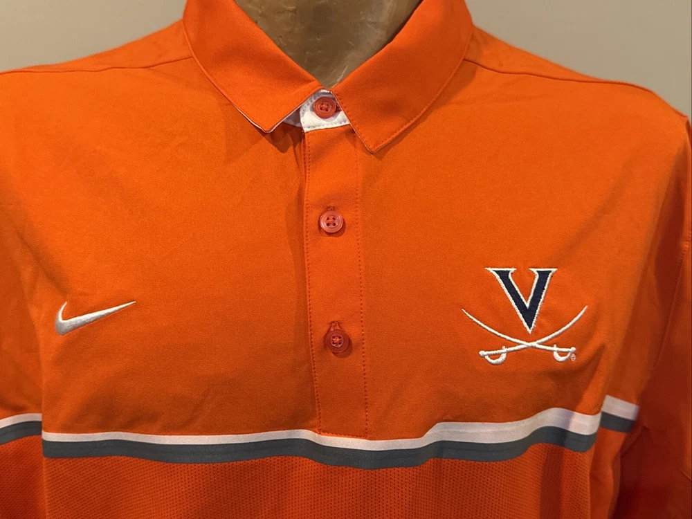 You are purchasing a very nice Virginia Cavaliers short sleeved Polo style dress shirt. Shirt is an adult size XX-large. Shirt is orange in color with light gray and white striping across the chest. Shirt has embroidered Cavaliers logo on front left chest. Nike logo is embroidered on right chest in white. 3-button up front. Lapel collar. Shirt is 100% light weight dri-fit polyester material. Made by Nike Dri-Fit. Shirt appears new and unworn. BEAUTIFUL shirt for your Cavaliers fan! Buyer pays $5.00 shipping. Shipping combined on multiple lots whenever possible. Thanks for your business! Please check out my Ebay store for more great items!