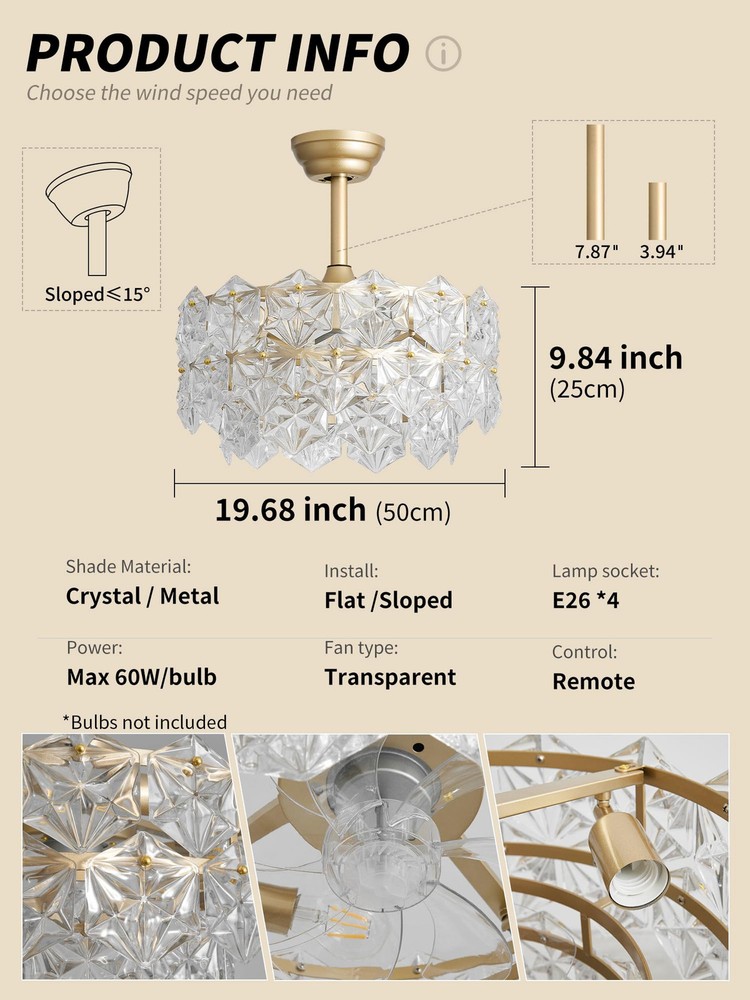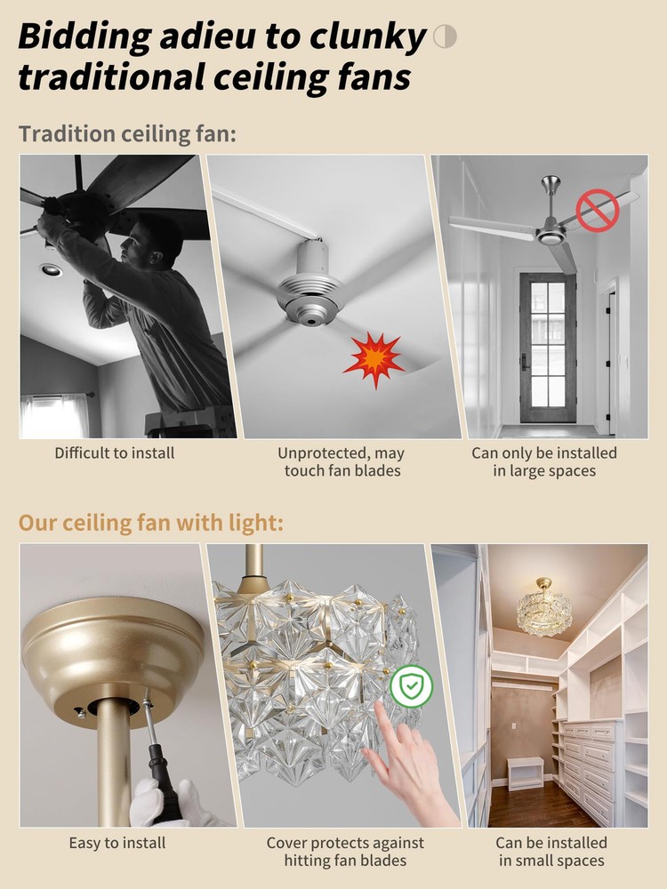Installation Tips: If you encounter any broken glass components while installing your Gold Crystal Ceiling Fan with Lights. We will promptly send you the replacement parts! Patented Crystal Design: Say goodbye to those clunky, old-fashioned ceiling fans and welcome a whimsical upgrade with our enclosed gold crystal fandelier ceiling fan with light. This caged fancy Chandelier ceiling fan not only adds a touch of modern elegance and efficient air circulation, but it also gives your room a dose of dreamy relaxation. Perfect for all the free-spirited crystal enthusiasts out there, because who says air circulation can't be stylish and fun? Personalized Comfort: Our gold crystal fandelier ceiling fan with light is all about giving you the perfect ambiance. With separate fan speed and light adjustments, you can create a breeze that's just right for you. And guess what? It operates so quietly that you can even have a whispered conversation with your thoughts. Plus, with the included remote control, you can effortlessly control the fan and lighting settings without even leaving your cozy spot on the couch. Ambient Lighting: Let's set the stage for some magic! Our enclosed gold crystal Chandelier ceiling fan with lights allows you to create a play of light and shadow that's straight out of a fairy tale. With four light sources, you can adjust the brightness to fit your every mood and activity, whether it's reading, daydreaming, or hosting a crystal dance party. It's like having your own personal lighting designer, except without the hefty price tag. Tranquil Nights: Say goodbye to those noisy nightmares! Our caged gold crystal fandelier ceiling fan with light and remote control operates as silently as a sleeping cat, creating a peaceful atmosphere for you to drift away into dreamland. And if you're worried about forgetting to turn it off, don't be! The convenient timer function lets you schedule automatic shut-off, so you can snooze away without a care in the world. Effortless Installation, Flexible Placement: We know you're not a fan of complicated installations (pun intended), so we've made it super easy for you. Our gold fancy ceiling fan with light comes pre-assembled and can be installed on any type of ceiling, from low to high. It's like a DIY project without the stress. So go ahead, choose your favorite corner of the house and let our fan do its stylish magic. Crystal Customer Love: We're not just a fan company, we're a family. That's why we offer a 1-year worry-free warranty and round-the-clock customer support. We're here to make sure you have the most crystal-tastic experience ever, from the moment you Choose it to the day your fan starts spinning. So join the tribe and let our caged gold crystal fancy Chandelier ceiling fan with light bring modern bliss to your life.