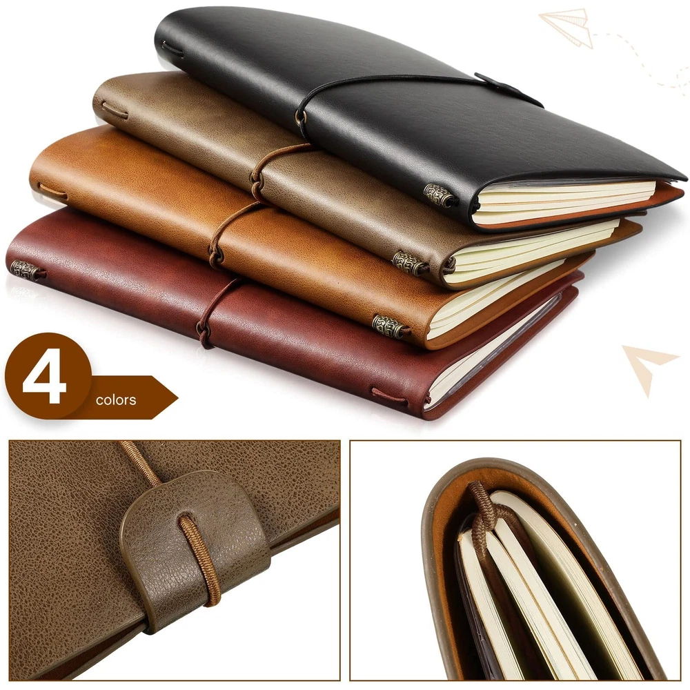 Sabary 8 Pack Vintage Travel Notebooks PU Leather Lined Journals Retro Refillable Travelers Writing Notebook and Card Holders for Men Women, 4.72 x 7.87 Inch, 80 Sheets/ 160 Pages Product Details Brand: Sabary Color: black, brown, light brown, white coffee Theme: Book Sheet Size: A4 Pages: 160 Cover Material: Faux Leather Style: Portable,Vintage Ruling Type: Plain Special Feature: Soft cover Number of Items: 8 Manufacturer: Sabary Brand: Sabary Item Weight: 3.99 pounds Package Dimensions: 11.14 x 8.35 x 3.19 inches Item model number: Sabary-Travel Notebooks-26 Color: black, brown, light brown, white coffee Cover Material: Faux Leather Number of Items: 8 Ruling: Plain Sheet Size: A4 Manufacturer Part Number: Sabary-Travel Notebooks-26 Date First Available: March 3, 2023 Package Includes: you will get 8 pieces of travel journal notebooks, each with 80 sheets, sufficient quantity can meet your different writing requirements; Come in 4 different colors, including black, brown, light brown, white coffee, you can choose the one according to the mood of the day Portable Size: the size of the vintage travel notebook is about 20 x 12 cm/ 4.72 x 7.87 inches, portable but provides enough space to write your notes; You can put them in your pocket or backpack, and record the unforgettable memories of your journey anytime and anywhere Reliable Material: the cover of refillable journals are made of quality PU leather material, which can protect the inside from chamfer or scratch; The inner pages are smooth and soft, which can help your writing more smoothly, bring you a comfortable writing experience Refillable Insert: these small travel journal notepads are designed with the elastic band around the outside, it will make the cover and inner page better connected together; Comes with a 3 grid card holders and PVC zipper pocket, so you can put your business card, photo or other small things inside, they are useful and interesting Considerate Gifts: these retro leather notebooks are helpers in your journey and life; You can use them to record your travel notes, write thoughts, draw manuscripts or plan your schedule; Or treat as a considerate gift to your family, colleagues, friends, to show your love and improving your relations