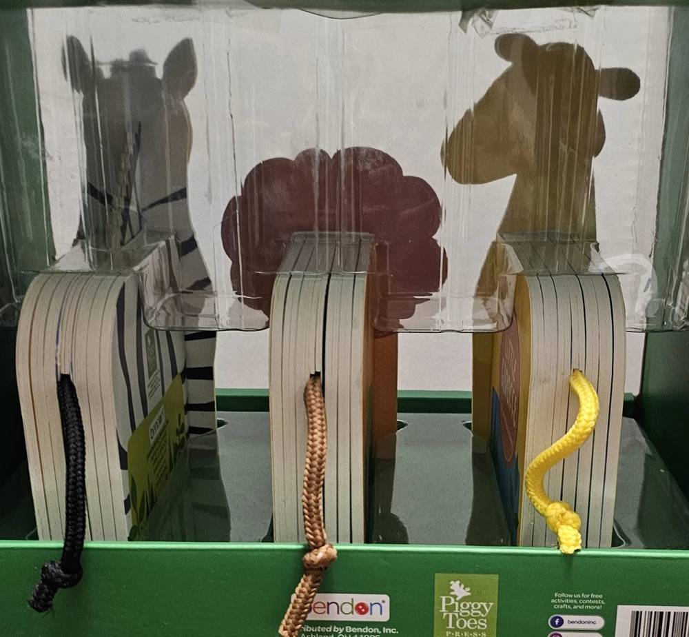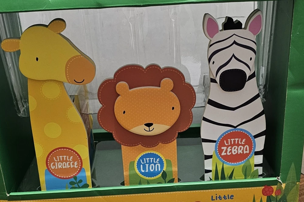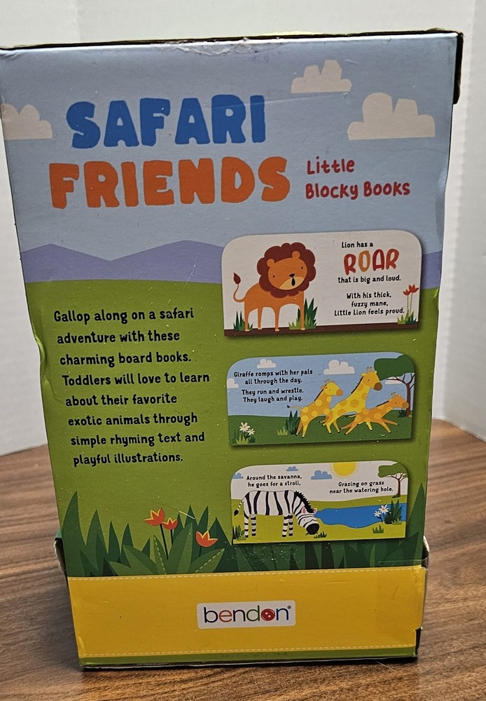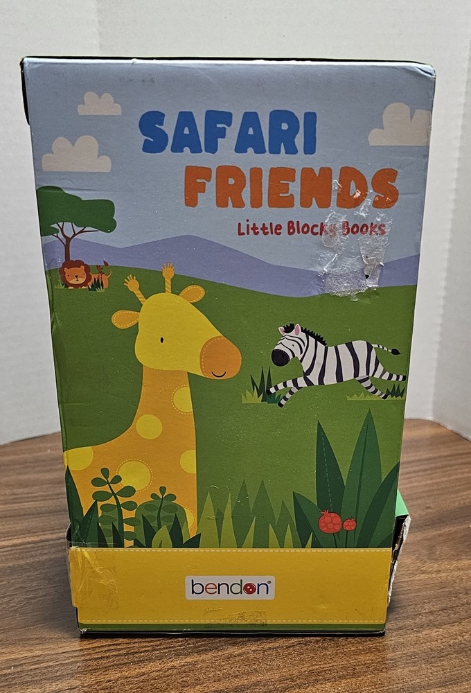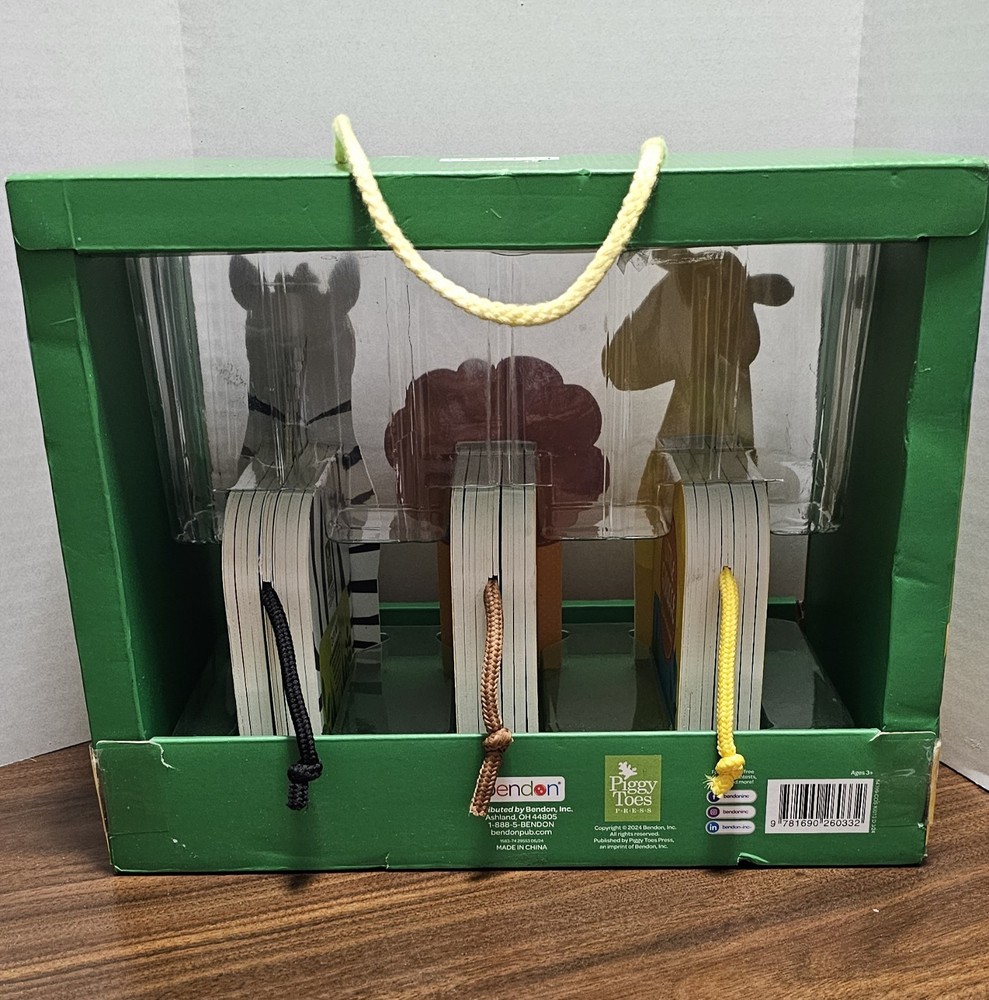 This book set is adorable! Features a Gariffe, Lion, & Zebra. All have face fronts & cute tails coming from the backs. Has soft carrying handle. New but box does have a little damage that has been taped. Does not affect product. Shown in last pic. Price reflects box condition.
