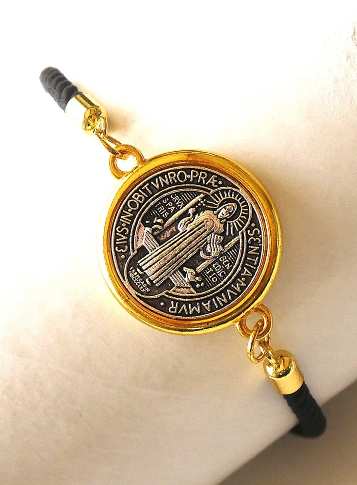 Black Cord Bracelet with Saint Benedict Gold / Silver Tone Medal (1) piece included with this listing. The bracelet has a St Benedict silver / gold tone medal on a black cord. LENGTH: Adjusts wrists up to 7-1/2" MEDAL: 3/4" diameter The Saint Benedict Medal is a Christian sacramental medal containing symbols and text related to the life of Saint Benedict of Nursia, used by Roman Catholics, as well as Anglicans, Lutherans, Methodists and the Western Orthodox, in the Benedictine Christian tradition. The medal is one of the oldest and most honored medals used by Christians and due to the belief in its power against evil is also known as the "devil-chasing medal". As early as the 11th century, it may have initially had the form of Saint Benedict's cross, and was used by Pope Leo IX. In widespread use after its formal approval by Pope Benedict XIV in the 18th century, the medal is used by Roman Catholics to ward off spiritual and physical dangers, especially those related to evil, poison, and temptation. A Timeless Gift ~ Perfect for any person! Come Visit Us at Our New Store! Please feel free to email me with questions that you may have. Also please check my other listings. I am always available to answer your questions promptly