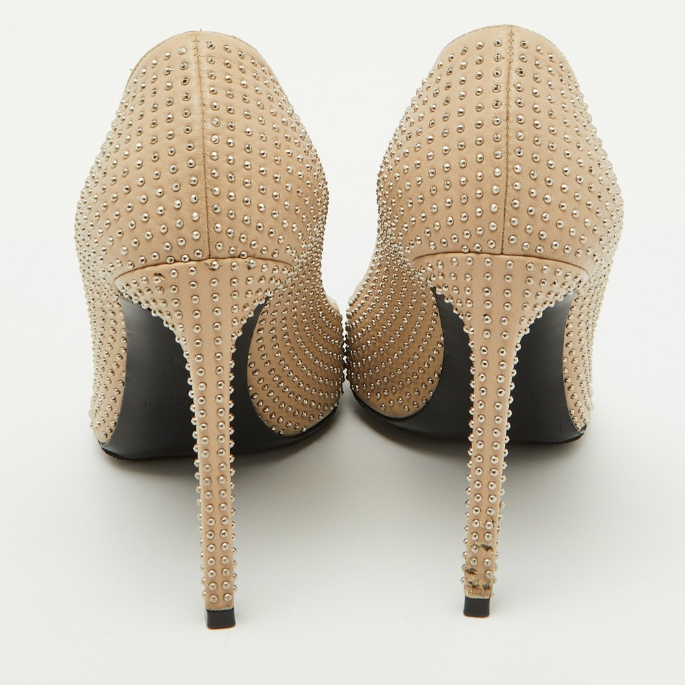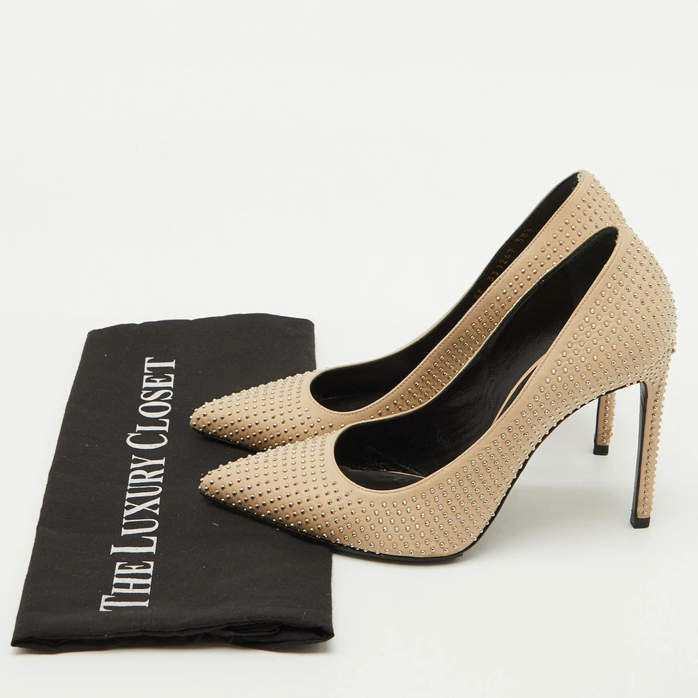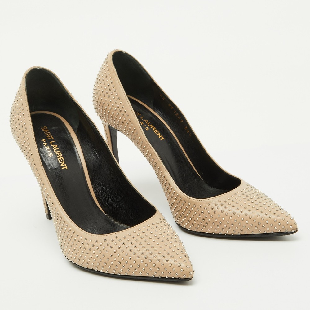 A blend of edgy and elegant, these Saint Laurent pumps are crafted from smooth beige leather with striking studded details on the heels. The pointed toe and sharp silhouette add a modern, sophisticated touch.Certified by The Luxury Closet - This item has gone through a detailed authentication process overseen by our experts. We offer a lifetime guarantee of authenticity on all our items. Import duties, taxes and charges are not included in the item price. These charges are the buyers responsibility. Please check with your country’s customs office to determine what these additional cost will be prior to buying. Our eBay Store About Us Contact Us Add to Favorite Sellers Saint Laurent Beige Leather Studded Pointed Toe Pumps Size 38.5 $283.8 A blend of edgy and elegant, these Saint Laurent pumps are crafted from smooth beige leather with striking studded details on the heels. The pointed toe and sharp silhouette add a modern, sophisticated touch. Product Details Brand Color Beige Dimensions Material Leather Size 38.5 Outsole Width 8 cm Outsole Length 25 cm Heel Height 11 cm Includes The Luxury Closet Packaging Certified by The Luxury Closet This item has gone through a detailed authentication process overseen by our experts. We offer a lifetime guarantee of authenticity on all our items. How We Check The in-house team of experts at The Luxury Closet is highly trained to verify the authenticity and the condition of the luxury products. They ensure that only 100% authentic items are put on sale.The evaluation process is unique with its own mix of assessment criteria and differs according to the category. Each item is evaluated based on the following combination of hallmarks, hardware, stitching, symmetry, material, craftsmanship, stamping, codes, hologram stickers, and packaging. Our authenticators also check if the items have been modified or amended (e.g., aftermarket diamonds, replaced batteries, repaired bags, etc.) International Buyers Import duties, taxes and charges are not included in the item price. These charges are the buyers responsibility. Please check with your country’s customs office to determine what these additional cost will be prior to buying.