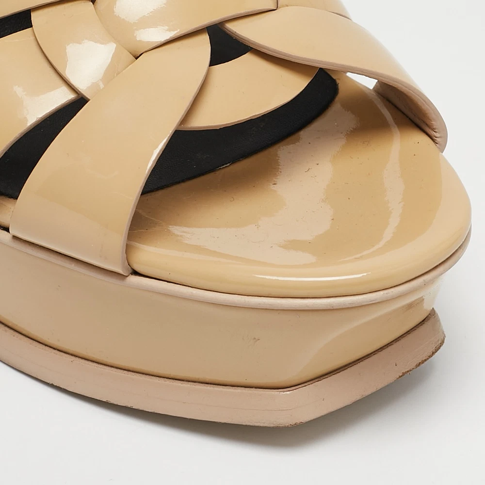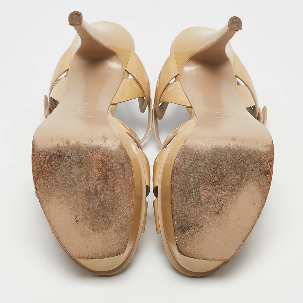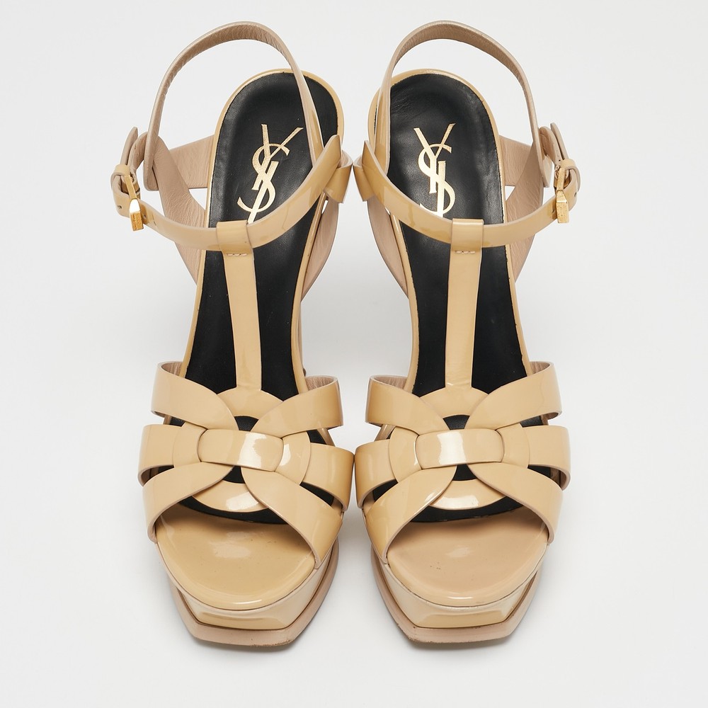 Designed with Saint Laurent’s signature intertwined straps, these Tribute sandals in beige patent leather offer a timelessly chic aesthetic. The sturdy platform balances the high heel for all day comfort.Certified by The Luxury Closet - This item has gone through a detailed authentication process overseen by our experts. We offer a lifetime guarantee of authenticity on all our items. Import duties, taxes and charges are not included in the item price. These charges are the buyers responsibility. Please check with your country’s customs office to determine what these additional cost will be prior to buying. Our eBay Store About Us Contact Us Add to Favorite Sellers Saint Laurent Beige Patent Leather Tribute Platform Sandals Size 38.5 $249.7 Designed with Saint Laurent’s signature intertwined straps, these Tribute sandals in beige patent leather offer a timelessly chic aesthetic. The sturdy platform balances the high heel for all day comfort. Product Details Brand Color Beige Dimensions Material Patent Leather Size 38.5 Outsole Width 7 cm Outsole Length 23 cm Heel Height 13.5 cm Includes The Luxury Closet Packaging Certified by The Luxury Closet This item has gone through a detailed authentication process overseen by our experts. We offer a lifetime guarantee of authenticity on all our items. How We Check The in-house team of experts at The Luxury Closet is highly trained to verify the authenticity and the condition of the luxury products. They ensure that only 100% authentic items are put on sale.The evaluation process is unique with its own mix of assessment criteria and differs according to the category. Each item is evaluated based on the following combination of hallmarks, hardware, stitching, symmetry, material, craftsmanship, stamping, codes, hologram stickers, and packaging. Our authenticators also check if the items have been modified or amended (e.g., aftermarket diamonds, replaced batteries, repaired bags, etc.) International Buyers Import duties, taxes and charges are not included in the item price. These charges are the buyers responsibility. Please check with your country’s customs office to determine what these additional cost will be prior to buying.