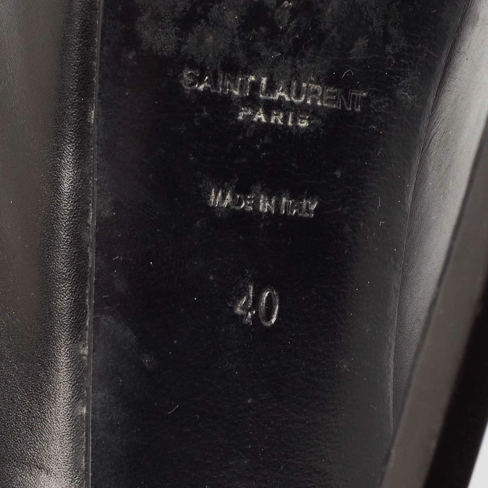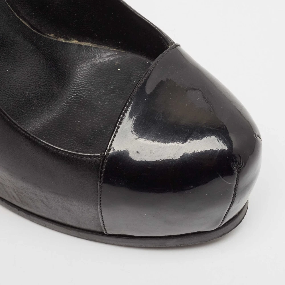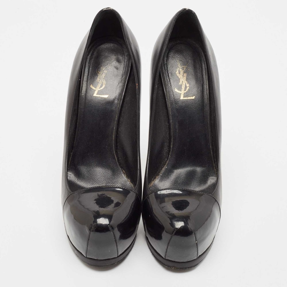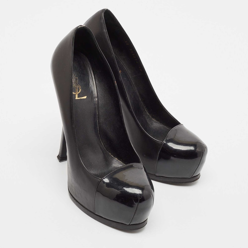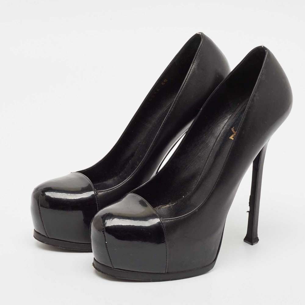 Saint Laurent’s Tribtoo pumps combine smooth black leather with a glossy patent cap toe. The hidden platform and sculpted heel create an ultra sleek silhouette with a bold lift.Certified by The Luxury Closet - This item has gone through a detailed authentication process overseen by our experts. We offer a lifetime guarantee of authenticity on all our items. Import duties, taxes and charges are not included in the item price. These charges are the buyers responsibility. Please check with your country’s customs office to determine what these additional cost will be prior to buying. Our eBay Store About Us Contact Us Add to Favorite Sellers Saint Laurent Black Leather and Patent Leather Tribtoo Platform Pumps Size 40 $162.8 Saint Laurent’s Tribtoo pumps combine smooth black leather with a glossy patent cap toe. The hidden platform and sculpted heel create an ultra sleek silhouette with a bold lift. Product Details Brand Color Black Dimensions Material Leather, Patent Leather Size 100 Outsole Width 7 cm Outsole Length 24 cm Heel Height 15 cm Includes The Luxury Closet Packaging Certified by The Luxury Closet This item has gone through a detailed authentication process overseen by our experts. We offer a lifetime guarantee of authenticity on all our items. How We Check The in-house team of experts at The Luxury Closet is highly trained to verify the authenticity and the condition of the luxury products. They ensure that only 100% authentic items are put on sale.The evaluation process is unique with its own mix of assessment criteria and differs according to the category. Each item is evaluated based on the following combination of hallmarks, hardware, stitching, symmetry, material, craftsmanship, stamping, codes, hologram stickers, and packaging. Our authenticators also check if the items have been modified or amended (e.g., aftermarket diamonds, replaced batteries, repaired bags, etc.) International Buyers Import duties, taxes and charges are not included in the item price. These charges are the buyers responsibility. Please check with your country’s customs office to determine what these additional cost will be prior to buying.