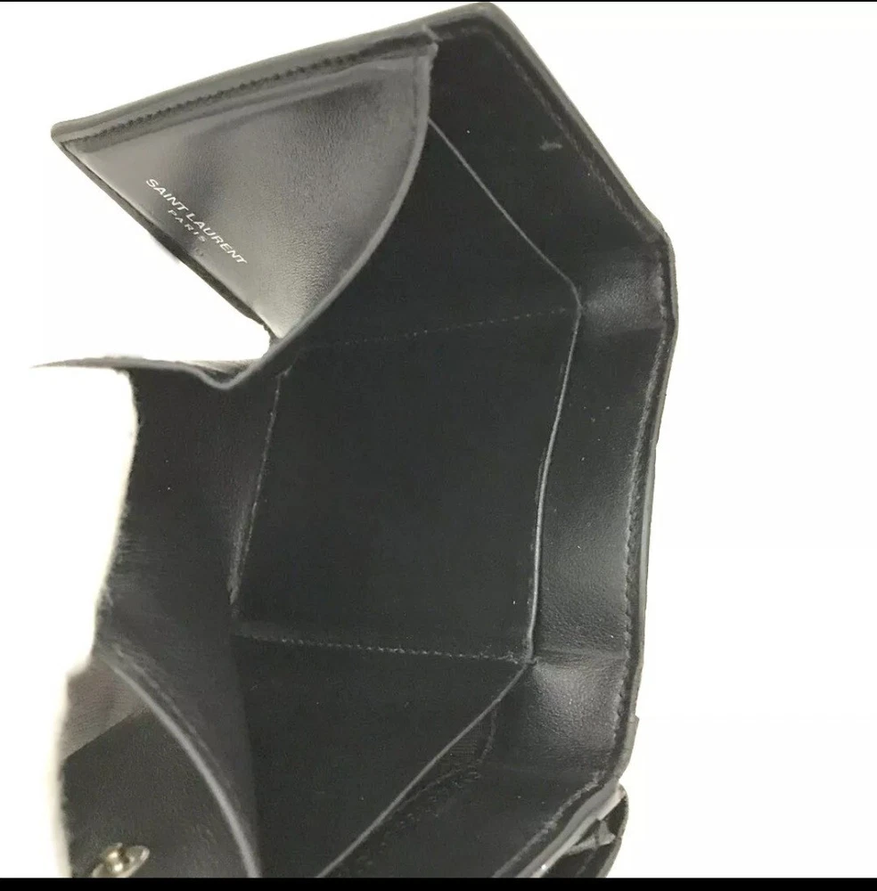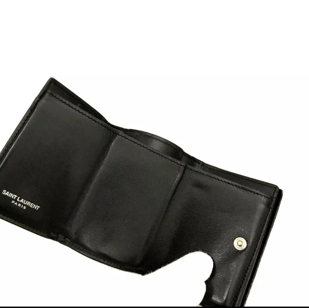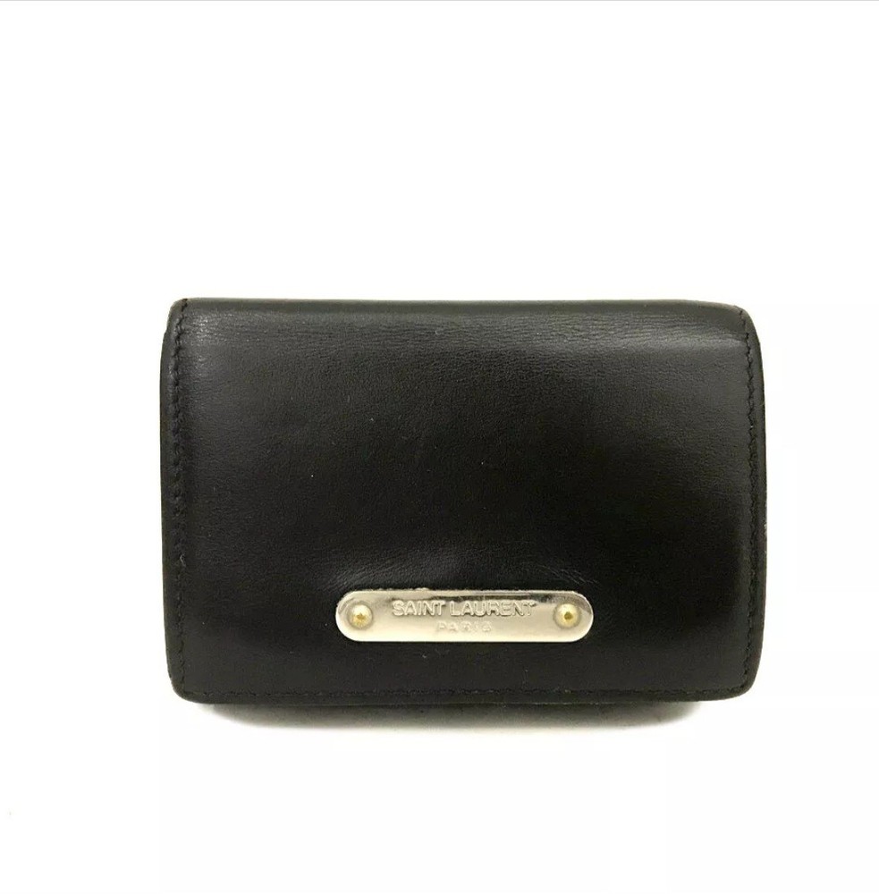 This is a Saint Laurent Women's Trifold Leather Wallet in a sleek black color. Made of leather, this wallet features a folding design and is one size, measuring 4.0 inches in width, 3.0 inches in height, and 1.0 inch in depth. It is designed for women and comes from the brand Saint Laurent. The wallet does not have any personalization options and is not handmade. It is a stylish accessory for keeping your essentials organized with a classic and timeless design.