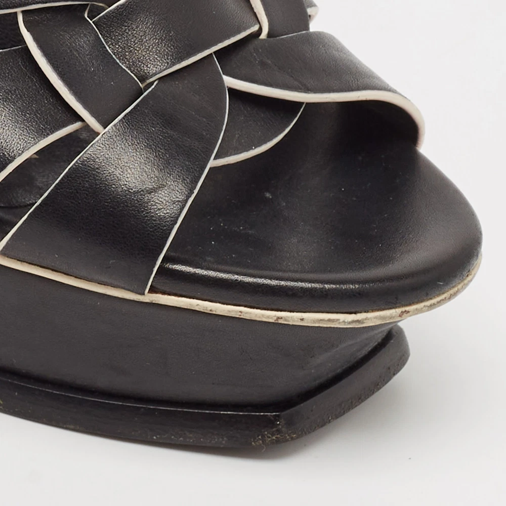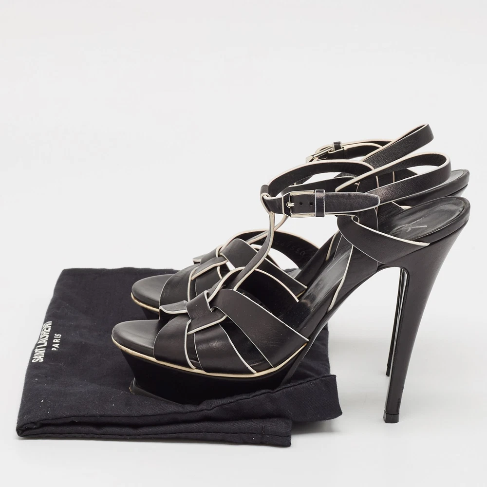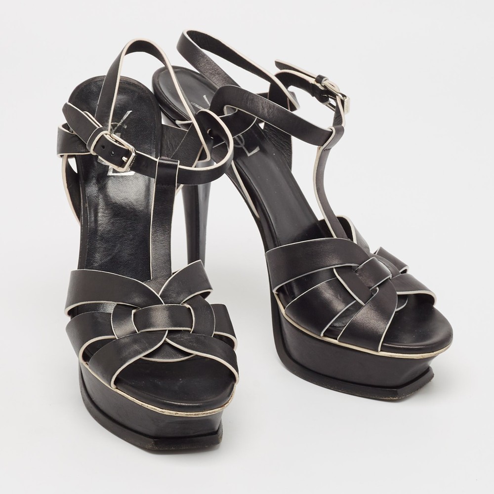 Indulge in timeless elegance with these exquisite black and white ankle strap sandals, a testament to Saint Laurents unparalleled craftsmanship. Luxurious leather exterior and precise Italian artistry promise both style and durability. The sleek patent and leather insole add an extra layer of sophistication, while the sturdy leather sole ensures comfort with every step. Featuring a chic buckle closure and a subtle platform, these sandals are perfect for the fashion forward woman who demands exclusivity in every stride.Certified by The Luxury Closet - This item has gone through a detailed authentication process overseen by our experts. We offer a lifetime guarantee of authenticity on all our items. Import duties, taxes and charges are not included in the item price. These charges are the buyers responsibility. Please check with your country’s customs office to determine what these additional cost will be prior to buying. Our eBay Store About Us Contact Us Add to Favorite Sellers Saint Laurent Black/White Leather Tribute Ankle Strap Sandals Size 37.5 $243.1 Indulge in timeless elegance with these exquisite black and white ankle strap sandals, a testament to Saint Laurents unparalleled craftsmanship. Luxurious leather exterior and precise Italian artistry promise both style and durability. The sleek patent and leather insole add an extra layer of sophistication, while the sturdy leather sole ensures comfort with every step. Featuring a chic buckle closure and a subtle platform, these sandals are perfect for the fashion forward woman who demands exclusivity in every stride. Product Details Brand Color Black Dimensions Material Leather Size 37.5 Outsole Width 7 cm Outsole Length 21 cm Heel Height 14.5 cm Includes Original Dustbag Certified by The Luxury Closet This item has gone through a detailed authentication process overseen by our experts. We offer a lifetime guarantee of authenticity on all our items. How We Check The in-house team of experts at The Luxury Closet is highly trained to verify the authenticity and the condition of the luxury products. They ensure that only 100% authentic items are put on sale.The evaluation process is unique with its own mix of assessment criteria and differs according to the category. Each item is evaluated based on the following combination of hallmarks, hardware, stitching, symmetry, material, craftsmanship, stamping, codes, hologram stickers, and packaging. Our authenticators also check if the items have been modified or amended (e.g., aftermarket diamonds, replaced batteries, repaired bags, etc.) International Buyers Import duties, taxes and charges are not included in the item price. These charges are the buyers responsibility. Please check with your country’s customs office to determine what these additional cost will be prior to buying.