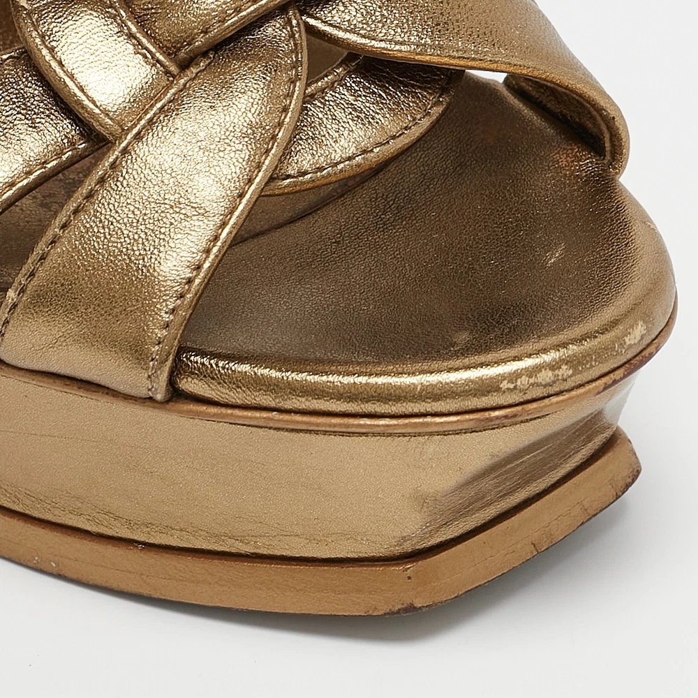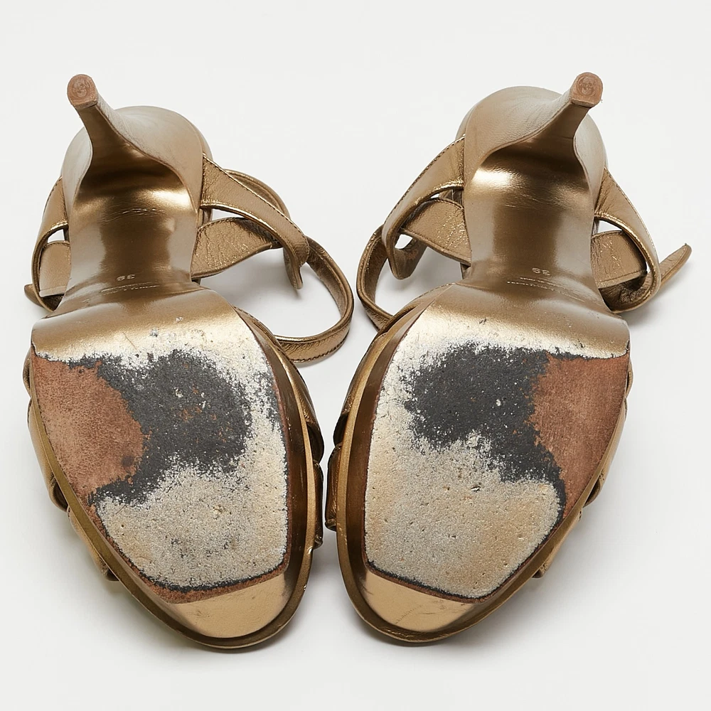 These sandals will frame your feet in an elegant manner. Crafted from quality materials, they flaunt a classy display, comfortable insoles and durable heels.Certified by The Luxury Closet - This item has gone through a detailed authentication process overseen by our experts. We offer a lifetime guarantee of authenticity on all our items. Import duties, taxes and charges are not included in the item price. These charges are the buyers responsibility. Please check with your country’s customs office to determine what these additional cost will be prior to buying. Our eBay Store About Us Contact Us Add to Favorite Sellers Saint Laurent Gold Leather Tribute Platform Sandals Size 39 $249.7 These sandals will frame your feet in an elegant manner. Crafted from quality materials, they flaunt a classy display, comfortable insoles and durable heels. Product Details Brand Color Gold Dimensions Material Leather Size 39 Outsole Width 7 cm Outsole Length 22.5 cm Heel Height 14 cm Includes The Luxury Closet Packaging Certified by The Luxury Closet This item has gone through a detailed authentication process overseen by our experts. We offer a lifetime guarantee of authenticity on all our items. How We Check The in-house team of experts at The Luxury Closet is highly trained to verify the authenticity and the condition of the luxury products. They ensure that only 100% authentic items are put on sale.The evaluation process is unique with its own mix of assessment criteria and differs according to the category. Each item is evaluated based on the following combination of hallmarks, hardware, stitching, symmetry, material, craftsmanship, stamping, codes, hologram stickers, and packaging. Our authenticators also check if the items have been modified or amended (e.g., aftermarket diamonds, replaced batteries, repaired bags, etc.) International Buyers Import duties, taxes and charges are not included in the item price. These charges are the buyers responsibility. Please check with your country’s customs office to determine what these additional cost will be prior to buying.