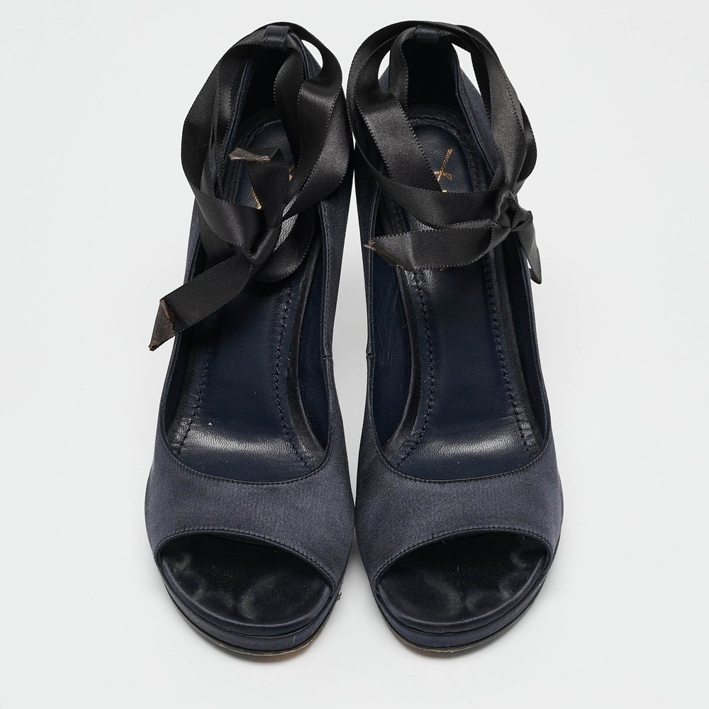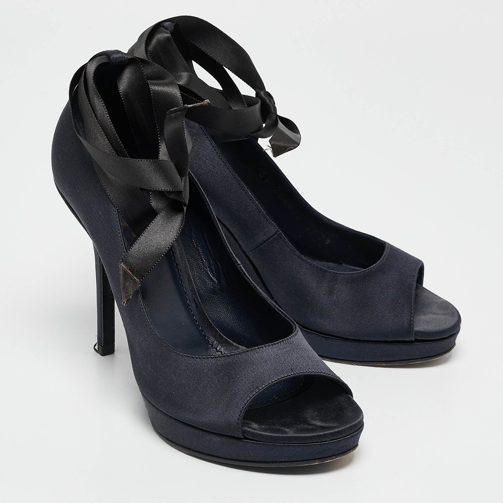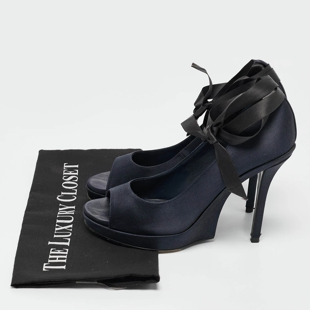 Curvaceous arches, a feminine appeal, and a well built structure define this set of Saint Laurent pumps. Coming with comfortable insoles and sleek heels, style them with your favorite outfits.Certified by The Luxury Closet - This item has gone through a detailed authentication process overseen by our experts. We offer a lifetime guarantee of authenticity on all our items. Import duties, taxes and charges are not included in the item price. These charges are the buyers responsibility. Please check with your country’s customs office to determine what these additional cost will be prior to buying. Our eBay Store About Us Contact Us Add to Favorite Sellers Saint Laurent Navy Blue Satin Open Toe Ankle Wrap Platform Pumps Size 37 $201.3 Curvaceous arches, a feminine appeal, and a well built structure define this set of Saint Laurent pumps. Coming with comfortable insoles and sleek heels, style them with your favorite outfits. Product Details Brand Color Navy Blue Dimensions Material Satin Size 37 Outsole Width 7 cm Outsole Length 23 cm Heel Height 11 cm Includes The Luxury Closet Packaging Certified by The Luxury Closet This item has gone through a detailed authentication process overseen by our experts. We offer a lifetime guarantee of authenticity on all our items. How We Check The in-house team of experts at The Luxury Closet is highly trained to verify the authenticity and the condition of the luxury products. They ensure that only 100% authentic items are put on sale.The evaluation process is unique with its own mix of assessment criteria and differs according to the category. Each item is evaluated based on the following combination of hallmarks, hardware, stitching, symmetry, material, craftsmanship, stamping, codes, hologram stickers, and packaging. Our authenticators also check if the items have been modified or amended (e.g., aftermarket diamonds, replaced batteries, repaired bags, etc.) International Buyers Import duties, taxes and charges are not included in the item price. These charges are the buyers responsibility. Please check with your country’s customs office to determine what these additional cost will be prior to buying.