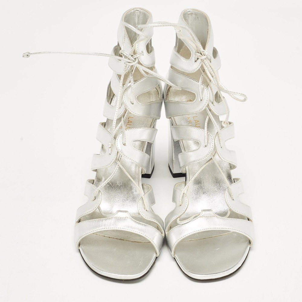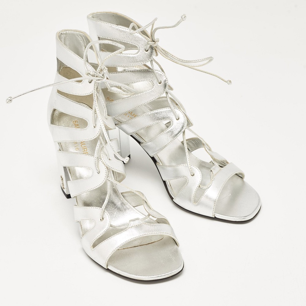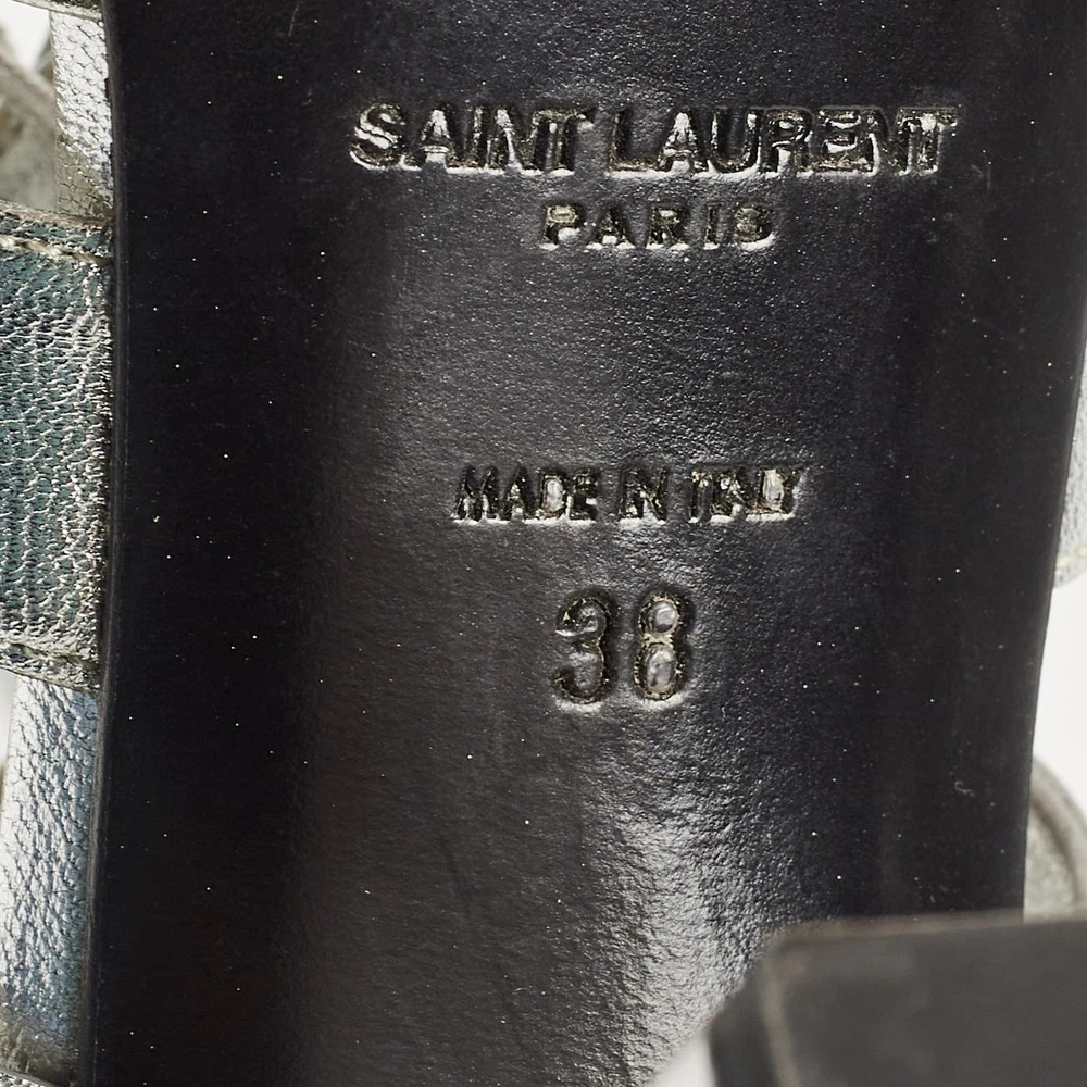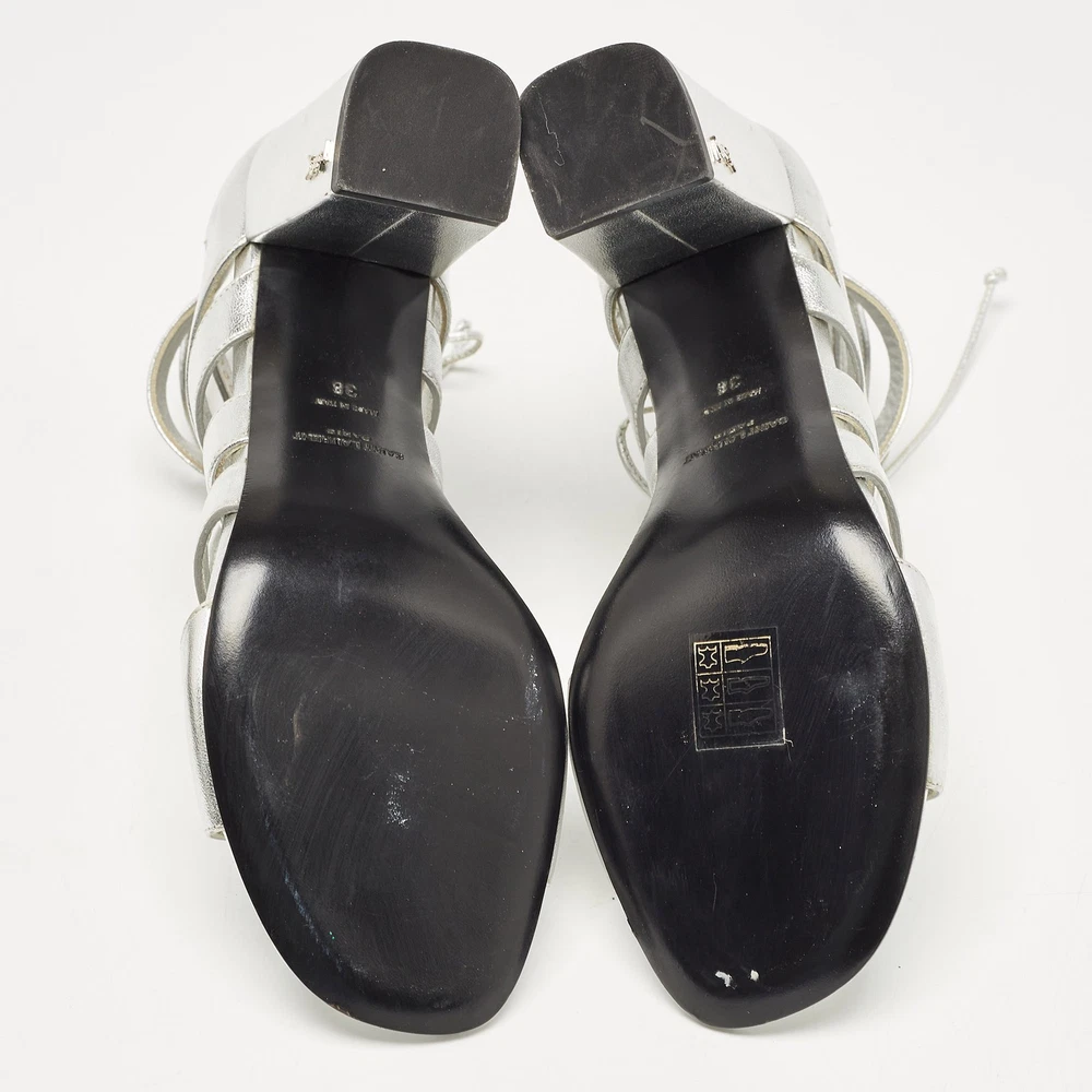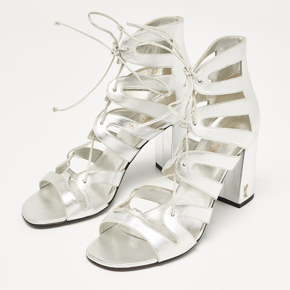 Shining in silver leather, these Saint Laurent Babes sandals feature a lace up design set on block heels. Ideal for those seeking a statement piece that seamlessly blends elegance and shine.Certified by The Luxury Closet - This item has gone through a detailed authentication process overseen by our experts. We offer a lifetime guarantee of authenticity on all our items. Import duties, taxes and charges are not included in the item price. These charges are the buyers responsibility. Please check with your country’s customs office to determine what these additional cost will be prior to buying. Our eBay Store About Us Contact Us Add to Favorite Sellers Saint Laurent Silver Leather Babes Lace Up Sandals Size 38 $589.6 Shining in silver leather, these Saint Laurent Babes sandals feature a lace up design set on block heels. Ideal for those seeking a statement piece that seamlessly blends elegance and shine. Product Details Brand Color Silver Dimensions Material Leather Size 38 Outsole Width 8.5 cm Outsole Length 23 cm Heel Height 9 cm Includes The Luxury Closet Packaging Certified by The Luxury Closet This item has gone through a detailed authentication process overseen by our experts. We offer a lifetime guarantee of authenticity on all our items. How We Check The in-house team of experts at The Luxury Closet is highly trained to verify the authenticity and the condition of the luxury products. They ensure that only 100% authentic items are put on sale.The evaluation process is unique with its own mix of assessment criteria and differs according to the category. Each item is evaluated based on the following combination of hallmarks, hardware, stitching, symmetry, material, craftsmanship, stamping, codes, hologram stickers, and packaging. Our authenticators also check if the items have been modified or amended (e.g., aftermarket diamonds, replaced batteries, repaired bags, etc.) International Buyers Import duties, taxes and charges are not included in the item price. These charges are the buyers responsibility. Please check with your country’s customs office to determine what these additional cost will be prior to buying.