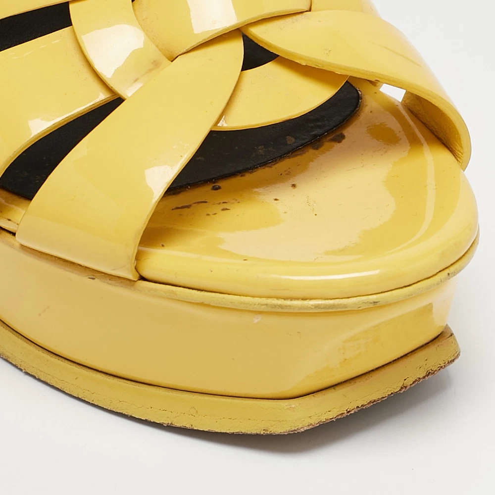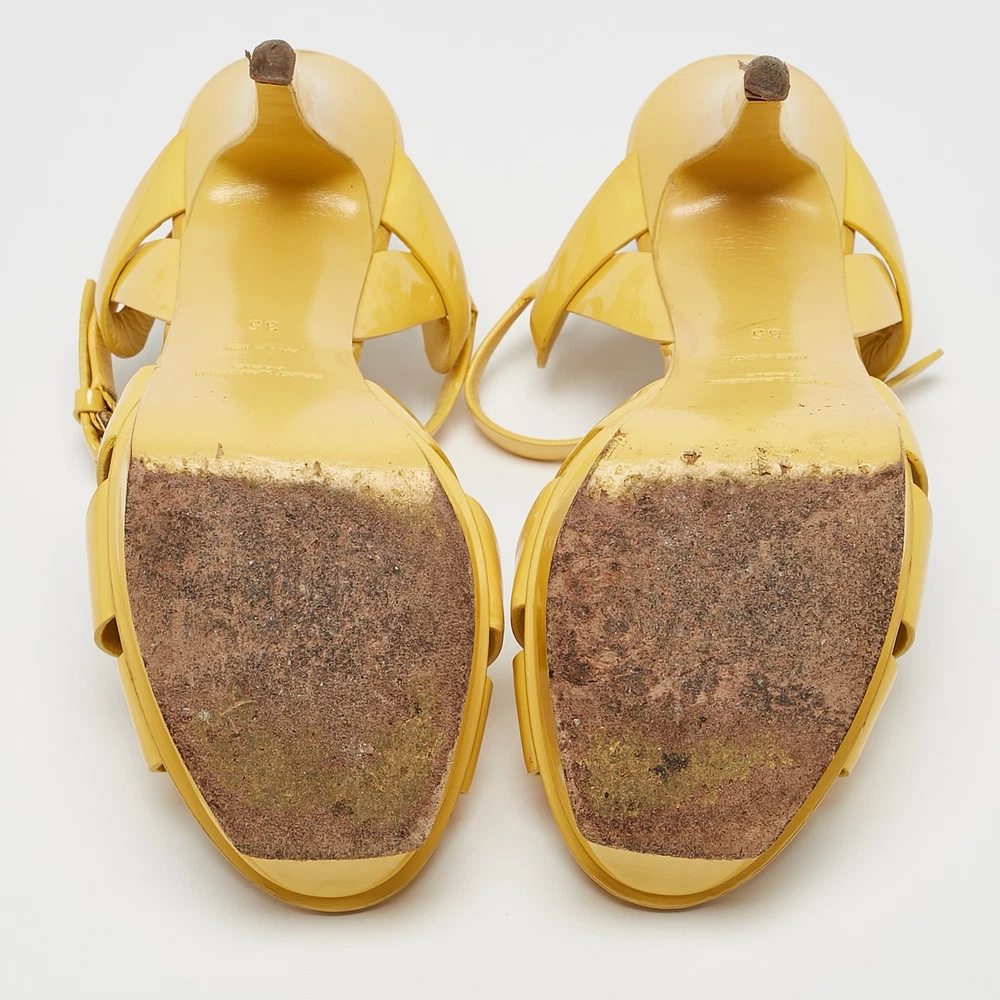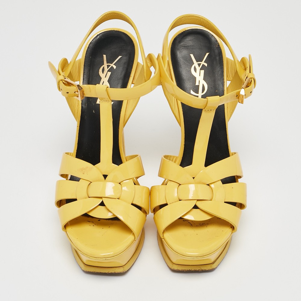 A vibrant take on a house icon, these Saint Laurent Tribute sandals in yellow patent leather feature intertwining straps, a towering platform, and a sky high heel for a statement finish.Certified by The Luxury Closet - This item has gone through a detailed authentication process overseen by our experts. We offer a lifetime guarantee of authenticity on all our items. Import duties, taxes and charges are not included in the item price. These charges are the buyers responsibility. Please check with your country’s customs office to determine what these additional cost will be prior to buying. Our eBay Store About Us Contact Us Add to Favorite Sellers Saint Laurent Yellow Patent Leather Tribute Platform Sandals Size 35 $139.7 A vibrant take on a house icon, these Saint Laurent Tribute sandals in yellow patent leather feature intertwining straps, a towering platform, and a sky high heel for a statement finish. Product Details Brand Color Yellow Dimensions Material Patent Leather Size 35 Outsole Width 6.5 cm Outsole Length 21 cm Heel Height 13 cm Includes The Luxury Closet Packaging Certified by The Luxury Closet This item has gone through a detailed authentication process overseen by our experts. We offer a lifetime guarantee of authenticity on all our items. How We Check The in-house team of experts at The Luxury Closet is highly trained to verify the authenticity and the condition of the luxury products. They ensure that only 100% authentic items are put on sale.The evaluation process is unique with its own mix of assessment criteria and differs according to the category. Each item is evaluated based on the following combination of hallmarks, hardware, stitching, symmetry, material, craftsmanship, stamping, codes, hologram stickers, and packaging. Our authenticators also check if the items have been modified or amended (e.g., aftermarket diamonds, replaced batteries, repaired bags, etc.) International Buyers Import duties, taxes and charges are not included in the item price. These charges are the buyers responsibility. Please check with your country’s customs office to determine what these additional cost will be prior to buying.