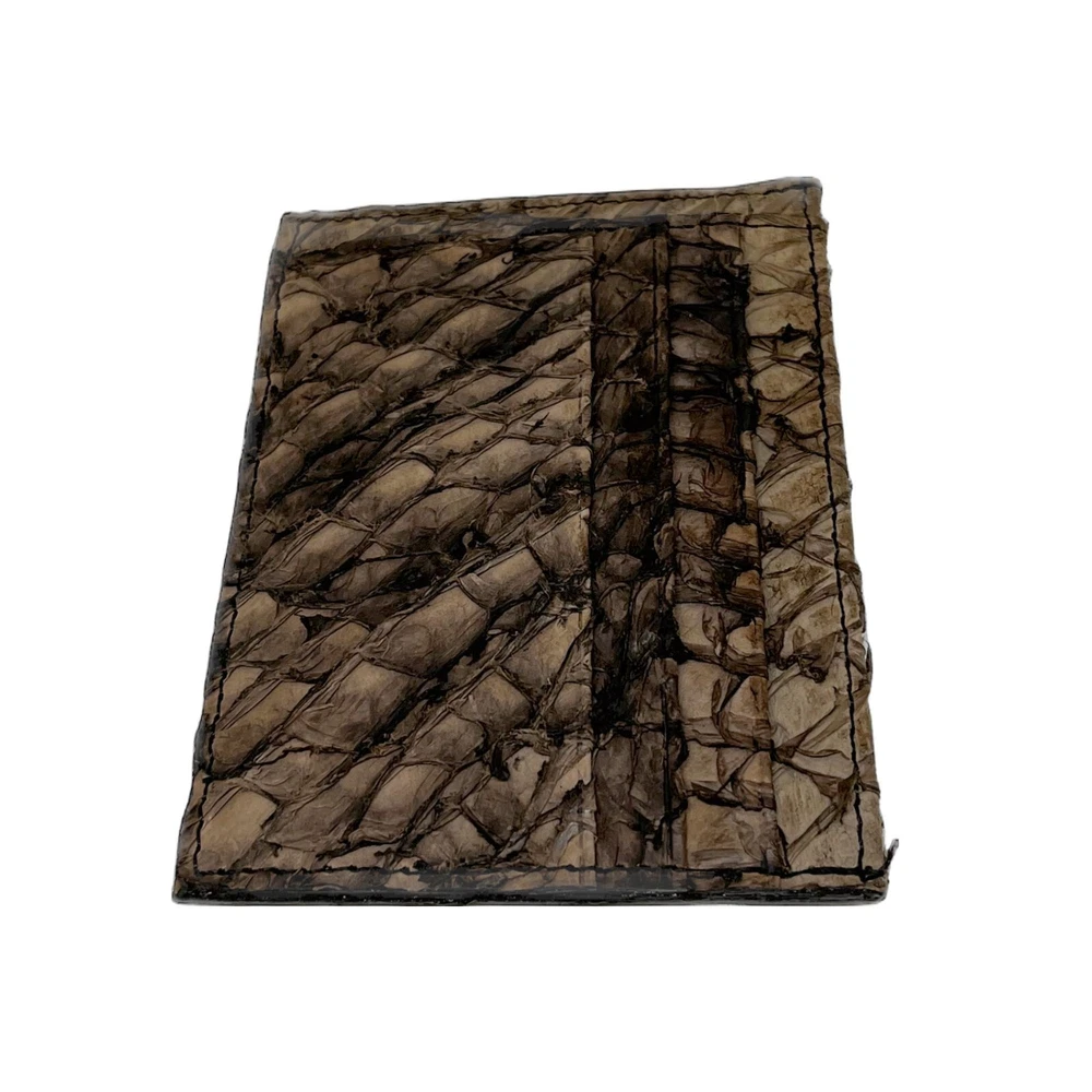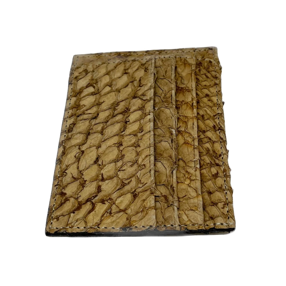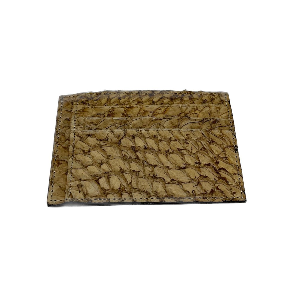 These are beautifully handcrafted credit card wallets that are made out of Salmon fish skin leather. They have six credit card slots, two side pockets, and a center top pocket. They measure 4.25" x 3". These are fair trade items from Peru.