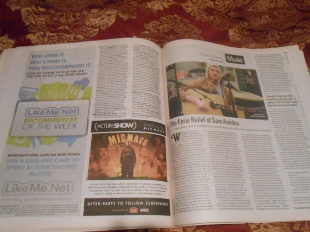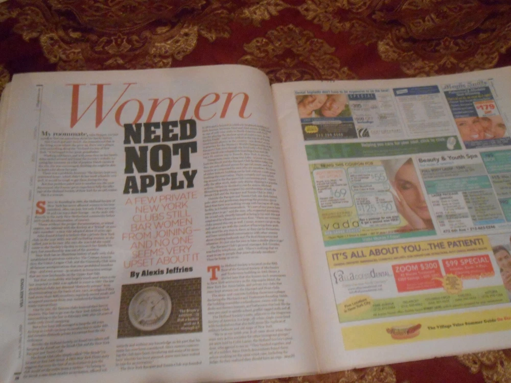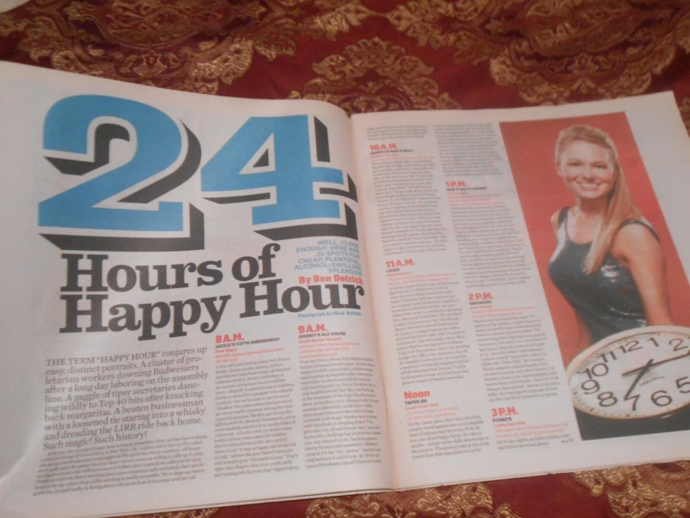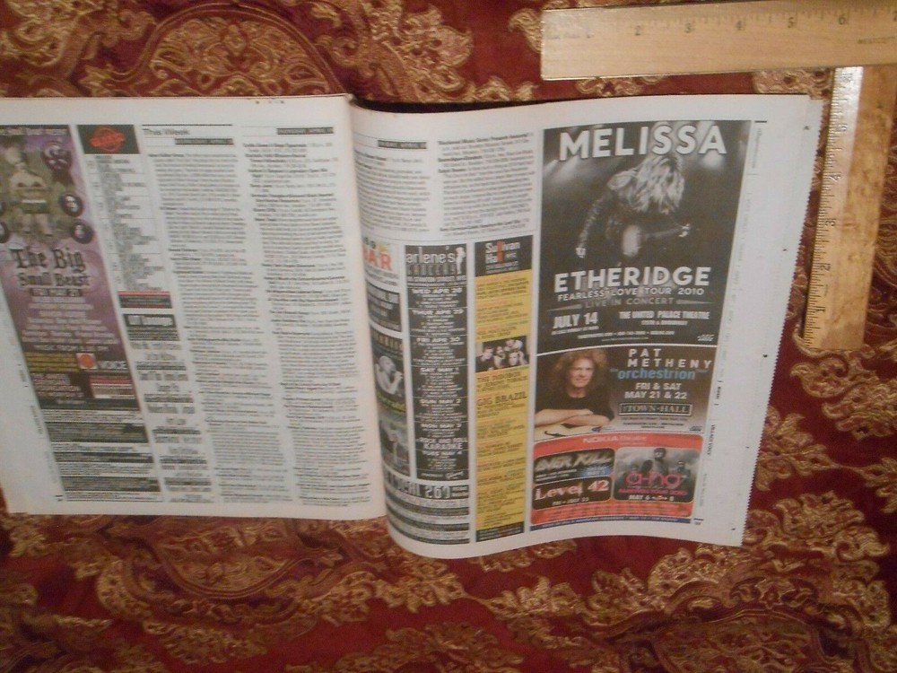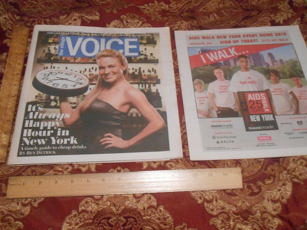 The Village Voice New York City Newspaper April 28-May 4, 2010 Issue VOL LV No. 17 Includes a 40 page insert for the AIDS Walk New York Event Guide 2010 Cover: Photo by Chad Griffith, as pictured Cover Headline: It's Always Happy Hour In New York A timely guide to cheap drinks...by Ben Detrick THE LAST BASTIONS: MALE-ONLY PRIVATE CLUBS by Alexis Jeffries CONTENTS: FEATURES: *24 Hours of Happy Hour...Well, close enough...20 spots for cheap, plentiful, alcohol swilling splendor. *Women Need Not Apply: A few private New York clubs still bar women from joining--and no one seems very upset about it....by Alexis Jeffries. UPFRONT: *VoiceBlogs A weekly roundup *Michael Musto: Battle Royal...Living high with Sondheim and Duchess Sarah Fergie Ferguson... Other heroes include Sean Hayes, Denzel, On the other hand, Kelsey Grammer... *Tom Robbins: Espada's enablers...The people who brought you Albany's greatest scoundrel...Pedro *Nat Hentoff Bloomberg flunks..The Education Mayor Called Out...Bloomberg has a serious setback on his way to closing schools. CULTURE: *Voice Choices: The guide to your week...Soul survivor Sharon Jones, Obey Bjork... *Theater: Fengold on AMERICAN IDIOT (Green Day musical), PROMISES PROMISES, and SONDHEIM on SONDHEIM. Soloski on CREDITORS at BAM directed by Alan Rickman. *Art: Robert Shuster's Best in Show...Dominic McGill: FuturePerfect...Joachim Koester: From the Secret Garden on Sleep... *Eats: Robert Sietsema walks on Talent Thai Kitchen in Murray Hill DiGregorio on Fatty 'Cue on 6th Street in Brooklyn. *Film/movie: Hoberman on Please Give and Anton Chekhov's The Duel, Hillis interview, Tom Six; Rap Ghost Bird and other bird movies Pinkerton on BAM's Joan Cesar Monteiro fest. *MUSIC: Harvilla on fold weirdo Sam Amidon Camille Dodero dives into Courtney Love's New Hole album...The return of 'HOLE' whether you like it or not, you little suck sh*ts... Brandon Soderberg on the dissolving underground rap crew Little Brother Larry Blumentfeld on Bobby Sanabria's Afro-Cuban big band, a fixture to Harlem Michael Hoinski on psych-rock legend Roky Erickson's latest. *Has 1/4 page advertisement, only, on one of the pages in the newspaper for: MELISSA ETHERIDGE FEARLESS LOVE TOUR JULY 15 The United Palace Theatre Rest of newspaper not on above topics, standard The Village Voice fare of the week... .............Voice Choices, Theater, Art, Eats, Film, Music, Some Adult Classifieds (massages, phone numbers...etc...) Classified... 80 pages, Has been stored in pet free, smoke free storage since it first came out here in the newsstands/boxes here on the lower east side of Manhattan, New York City Year 2010 No writing, no address labels, may have an advertisement sticker/glue residue on front or paper pages , see pics Just downgrading for collector purposes if any yellowing from age, creasing, tears, scuff marks, loose pages, from storage but is basically brand new and never read other than pics and description for this listing, no writing, no labels. Ships flat, will not fold As Is, Final Sale. Good Luck In Bidding! Thanks and ENJOY!