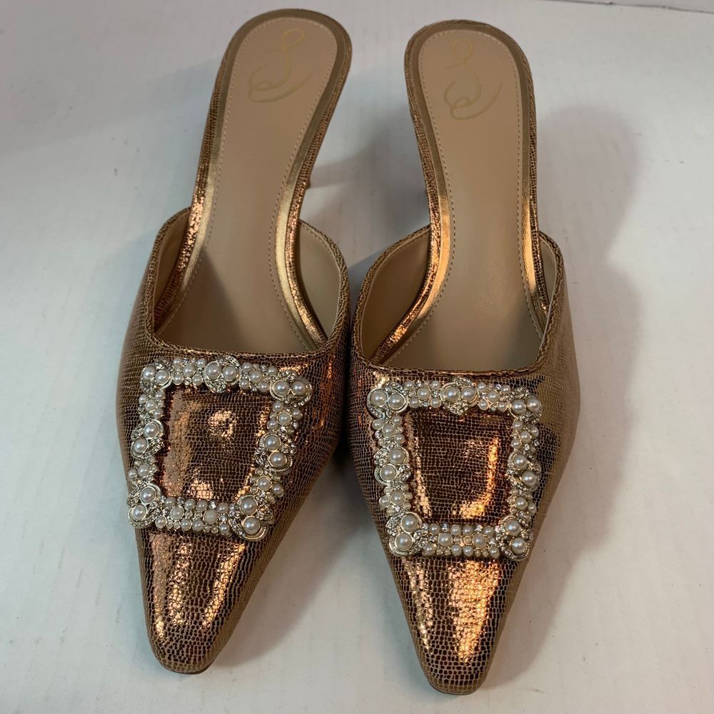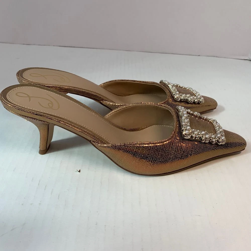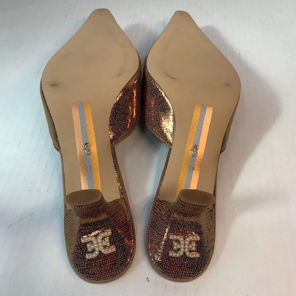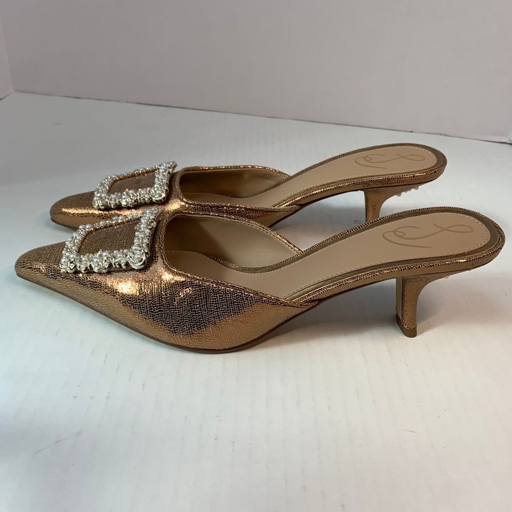 Sam Edelman Brit Luster Mules Kitten Heel in Deep Gold with Metallic Pearl Accent Size 9.5