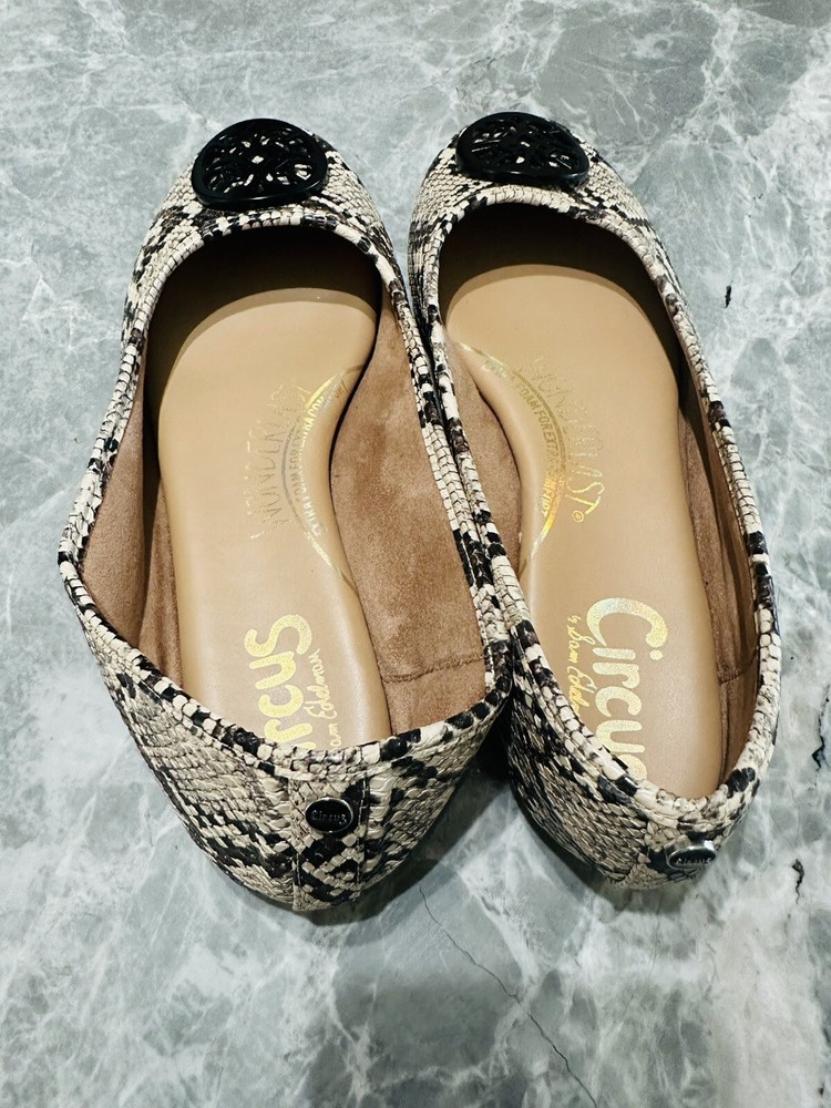 The Circus by Sam Edelman Colleen Snake Print Skimmer Ballet Flats are a pair of women's shoes that feature a snake print pattern, a round toe shape, and a slip-on closure. They are made of synthetic upper and lining material, and have a rubber outsole. The flats are designed with a bow, sequin, and logo accents, and have a medallion on the toe. They are lightweight, cushioned, and have a memory foam insole. The flats are breathable and padded, making them comfortable for travel, casual, and business occasions.