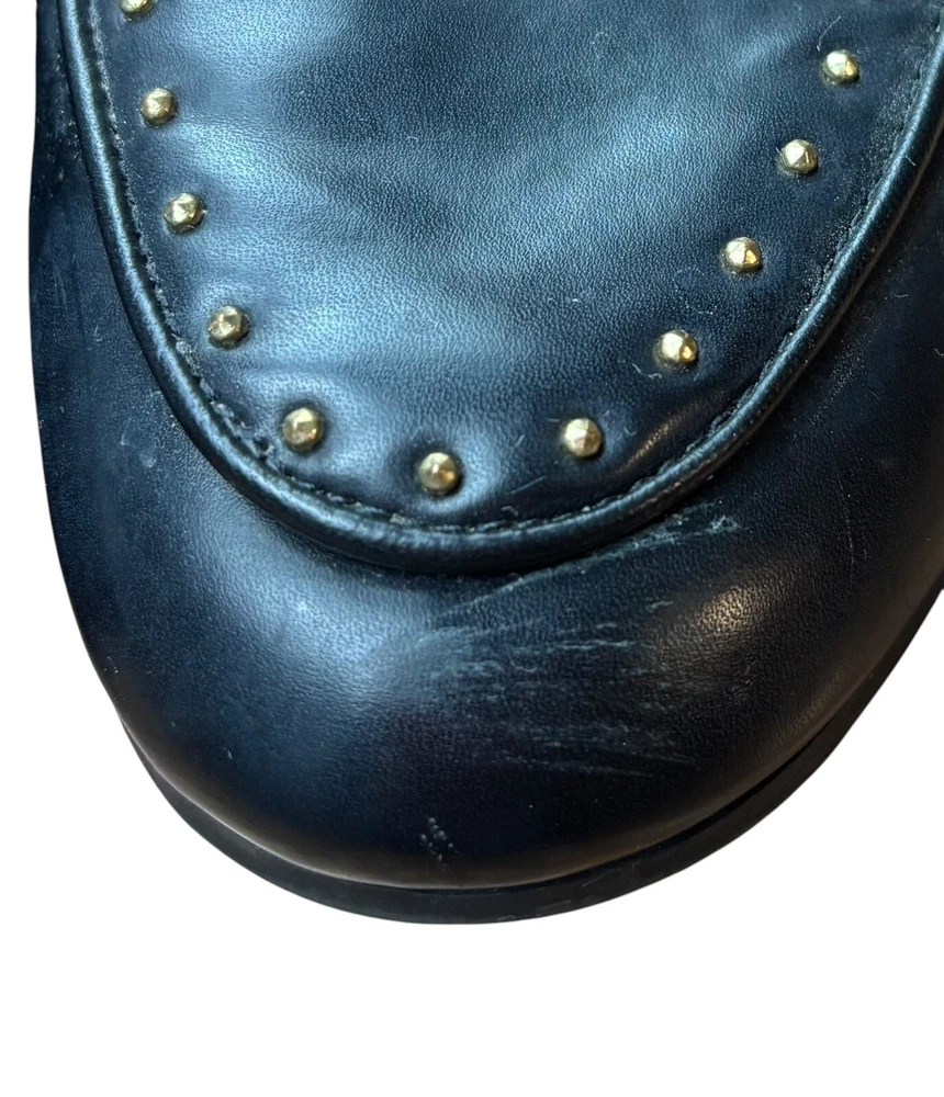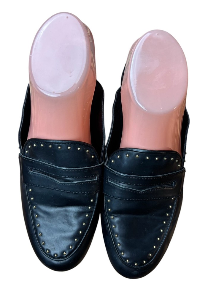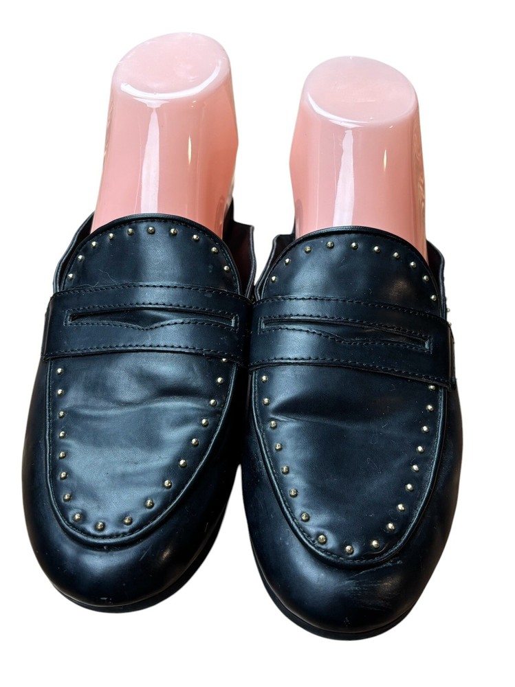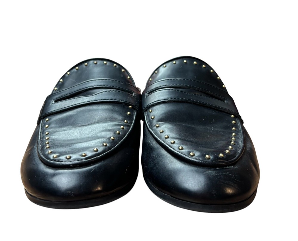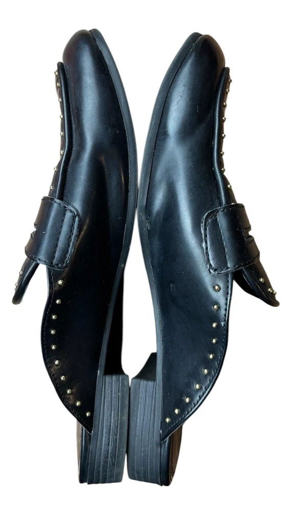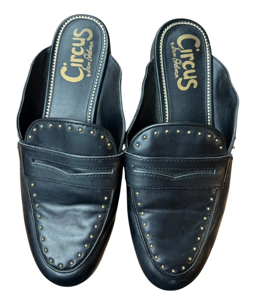 Circus by Sam Edelman Women's Hanlon Mule is a stylish and versatile loafer in a sleek black color, featuring studded accents for a touch of edgy flair. These slip-on flats are designed for comfort, with a synthetic lining and insole, and a rubber outsole for durability. Perfect for casual or business occasions, they are crafted from faux leather and come in a US shoe size 7 (EU size 37). Ideal for summer, fall, and spring seasons, these loafers offer a chic and practical footwear option for women.