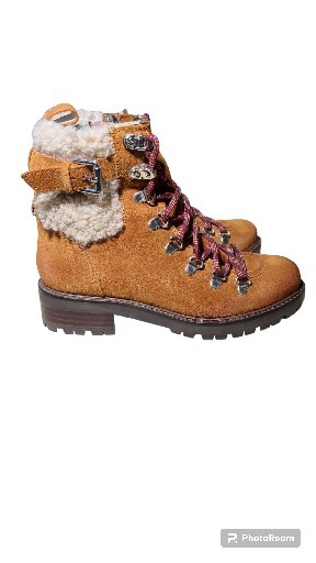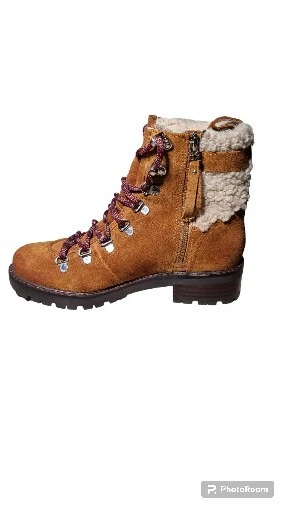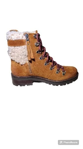 Step out in style with these women's brown suede Tenlee hiker boots from Sam Edelman. The round toe and lace-up closure ensure a comfortable fit, while the shearling fabric type and fur trim accents add a touch of luxury. Ideal for various occasions including activewear, party/cocktail, casual, and workwear, these boots are perfect for the fashion-forward woman who loves to mix style and functionality. The waterproof features of these boots make them perfect for outdoor activities, and the ankle-length shaft style ensures that they can be paired with a variety of outfits. The rubber outsole material provides excellent grip and durability, while the fabric lining material and insole material guarantee comfort and a snug fit. These boots are a must-have for any wardrobe, and they are sure to make a statement wherever you go.