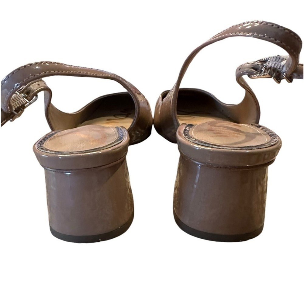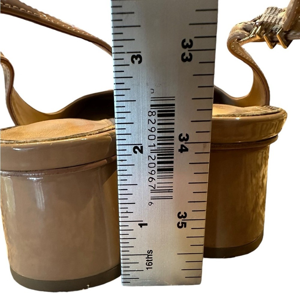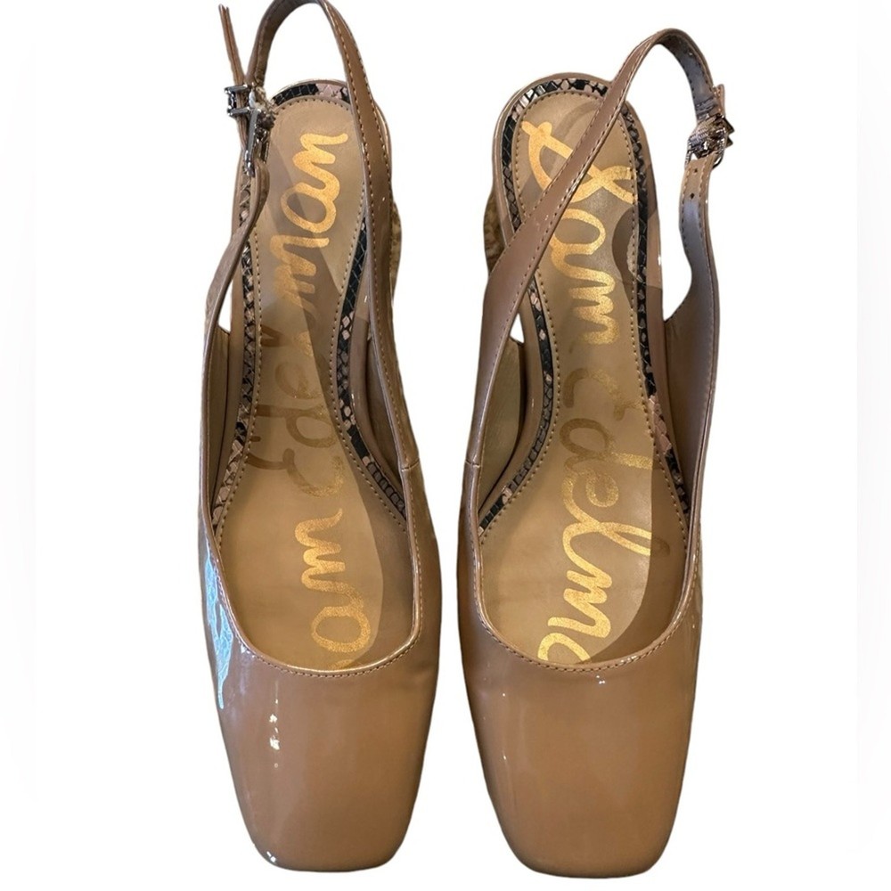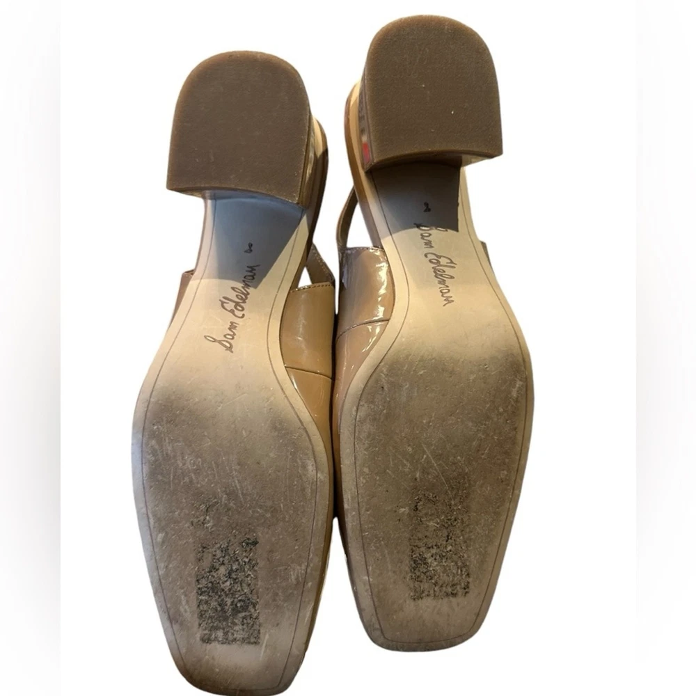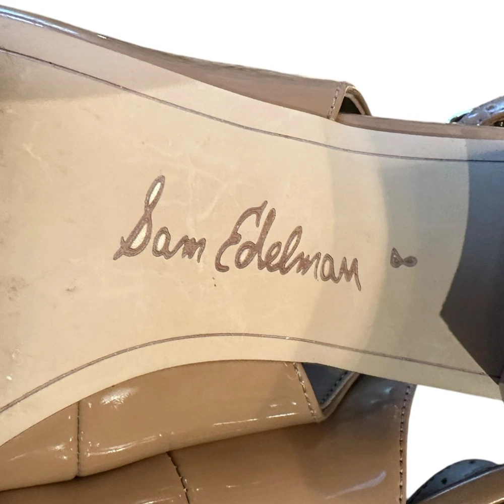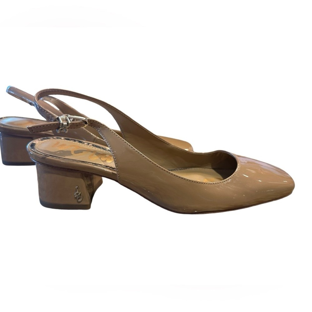 This is a gorgeous pair of chunky heel pumps by Sam Edelman. Women size 8 nude tone patent pumps are excellent gently used condition.
