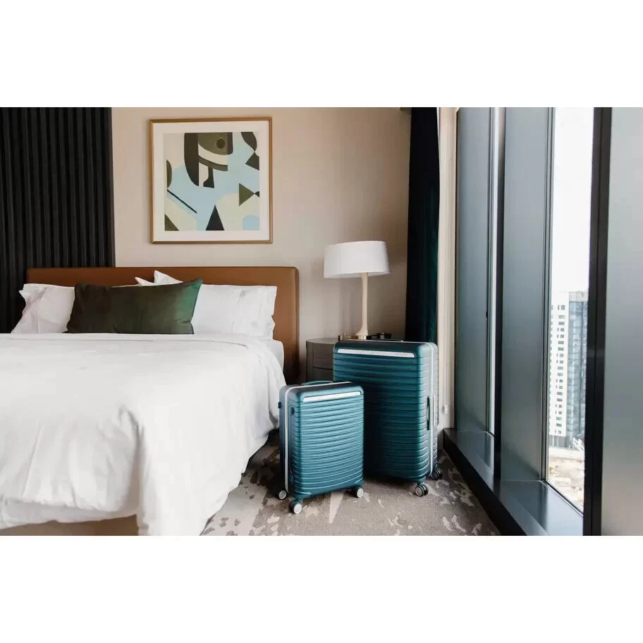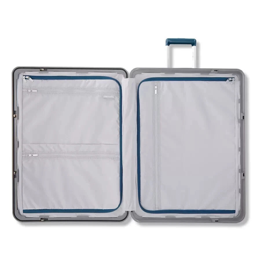 Step out with a sophisticated design, modern functionality, and lightweight zipper-less constructed case, your Framelock Max unlocks the unconventional luggage the industry is accustomed to seeing. Innovative and durable frame construction offers a highly secure Eazylock™ mechanism, simply controlled by one centralized slide puller, for locking and unlocking. The RightHeight™ handle system is accompanied by a TPR handle grip, 360° spinner wheels, two interior zipper dividers made with Recyclex®, the Framelock Max collection is your ultimate travel partner maximizing your packing capacity and security. Exterior Features: Sophisticated polycarbonate shell design with an eye-catching logo plate Lightweight and integrated zipper-less frame construction with multi-point locking engagement Innovative centralized slide puller for seamless locking and unlocking mechanism with keyless TSA approved security 360° dual spinner wheels for effortless maneuverability on any surface RightHeight™ handle system offers multiple 1-inch incremental height adjustments for a highly customized fit Weight: 11.4 lbs Exterior dimensions: 29”H x 21”L x 13”W Interior Features: Recyclex® interior lining material created using 100% post-consumer recycled PET plastic bottles Multiple zipper dividers with various pockets offer maximum packing organization Extra interior depth for maximum packing capacity Interior Dimensions: 27.2”H x 20.3”L x 13”W