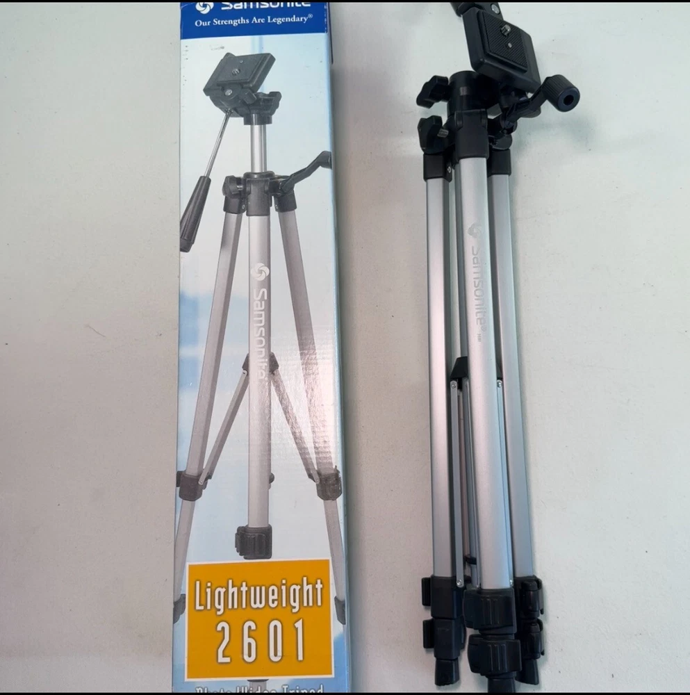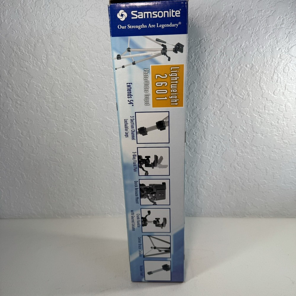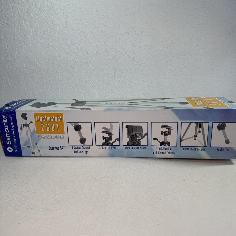Samsonite Lightweight 2601 Photo/Video Tripod Adjustable Height Aluminum Samsonite Tripod Pre-owned. No major flaws detected. Measurements Extends 54" - 3 Section Channel Lockable Legs - 3-Way Fluid Pan - Quick Release Mount - Crank Handle with Geared Column - Center Brace Column - Rubber Feet -Please inspect photos to approve condition. - From Smoke Free Environment - item shown is the exact item you will receive. -Open to offers -FAST SHIPPING **SHIPS FROM FLORIDA :) Photography, videography, content creation,