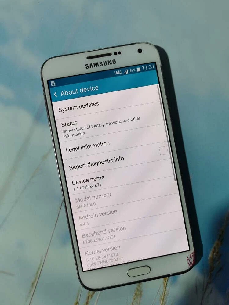 Samsung Gal axy E7 Package cont ain : 1 * phone (Unlocked tested ,fully working,) 1* USB Cable (not original) 1* Charger (not original) 1* Universal box (not original) you can choose if you want accessories and box. Complete Spec ificatio ns Versions: E7000, E7009, E700F, E700F/DS, E700H, E700H/DD, E700H/DS, E700M, E700M/DS Also known as Samsung Galaxy E7 Duos with dual-SIM card slots General Type Smartphone Brand Samsung Name Galaxy E7 Models SM-E7000, SM-E7009, SM-E700F, SM-E700F, SM-E700H, SM-E700H/DD, SM-E700H, SM-E700M, SM-E700M Launch Released February 01, 2015 Status Discontinued Design & Operating System OS Android 4.4.4 (KitKat) up to 5.1.1 (Lollipop) Dimensions 151.3 x 77.2 x 7.3 mm (5.96 x 3.04 x 0.29 in) (Height x Width x Thickness) Weight 141 g Color Options Black, White, Brown, Blue Display Specifications Technology Super AMOLED capacitive touchscreen, 16M colors Size 5.5 inches More devices with a similar display. > Resolution High Definition (HD) - 720 x 1280 pixels, 16:9 ratio (~267 ppi density) Protection Corning Gorilla Glass 4 Battery & Charging Capacity Non-removable Li-Ion 2950 mAh More devices with similar battery. > Processing Power CPU Quad-core 1.2 GHz Cortex-A53 Chipset Qualcomm MSM8916 Snapdragon 410 (28 nm) GPU Adreno 306 Memory & Storage Ram 2GB RAM Storage 16GB Built-in Card Slot microSD, up to 64 GB (uses shared SIM slot) Cameras Rear/Back 13 MP, f/2.1, 27mm (wide), AF Features LED flash, panorama, HDR Video 1080p@30fps Front 5 MP, f/2.2, 23mm (wide) Network SIM Single SIM (Nano-SIM) or Hybrid Dual SIM (Nano-SIM, dual stand-by) Data GSM / HSPA / LTE 2G Bands SIM 1: GSM 850 / 900 / 1800 / 1900 SIM 2: GSM 850 / 900 / 1800 / 1900 3G Bands HSDPA 850 / 900 / 1900 / 2100 4G Bands LTE band 1(2100), 3(1800), 5(850), 7(2600), 8(900), 20(800) - E700F LTE band 1(2100), 3(1800), 7(2600), 38(2600), 39(1900), 40(2300), 41(2500) - E7000 Connectivity WLAN (WIFI) Wi-Fi 802.11 b/g/n, Wi-Fi Direct, hotspot Bluetooth 4.0, A2DP GPS Yes, with A-GPS, GLONASS USB microUSB 2.0 NFC Yes (LTE model) Additional Features Sensors Accelerometer, proximity ANT+ Sound 3.5mm jack Yes Flashlight Yes