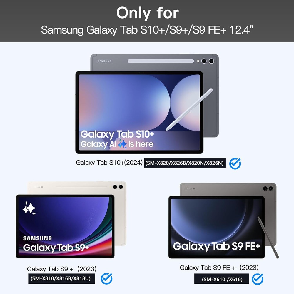 inkolelo Samsung Galaxy Tab S10+Plus S9 FE+ / S9+ Case with Keyboard 12.4 inch,Detachable Smart Tablet Keyboard with 7 Colors Backlit & Touchpad & S Pen Holder,Tab S9 FE Plus/S9 Plus Keyboard Case Product Details Package Dimensions: 12 x 8 x 1.38 inches Item Weight: 2 pounds Manufacturer: inkolelo Country of Origin: China Item model number: DYK-S9FE+ Batteries: 1 Lithium Polymer batteries required. (included) Brand: inkolelo Compatible Devices: Samsung Galaxy Tab S9 FE+ 5G (SM-X610/X616B)/ S9+ Plus 2023 12.4 inch(SM-X810/X816B/X818U) Connectivity Technology: Bluetooth Keyboard Description: Multi Functional Special Feature: Detachable, Portable, Touchpad, Backlit Number of Keys: 78 & : Featuring 3 brightness levels and 7 backlight colors, easily adjustable via shortcut keys. Perfect for typing in low-light settings, helping to reduce eye strain whether you're working or gaming in the dark. The wireless keyboard lasts up to 80 hours on a single charge without backlighting, or 7 hours with backlighting. Fully recharges in just 2-3 hours using the included Type-C charging cable. : The samsung tablet keyboard is lightweight and magnetically detachable. It connects via Bluetooth with a range of up to 10 meters. The Galaxy Tab S9+ case offers three viewing angles to accommodate your typing and viewing preferences, helping prevent joint discomfort and freeing up your hands for other activities. : The touchpad supports multi-finger gestures, such as tapping, swiping, scrolling, and pinch-to-zoom. Effortlessly navigate your tablet with precise fingertip control, mimicking the feel of a laptop mouse for a more comfortable and efficient experience. : The foldable design provides front and back protection on the go. An integrated S Pen slot keeps your pen secure, while the precise cutouts ensure easy access to all ports, sensors, speakers, microphones, and cameras.
