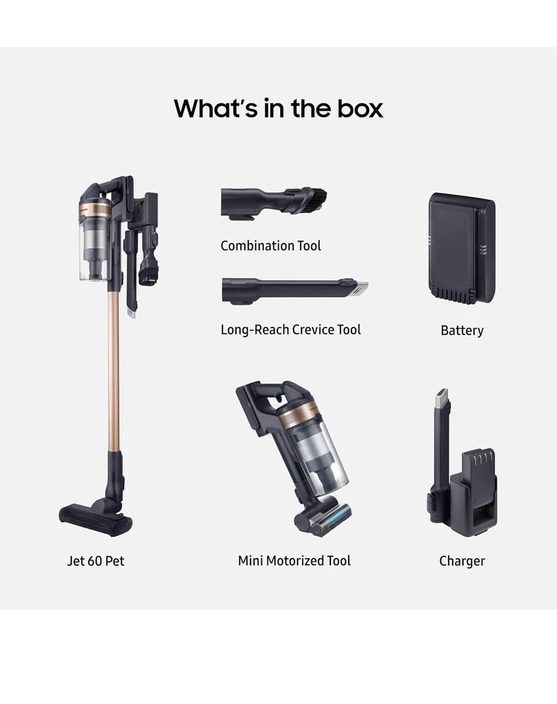 Samsung Jet 60 Pet Cordless Stick Vacuum Rose Gold VS15A6032R7 Product Description This is a Samsung Jet 60 Pet Cordless Stick Vacuum Rose Gold VS15A6032R7. The box has been opened for inspection, but all contents are in brand new condition and in the original packaging. See photos. Powerful Suction: Equipped with a 150W suction power, ensuring deep cleaning across carpets, hard floors, and upholstery. Pet-Friendly: Specially designed with a Turbo Action Brush to effectively remove pet hair and dander from all surfaces. Lightweight & Maneuverable: Weighing just 6.17 lbs, the Jet 60 Pet offers easy handling and effortless movement around your home. Long Battery Life: Features up to 40 minutes of continuous suction on a single charge, perfect for whole-house cleaning. Multi-Surface Cleaning: Includes versatile attachments like a crevice tool and mini motorized tool to clean tight spaces, upholstery, and more. Washable Filter: The multi-layered, washable filter ensures optimal airflow and traps dust for a cleaner home environment. Easy Storage: Comes with a wall mount to conveniently store the vacuum and accessories, saving space in your home. Sleek Rose Gold Design: Stylish and modern in a beautiful rose gold color, this vacuum blends seamlessly with your home decor. Product Specifics MPN: VS15A6032R7/AA Runtime: 40 min Filters: Washable Capacity: 0.8 L Color: Gold Brand: Samsung Included Accessories: Filter Bagged/Bagless: Bagless Voltage: 120 V Features: Battery Operated, Pet Hair Removal, Height Adjustment, Removable Brushroll, Carpet Cleaning, Edge Cleaning, Silent, Rinsable Filter, Handle Controls, Laser Detection, Portable, Head Light, Multi Surface, Rotating Brushes, Stair Grip, Telescopic Handle, Travel Ready, Compact, Ergonomic Handle Cord Type: Cordless Type: Stick Policies Shipping We ship every day Monday - Friday. All orders ship the following business day. Top Rated We have sold over 145,000 items on eBay and counting! Returns We hope you love your purchase, however if you need to return it, we have a 30 day return policy. Please note that the item you receive may vary slightly from the one pictured. We strive to provide accurate representations, but due to factors such as manufacturing variations or availability, the condition and appearance of the product you receive might differ. We cannot guarantee that every item will match the exact one depicted in the photo. Rest assured, our commitment to delivering a high-quality product remains unchanged. If you have any concerns or questions, feel free to reach out to us before making your purchase. Your satisfaction is our priority. Questions? Have a question you need answered? Message us on eBay and we'll respond within 1 business day! We want you to be confident with your purchase and are here to help put your mind at ease. About Us We are a small eBay store based out of Indianapolis, IN. We aim to provide great products at an even better discount. We post new items daily and always have a great grab bag of items to choose from. We rarely offer the same thing twice and that is what makes our eBay store so much fun. If you have any questions or concerns please feel free to drop us a message here on eBay and we will get back to you within 1-2 business days. Suggested For You Bissell ProHeat 2X Revolution Pet Pro Carpet Cleaner 3885F $199.99 Shark - Navigator Lift-Away Deluxe Upright Vacuum W/ Anti-Allergen Complete Seal $165.99 eufy RoboVac X8 Hybrid Wi-Fi Robotic Vacuum Cleaner 2-in-1 Sweep and Mop $299.99 Eufy Clean G30 SES Robotic Vacuum Cleaner T2272 $94.99 eufy L60 Robot Vacuum w/ Self Empty Station Hair Detangling Tech 5000 Pa SEALED $259.99 Dreo Cordless Stick Vacuum Cleaner DR-HFV001 $104.99 Dreo Cordless Stick Vacuum Cleaner DR-HFV001 $104.99 iHome - AutoVac Eclipse Wi-Fi Connected Robot Vacuum & Mop $104.99 Add suggested items to your listings - Check it out on 3Dsellers.com eBay listing template by 3D sellers.com - Try for Free!