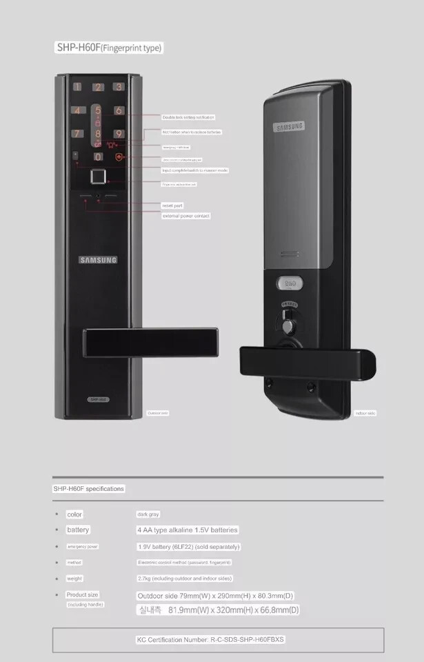 Specifica tions - Brand: Samsung - Model: SHP-H60F - Color: Dark Gray - Batteries: 4 AA-type alkaline 1.5V batteries - Emergency power: 9V battery (6LF22) - sold separately - Opening/closing method: Electronic control method (password, fingerprint), Smartphone (Bluetooth), Emergency key - Weight: 2.7 kg (including exterior and interior) - Product size (including handle): Outdoor side 79×290×80.3 mm (3.1×11.4×3.1 in) Indoor side 81.9×320×66.8 mm (3.2×12.5×2.6 in) - KC Verification Number: R-C-SDS-SHP-H60FBXS Contents - Zigbang SHP-H60F Smart Doorlock ~~~(^^)~~~ ~~~(^^)~~~ ~~~(^^)~~~ You can be reduced the prices and shipping by combined shipping The product is shipped from a big wholesaler in KOREA [PAYMENT 〕 We accept a variety of payments approved by eBay. Combined shipping available [CUSTOMS] According to eBay Policy, Customs Tax / Duty / VAT are under Buyer’s responsibility. 1.Delivery can be delayed because of strict customs (Brazil,Israel,Russia,Kazakhstan,Croatia,Argentina,Azerbaijan,Italy,Spain,Greese, Cyprus,Malta,South Africa...) 2.Please check with your tariff office the maximum free import value. 3.We will not be responsible for any custom taxes or VAT incurred. 4.if you have any message for custom clearance, please leave a note when you order. [Shipping] 1. Shipping from South Korea 2.We will ship your order within 1~4 business days by korea post after payment is received and we will ship the goods within 24 hours. *Estimated delivery time is as below a.⇒ 10~20 business days : South East Asia / Asia b.⇒10~20 business days : Australia / UK / USA / Canada c.⇒10~30 business days : France / Italy / Germany / Israel / Spain / Argentina / Europe d.⇒20 - 60 business days : Brazil / Middle East / Russian / Ukraine / Malta / relay shipping countries 3.We ship to eBay address and please make sure your eBay address correct before purchase. 4.Holidays are excluded from the shipping days. 5.Express shipping is available with additional charge. [About of Feedback] 1. Our goal is to make sure you are a happy buyer and pleasant shopping with us. 2. If you are satisfied with our product and services, please leave us a positive feedback. 3. If not satisfied it, we will do our great efforts to help you out and solve the problem. [Refund and Exchange] 1. Buyers are responsible for the return shipping charges if the refund is due to a change of mind. 2. All returned items for a refund must be in original condition and packed with the original packaging. 3. If the item is defective or damaged, we will replace or refund it. ☞☆☆☆ You can be reduced the prices and shipping by combined shipping The product is shipped from a big wholesaler in KOREA If you have any questions concerning this or other items please don't hesitate to email me for an answer ☞★★★ We check and inspect all styles and materials before we offer them. We always try our best to fullfill both quality and style. We carefully pack and ship all your orders after double check. We ship not just goods but also serve the best service to satisfy our customers We hope that you enjoy shopping on ebay ~~^^;