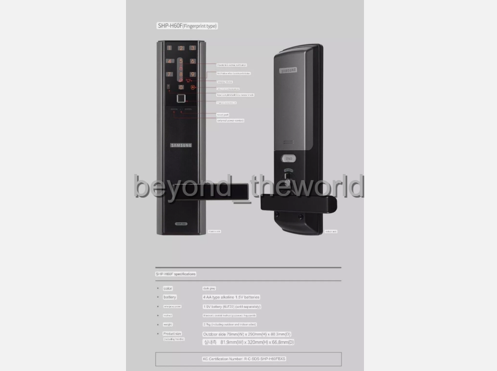 Welcome to Beyond_theworld's store - All items that we sell is 100% an authentic and new one. - We sell everything for about a bucks cheaper than our competitors. - Kindly browse around our store and find the most reasonable price :) Zigbang SHP-H60F Smart Doorlock Bluetooth IoT Finger Mobile App key Features - Longer hours of use (based on 10 companies per day, available for 12 months - Wi-Fi Integrated - Real-time access history and door lock status check - OPEN with your smartphone anytime, anywhere - Real-time notification of family return - Issuance of a visitor-only access key - Issuing a one-time temporary password - Avoid data hacking with triple security - Kakao Home Interworking - Dual authentication mode - Privacy mode - Setting up a crime prevention policy - Intrusion and prank protection - Magic Number Dual Security - High temperature sensor function, such as fire - Notify when to replace the battery - When the battery is discharged, the door lock can be opened with the battery - Sound setting manner function - Emergency key - Waterproofing for living - Safer RoHS certified door locks Specifications - Brand : SAMSUNG - Model : SHP-H60F - Color: Dark Gray - Batteries: 4 AA-type alkaline 1.5V batteries - Emergency power: 9V battery (6LF22) - sold separately - Opening/closing method: Electronic control method (password, fingerprint), Smartphone (Bluetooth), Emergency key - Weight: 2.7 kg (including exterior and interior) - Product size (including handle): Outdoor side 79×290×80.3 mm (3.1×11.4×3.1 in) Indoor side 81.9×320×66.8 mm (3.2×12.5×2.6 in) - KC Verification Number: R-C-SDS-SHP-H60FBXS Contents - Zigbang SHP-H60F Smart Doorlock - Handling time : 3 business days from the payment receiving date. Return Policy All buyers have the right to return the item if not satisfied. Returns are available within 30 days of the receiving date. We will cover the round shipping fees on defective products but will not cover return shipping fees on buyer's simple change or wrongfully purchased orders. Duties & Customs We are not responsible for any duties and taxes incurred by the customs of buyer country. Customer Service We will do the best to solve the problem that may occur. Please Feel free to contact us at any time :) Feedback Policy Please send us a message if you have a problem on items before opening a case or leaving feedback we will do our best to resolve the problem.
