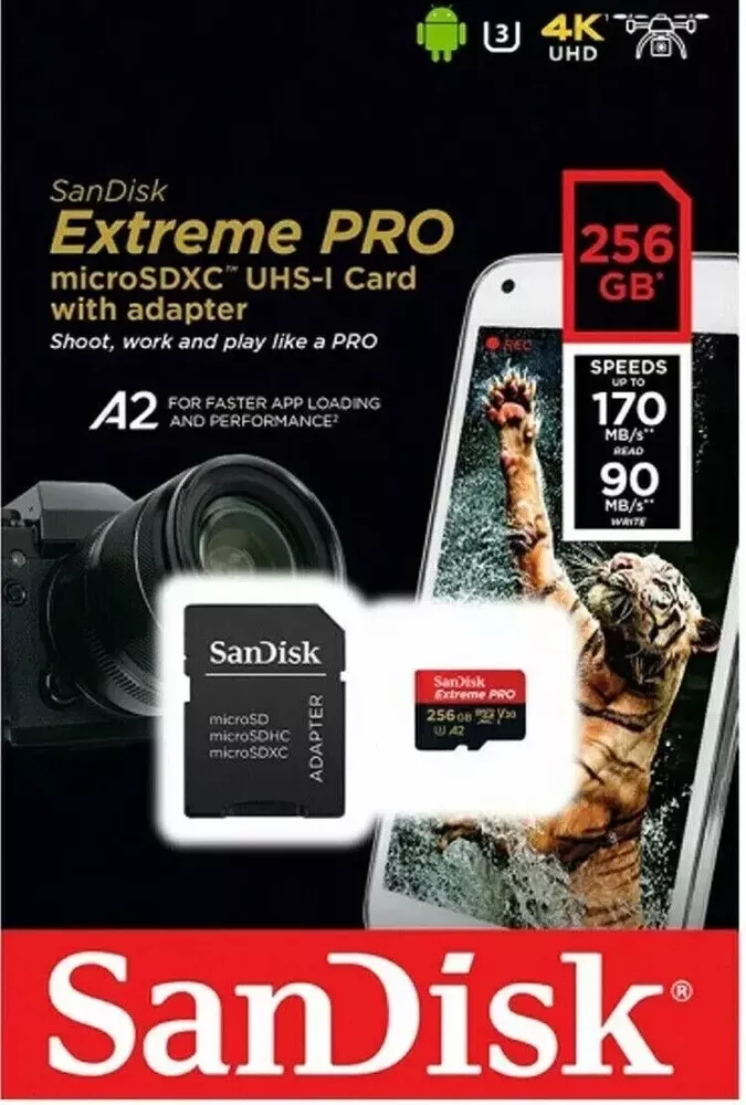 SanDisk 256GB/512GB/1TB Extreme Pro Micro SD MicroSDXC UHS-I U3 A2 Memory Card W/ Adapter Item Weight: 0.32 ounces Item Dimensions LxWxH: 0.59 x 0.04 x 0.43 inches Features: Ideal for Android smartphones and tablets, and cameras. Operating Temperature- (-13°F ) to 185°F (-25°C to 85°C) Package Include: 1 x microSDXC card 1 x Adapter