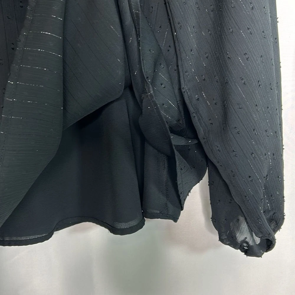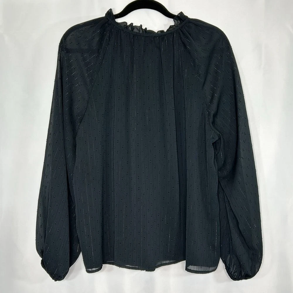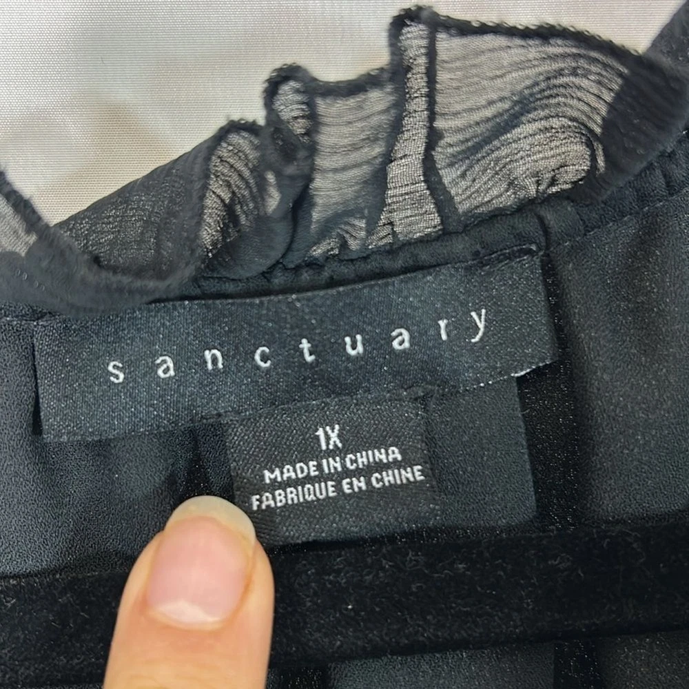 Sanctuary Tinsel Weave Chiffon Peasant Blouse Size 1X. This top is in good used condition with no notable pilling, pulls, awkward stretching or color fading. It features a textured tinsel weave chiffon shell, ties at the neck, a flowing peasant sleeve cut and ruffle at the neckline. It measures approx: bust 51in, length from shoulder to hem 25.5in.
