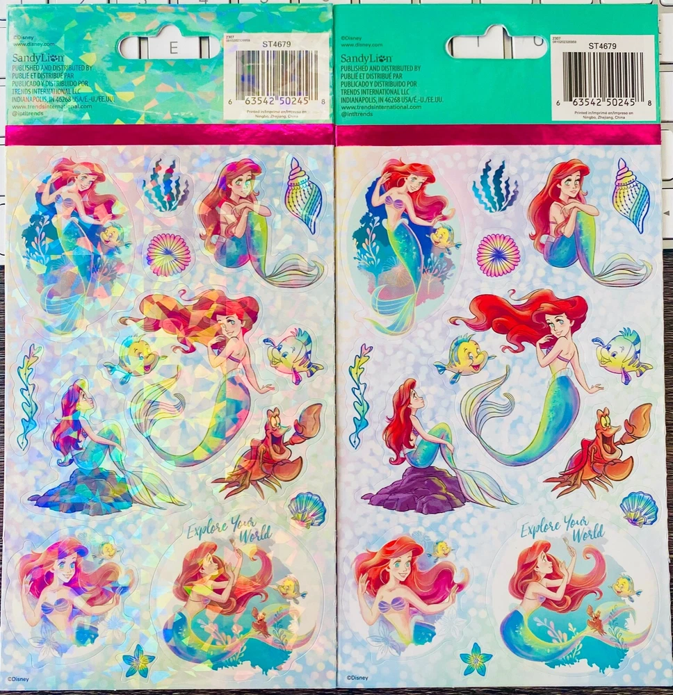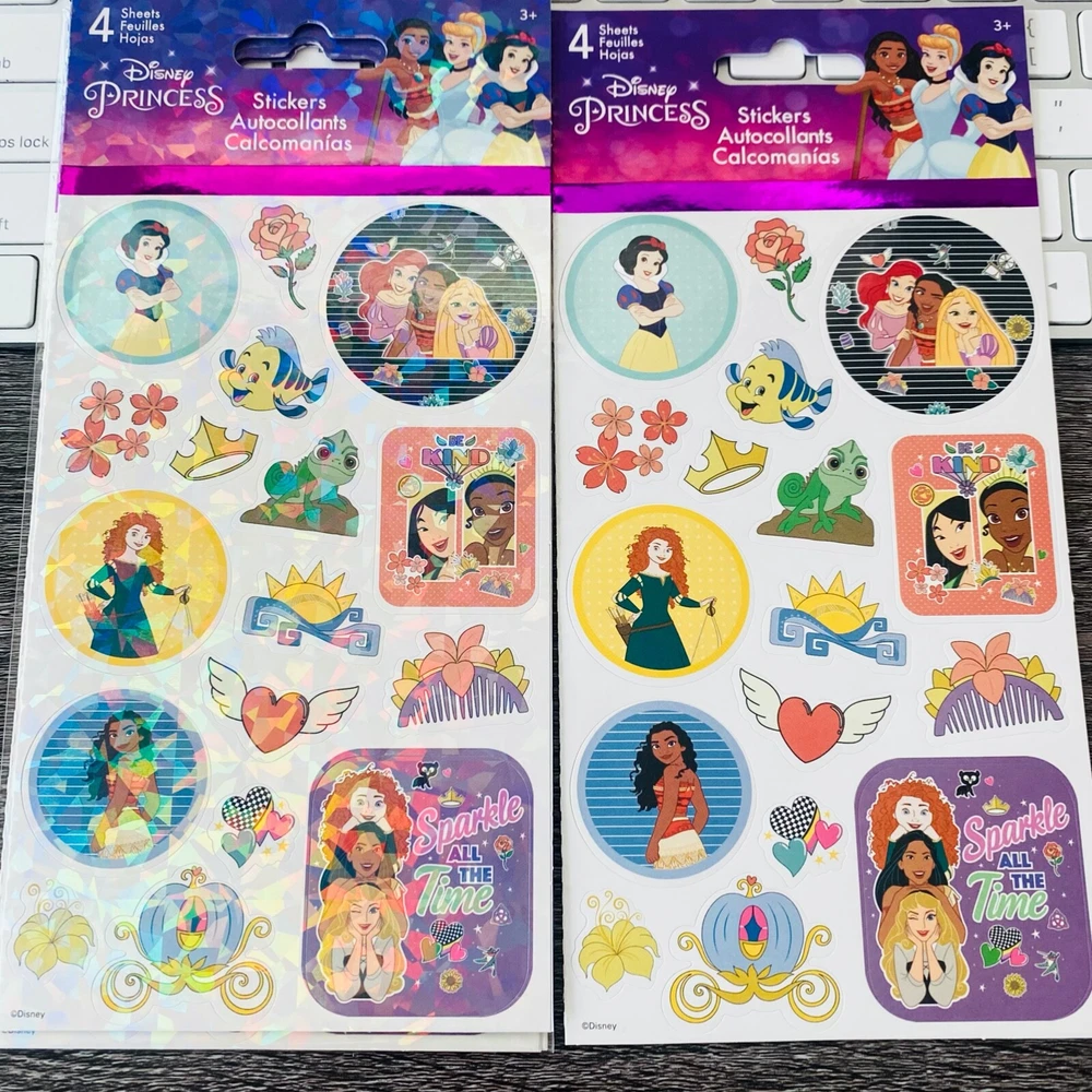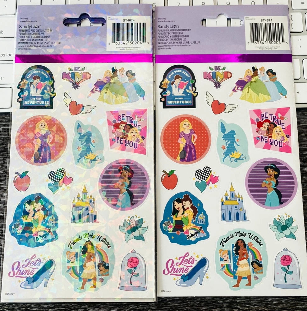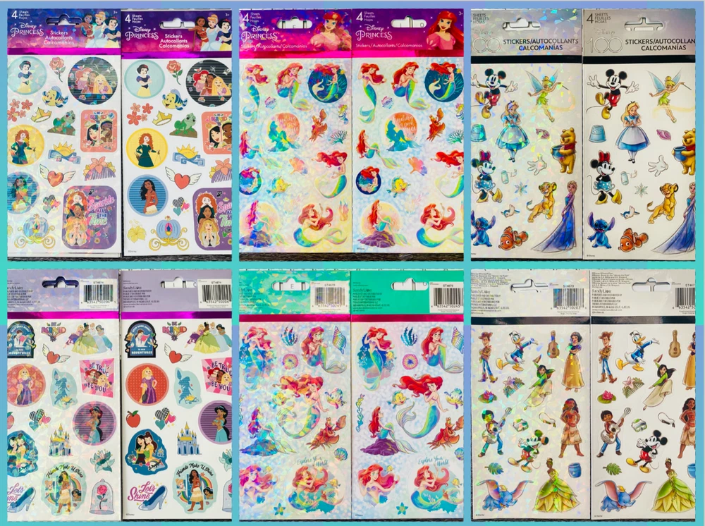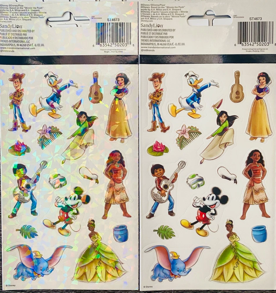 These FABULOUS stickers feature beloved Disney characters such as Mickey Mouse, Snow White, Tinkerbell, Simba, Elsa, Nemo, Stitch, Pooh, Little Mermaid Ariel, Minnie Mouse, Alice & Wonderland, Belle, Moana, Raya, Tiana, Rapunzel, Merida, Jasmine and many others. The stickers are prismatic and glossy, perfect for adding a touch of magic to your scrapbooking or paper crafting projects . With this lot, you will receive 12 New Full Sheets of stickers, each featuring a different set of characters. These stickers are made by Sandylion and are great for Disney fans of all ages. Add a touch of whimsy to your next crafting project with these adorable stickers.