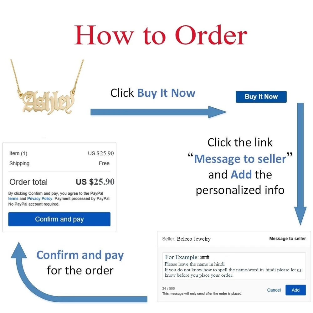 HIGH QUALITY FREE SHIPPING FOR US ORDERS BEST PRICING H O W ∙ T O ∙ O R D E R: ✔ Choose material. ✔ Choose necklace length and type. ✔ Leave the name in the "message to Seller" box when you checkout with your personalization name. ▪ Please leave the name in Hindi language. Item Description: ▪ Material: Sterling Silver 925 or Gold/Rose Gold Plated 18k. ▪ It's coat with at least 2 micron of real 18K gold for a long lasting item. ▪ Pendant size: 16*16mm. ▪ Up to 12 characters. Necklace Length: ▪ 16 inches = 40 cm (Age 6-18 years). ▪ 18 inches = 45 cm (Most popular size for women). ▪ 20 inches = 50 cm (Please See Size Picture). ▪ 24 inches = 60 cm (Please see Size Picture). Shipping Payments Returns ABOUT US Shipping Payments Returns ABOUT US ▪ US ORDERS: Standard shipping 1-5 business days (FREE). DHL Express 1-4 business days (14.90$). ▪ Other countries: Expedited shipping by DHL Express 2-6 business days (14.90$). Please pay attention: ▪ We ship to your eBay or Paypal address. Please make sure your eBay and Paypal address is correct before you pay. ▪ Items will be shipped within 1-5 business days when we received payment. ▪ International buyers please note: A. Import duties, taxes and charges are not included in the item price or shipping charges. These charges are the buyer’s responsibility. We will try our best to reduce the risk of customs duties. B. Please check with your country's customs office to determine what these additional costs will be prior to buying. We accept payment by any of the following methods: PayPal If you are not 100% satisfied with your purchase, you can return the product and get a full refund or exchange the product for another one, be it similar or not. You can return a product for up to 30 days from the date you purchased it. Any product you return must be in the same condition you received it and in the original packaging. Shipping charges for item return will apply to the customer. Hey there, welcome to Beleco Jewelry! At BELECO, we take a personal approach to not only design, but customer service. You could say we are all about personality, personalization and personability. All of our handmade jewelry is made from top-notch materials and is full of fun, flare and a playful attitude towards life and style. We love to experiment with different typography styles, create unique takes on classic pieces and show off our expertise in silver, gold plating and engraving. We believe that every person deserves a unique piece of jewelry, just for them or for their loved ones. This is why we love to offering personalized pieces that allow anyone to become part of the design process - making the final jewelry piece that much more meaningful. Through our eclectic collection and then free-wheeling customization, anyone can get what they truly want (and look great doing it!) To put a cherry on top, our customer service standards are top-tier. We not only offer a 1 year warranty, but also a 100 day return policy. Our delivery is speedy, our team is friendly, and we genuinely just want to get you the best (sparkliest and specialist) piece of jewelry you could want. ✨Keep Shining ✨ -The BELECO Team H O W ∙ T O ∙ O R D E R: ✔ Choose material. ✔ Choose necklace length and type. ✔ Leave the name in the "message to Seller" box when you checkout with your personalization name. ▪ Please leave the name in Hindi language. Item Description: ▪ Material: Sterling Silver 925 or Gold/Rose Gold Plated 18k. ▪ It's coat with at least 2 micron of real 18K gold for a long lasting item. ▪ Pendant size: 16*16mm. ▪ Up to 12 characters. Necklace Length: ▪ 16 inches = 40 cm (Age 6-18 years). ▪ 18 inches = 45 cm (Most popular size for women). ▪ 20 inches = 50 cm (Please See Size Picture). ▪ 24 inches = 60 cm (Please see Size Picture). HIGH QUALITY FREE SHIPPING FOR US ORDERS BEST PRICING H O W ∙ T O ∙ O R D E R: ✔ Choose material. ✔ Choose necklace length and type. ✔ Leave the name in the "message to Seller" box when you checkout with your personalization name. ▪ Please leave the name in Hindi language. Item Description: ▪ Material: Sterling Silver 925 or Gold/Rose Gold Plated 18k. ▪ It's coat with at least 2 micron of real 18K gold for a long lasting item. ▪ Pendant size: 16*16mm. ▪ Up to 12 characters. Necklace Length: ▪ 16 inches = 40 cm (Age 6-18 years). ▪ 18 inches = 45 cm (Most popular size for women). ▪ 20 inches = 50 cm (Please See Size Picture). ▪ 24 inches = 60 cm (Please see Size Picture). Shipping ▪ US ORDERS: Standard shipping 1-5 business days (FREE). DHL Express 1-4 business days (14.90$). ▪ Other countries: Expedited shipping by DHL Express 2-6 business days (14.90$). Please pay attention: ▪ We ship to your eBay or Paypal address. Please make sure your eBay and Paypal address is correct before you pay. ▪ Items will be shipped within 1-5 business days when we received payment. ▪ International buyers please note: A. Import duties, taxes and charges are not included in the item price or shipping charges. These charges are the buyer’s responsibility. We will try our best to reduce the risk of customs duties. B. Please check with your country's customs office to determine what these additional costs will be prior to buying. Payments We accept payment by any of the following methods: PayPal Returns If you are not 100% satisfied with your purchase, you can return the product and get a full refund or exchange the product for another one, be it similar or not. You can return a product for up to 30 days from the date you purchased it. Any product you return must be in the same condition you received it and in the original packaging. Shipping charges for item return will apply to the customer. ABOUT US Hey there, welcome to Beleco Jewelry! At BELECO, we take a personal approach to not only design, but customer service. You could say we are all about personality, personalization and pe
