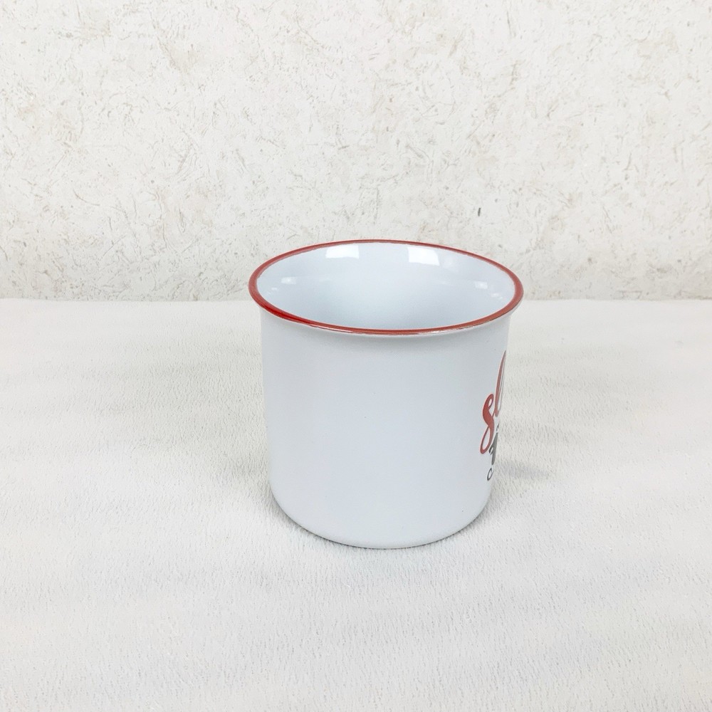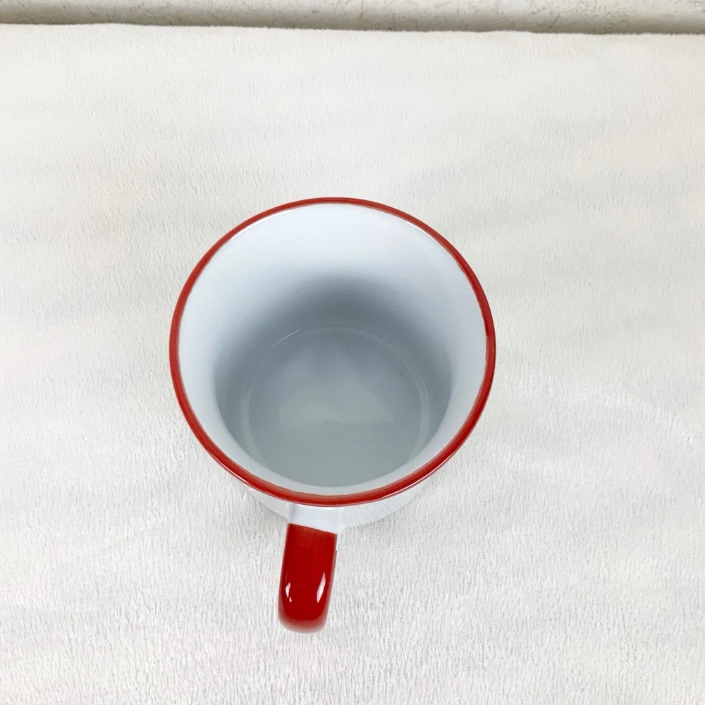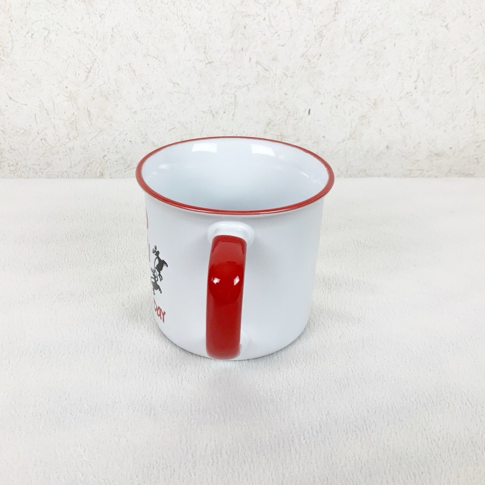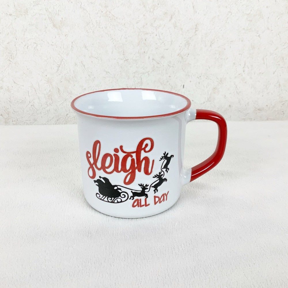 Brand new Ceramic coffee mug Santa with reindeer design, says sleigh all day Red handle and trim 16 oz Dishwasher, microwave safe Measurements: Height 3.5” Width 4” side to side, 6” handle to side