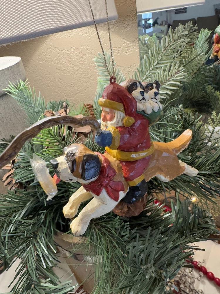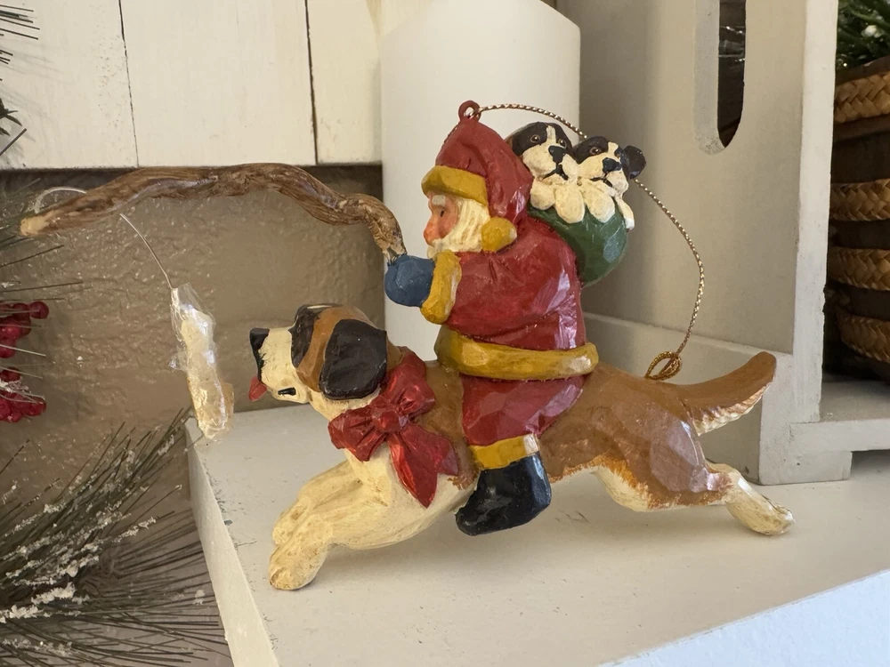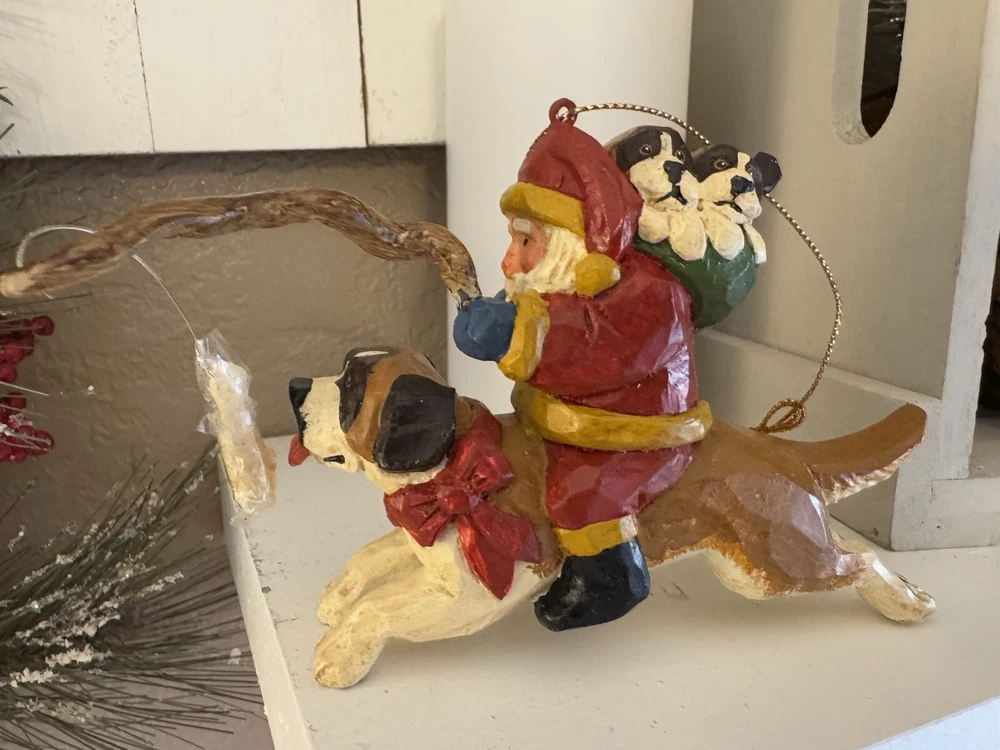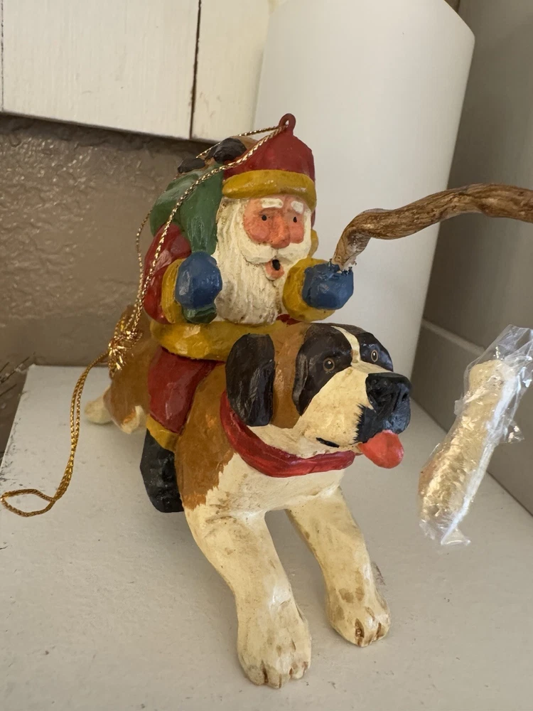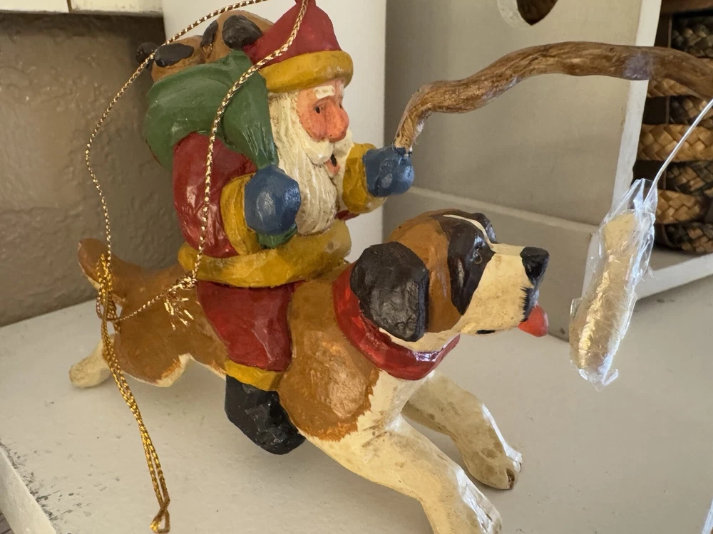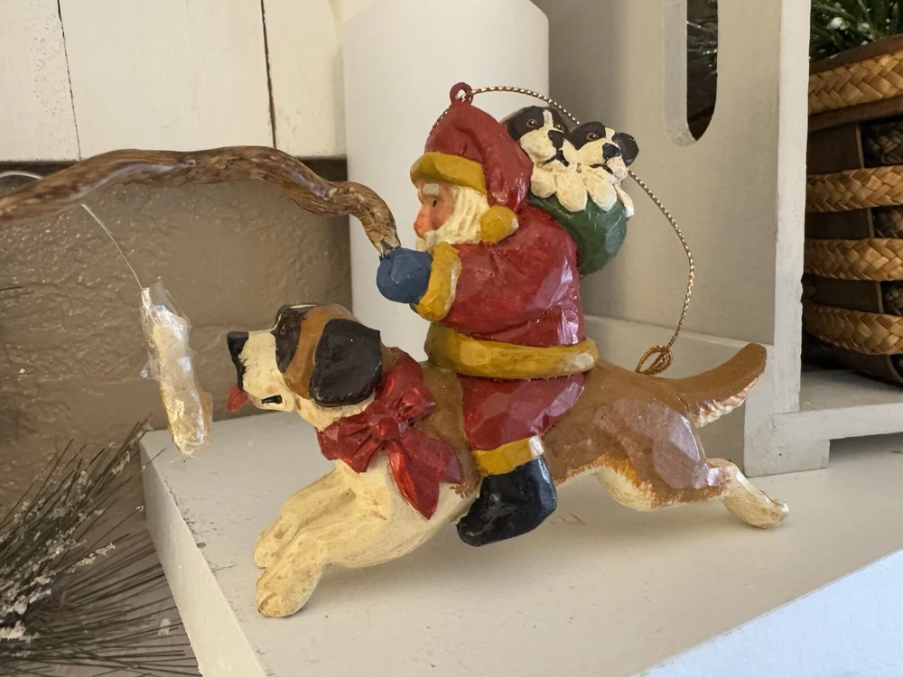 NEVER DISPLAYED NEW I opened the cello for photos The lead stick with doggie bone was in place in Santa's hand when I opened cello ALL IS EXCELLENT condition Gorgeous House of Hatten Santa on St. Bernard with puppies in toy sack Please see all photos SMOKE FREE HOME ALWAYS happy to combine for real shipping savings