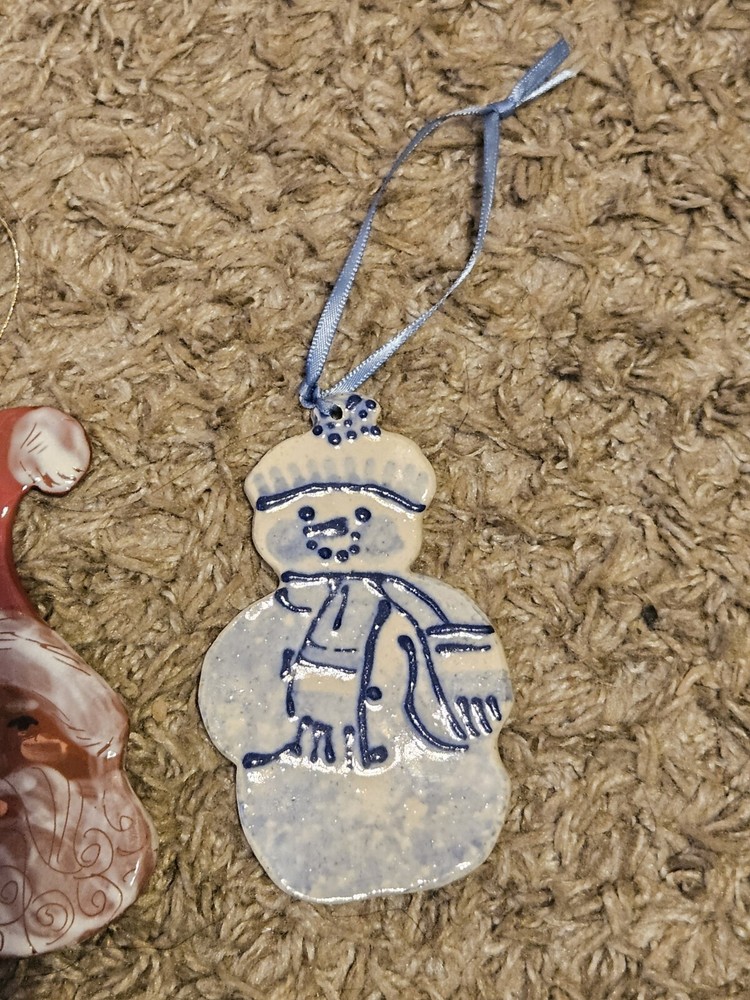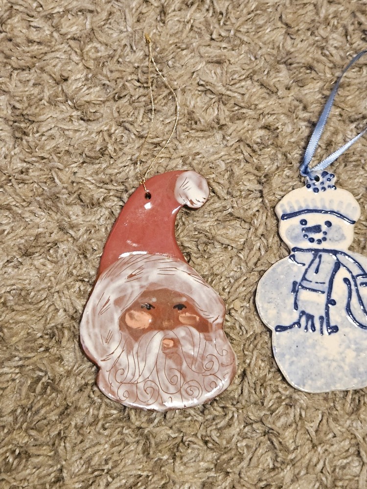 Santa and Snowman Flat Christmas Ornament Set in Polish Pottery from Poland