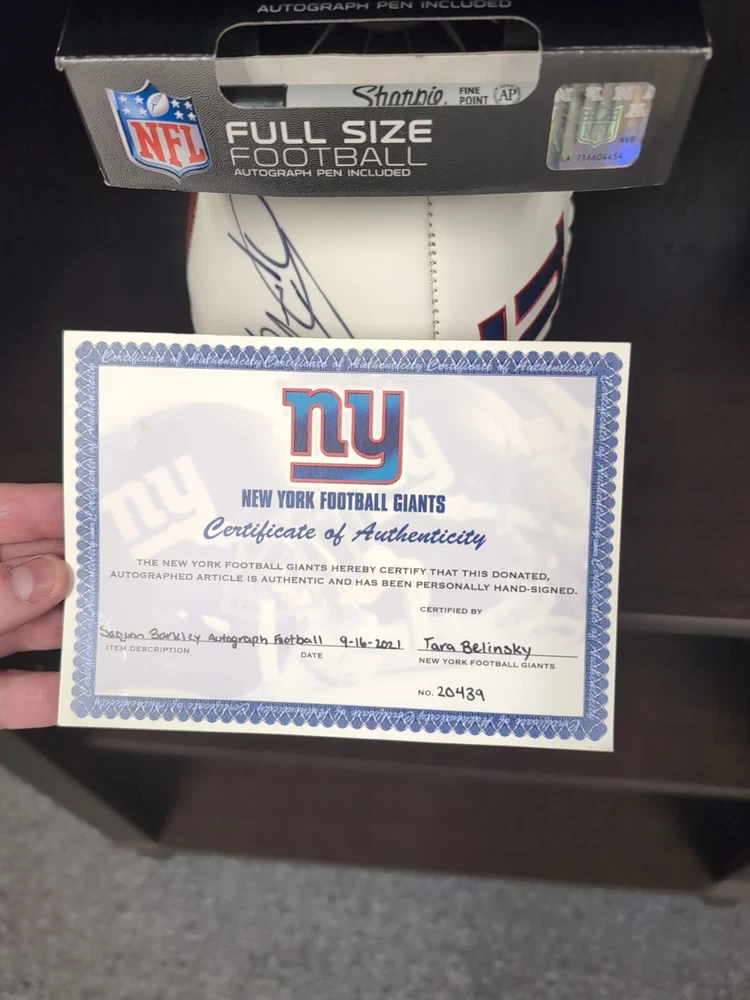Saquon Barkley Autographed football. New York giants panel on one side, autograph on separate panel. Won at a golf tournament raffle, I don't have any connection to the player or sport so looking to move to someone who does. Pen used to autograph and certificate of authenticity included.