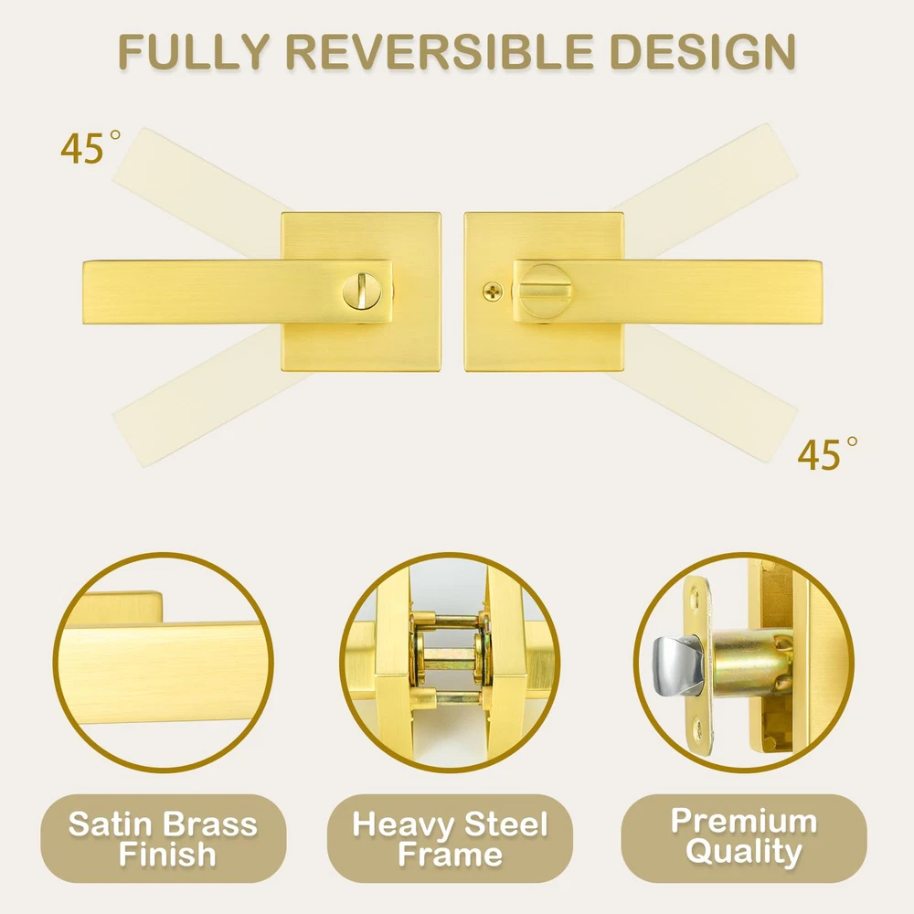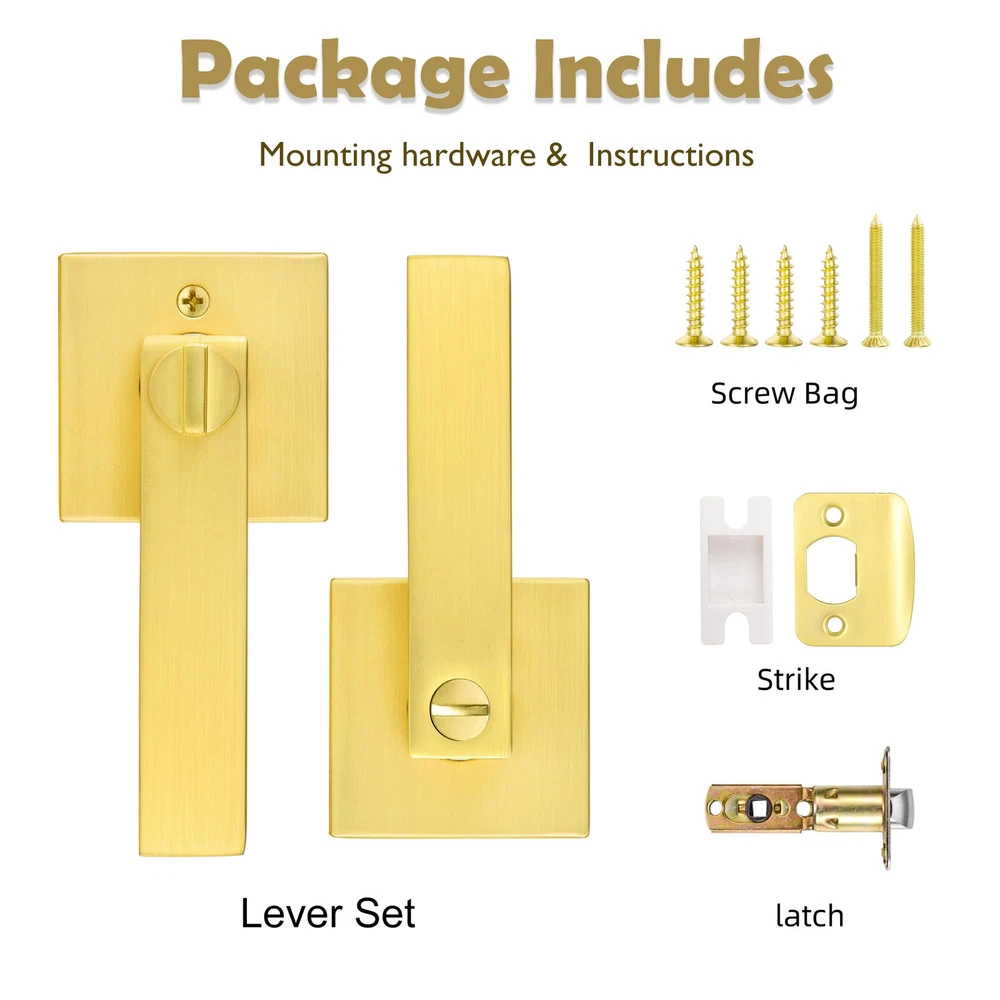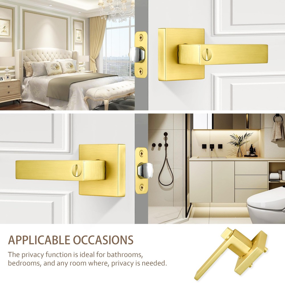 Satin Brass Door Knobs Door Handles Interior with Lock , Privacy Gold Door Knob Door Levers for Bed/Bath (Keyless,1Pack) 【PRIVACY FUNCTION 】The privacy function is ideal for bedroom/bathroom and any room where privacy is needed. 【MODERN DOOR HANDLE】Classic & Simple.Upgrade your home's aesthetic today with the door handle. 【kEYLESS】 The door knob can be locked using the thumb turn button from inside and opened outside in with hex key(included). 【STANDARD DOOR USING】The door levers fit for door thickness from 1-3/8" to 1-3/4"(35-45mm),adjustable latch fits 2-3/8" or 2-3/4"(60 or 70mm). 【EASY INSTALLATION】Comes complete with mounting hardware & includes easy to understand instructions.
