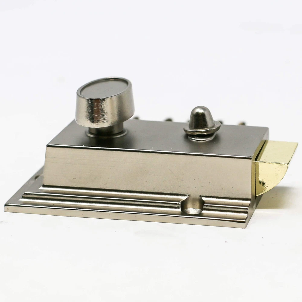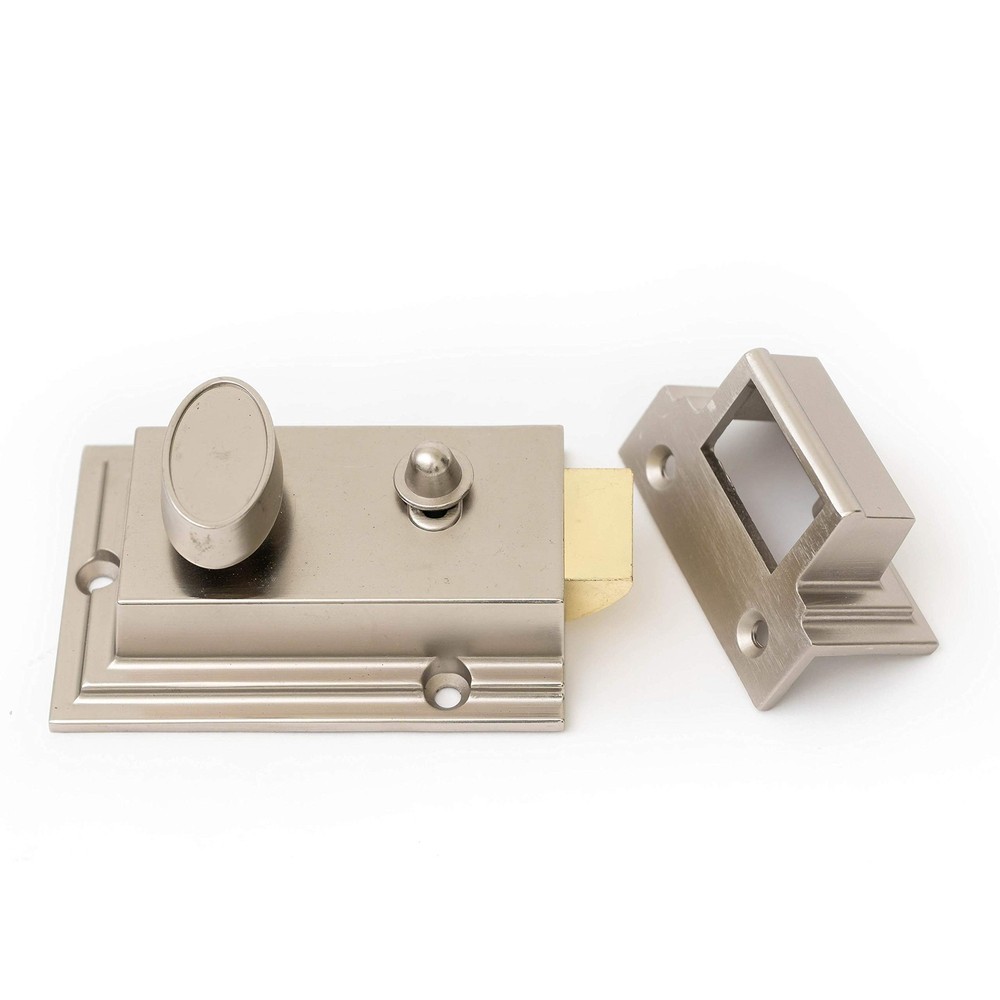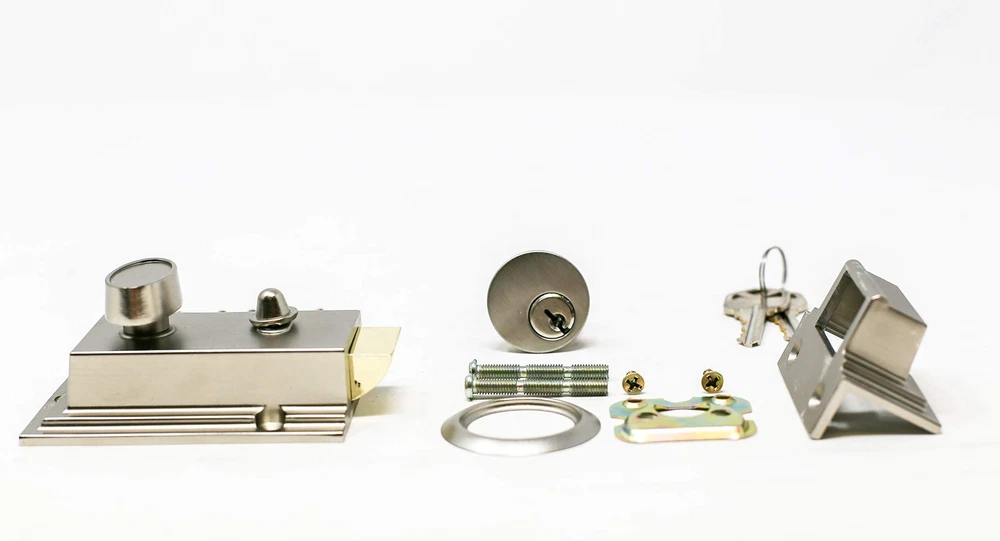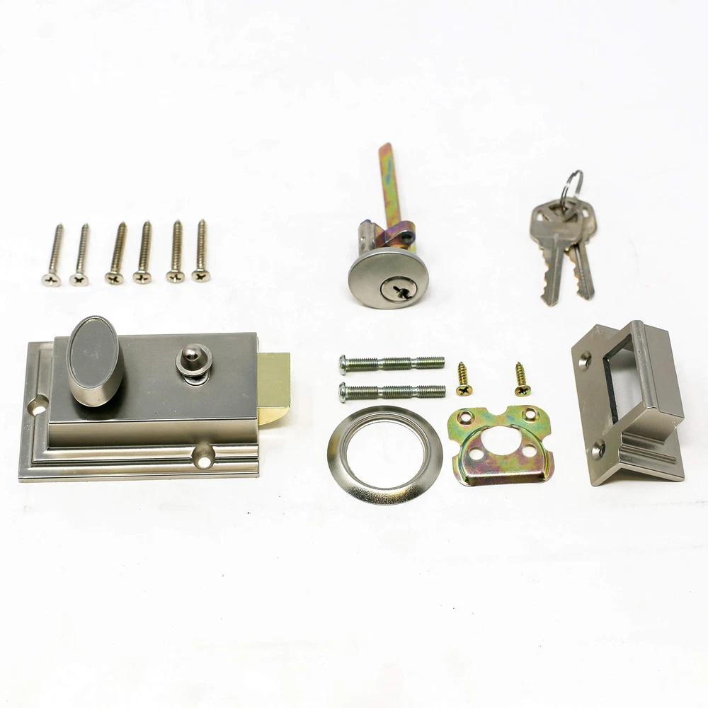Night latch door security lock, single-cylinder with latch bolt, holdback button with two-piece keys, satin finish. Bolt door latch brass with hold-back function, stronger mechanisms with over 250,000 life cycles. Suitable for use with doors 1-3/8 inch to 2-3/8 inch thickness. Suitable for use with doors 1-3/8 inch to 2-3/8 inch thickness. Durable steel and solid brass construction. Heavy Duty Security Lock: This lock is designed for heavy-duty security use with a modern satin nickel finish. Single Cylinder Rim Lock: Features a single cylinder rim lock with a touch-activated deadbolt for easy access and security. Mechanical Knob Control: Operates using a mechanical knob for easy control and operation. Includes Two Keys: Comes with two keys for convenient access and use. Single Piece Hardware Set: Complete hardware set includes lock, latch, and holdback button for versatile installation.