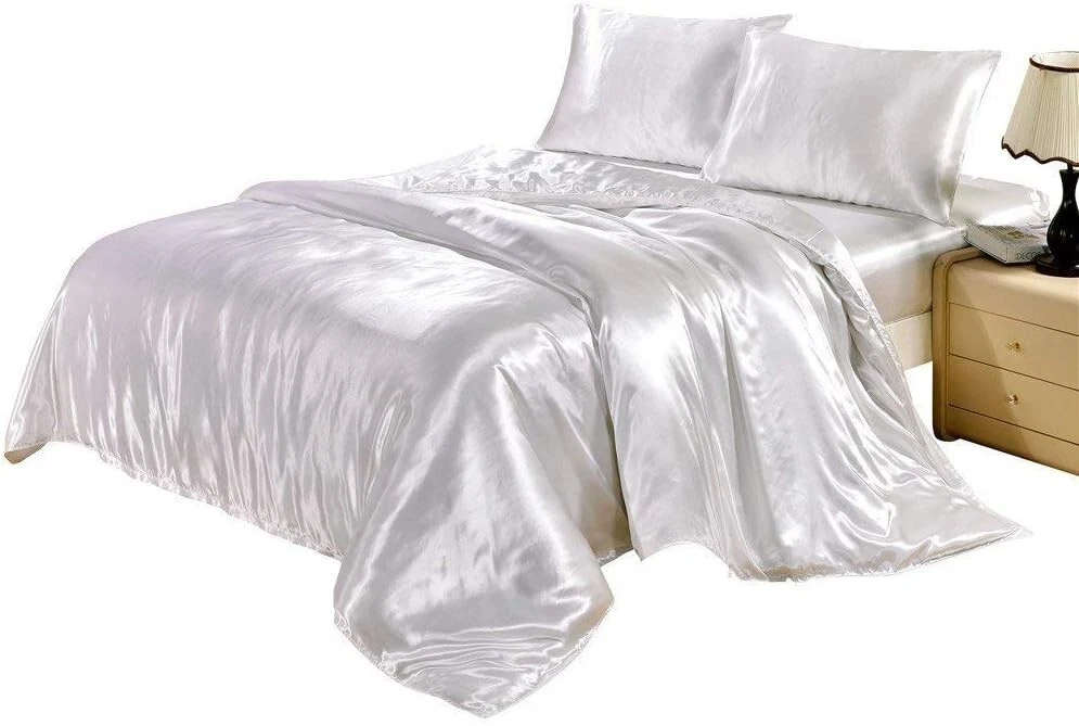 Satin Wrinkle Free Luxurious and Soft Silky with 10"–16" Deep Pocket 4 Pieces Durable Bed Sheet Set (1 Flat Sheet, 1 Fitted Sheet & 2 Pillowcases) Queen, White Satin. Package Includes: 1 Top/Flat Sheet, 1 Bottom/ Fitted Sheet, And 2 Pillowcases. Queen Size Measurement: 1Top/Flat Sheet (90X105) Inch, 1 Bottom/Fitted Sheet (60X80X16) Inch, And 2 Pillowcases (20X30) Inch. Extra Deep Pocket Sheet: These bedsheets are for very deep pocket mattresses. They fit any mattress with pockets that are 10, 11, 12, 13, 14 and 16 inches deep mattresses. There's a stretchable elastic around the extra deep fitted sheet which stretches for a nice tug around your mattress. Perfect for extra tall & large mattresses. It is perfect for any room. Highest Quality Best Satin Sheets: Made from satin silk for softness and luxury. Enjoy the luxury and comfort of soft sheets with the most amazing hand feel. Comfort, lustrous with softness, these sheets have great breathability for the perfect joy of silk sheets. Great Gift For Any Occasion: This bedding set is not only perfect for your own bedroom, guestroom, living room, but also a great birthday Christmas New Year Gift Idea for boys girls women men child boyfriend girlfriend adults. Surprise your friends and family with these elegant and durable sheets. Care Instructions: Machine washable, wash with similar colors in cold water, recommend to hung dry, do not bleach, cool iron if necessary. bout Us: Super Soft Luxurious and Ultra Soft Best Pure Satin 4 Pieces Bedding Sheet Set With 16" Deep Pocket (1 Top/Flat Sheet, 1 Bottom/Fitted Sheet & 2 Pillowcases). Give yourself a wondrous night's sleep with this luxurious satin sheet set. The satin sheets will envelop your bed in elegance and luxury at a more affordable cost. The fitted sheets are made fully-elastic to ensure a secure fit on mattresses up to 16 inches deep. Available Size: Twin Size, Twin XL Size, Full Size, Full XL Size, Queen Size, King Size, California Size, Customize. Available Colors: Red, Burgundy, Lilac, Olive, Peach, Purple, Royal Blue, Sage, Sky Blue, Taupe, Turquoise Blue, White, Ivory, Elephant Grey, Silver Grey, Black, Pink, Gold, Brown, Chocolate, Hot Pink, Aqua Blue, Yellow.