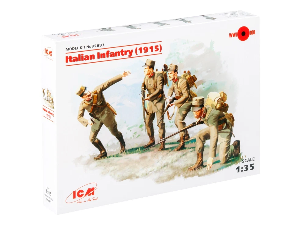 Plastic model kit Scale: 1/35 High-quality details. Manufacturer: ICM Models Country/Region of Manufacture: Ukraine Composition: Plastic Model Kit Material: Plastic Paint: Unpainted, Unassembled, Kit do not contain paints and glue. Condition: New in Box Features: Kit Italian Infantry (1915) (4 figures) in scale 1:35 The complete set includes: 4 figures in various poses The average height of figures: 50 Glue and paints are not included