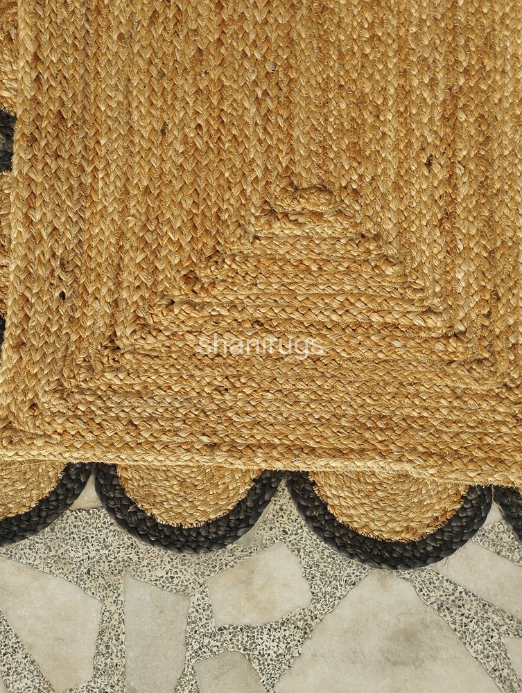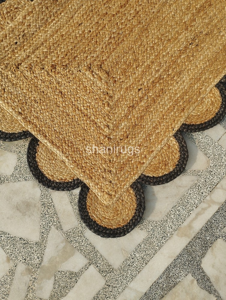 A scalloped jute rug features a natural, earthy design made from tightly braided or woven jute fibers, a plant-based material known for its durability and sustainability. The scalloped edges give the rug a decorative and elegant touch, softening its otherwise rustic appearance. Typically, these rugs come in neutral tones like beige, tan, or brown, which highlight the organic texture of the jute. The scalloped detailing adds a unique, artisanal look, making it an attractive accent for a range of interiors, from coastal and bohemian to farmhouse and contemporary spaces.