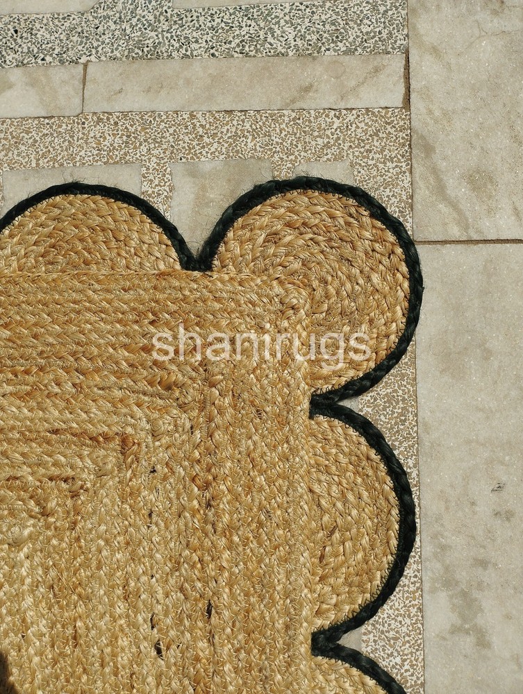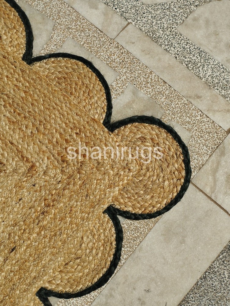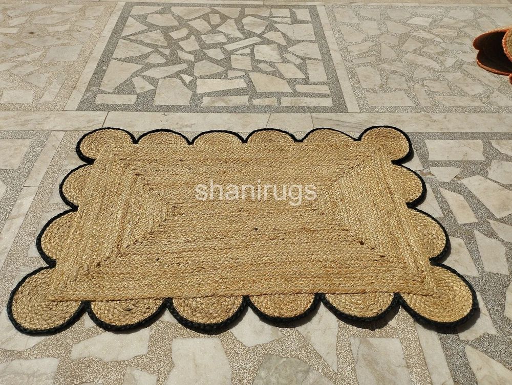 A scalloped jute rug features a natural, earthy design made from tightly braided or woven jute fibers, a plant-based material known for its durability and sustainability. The scalloped edges give the rug a decorative and elegant touch, softening its otherwise rustic appearance. Typically, these rugs come in neutral tones like beige, tan, or brown, which highlight the organic texture of the jute. The scalloped detailing adds a unique, artisanal look, making it an attractive accent for a range of interiors, from coastal and bohemian to farmhouse and contemporary spaces.