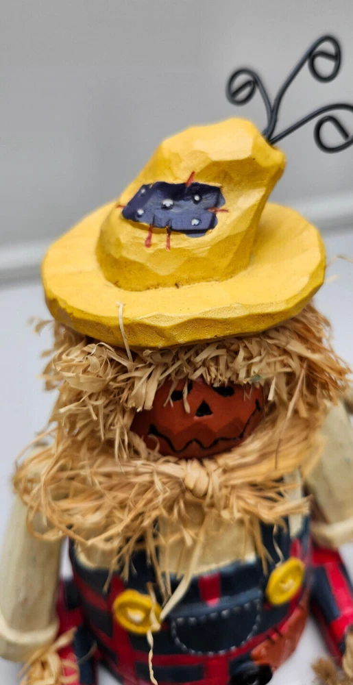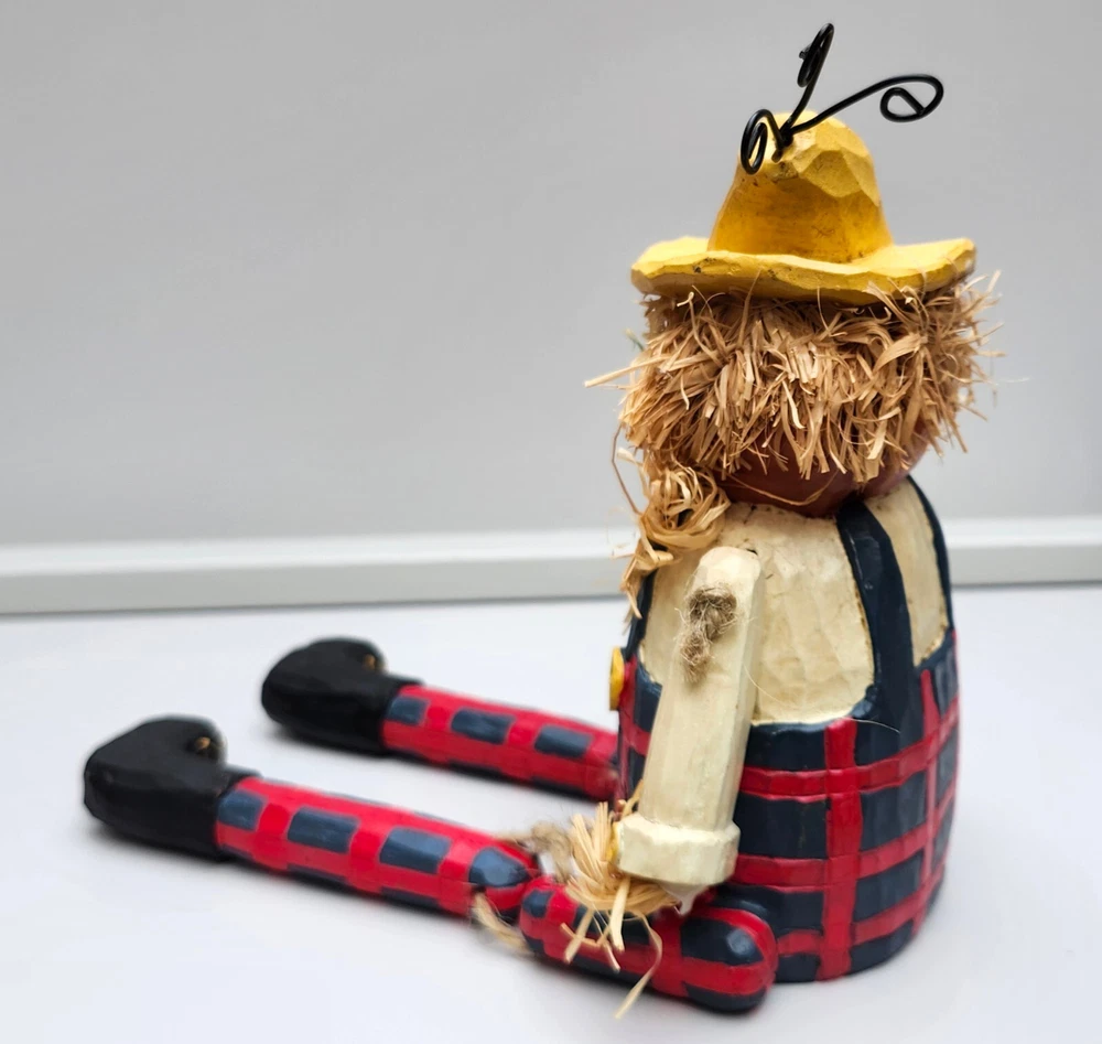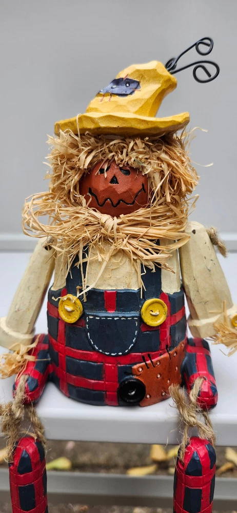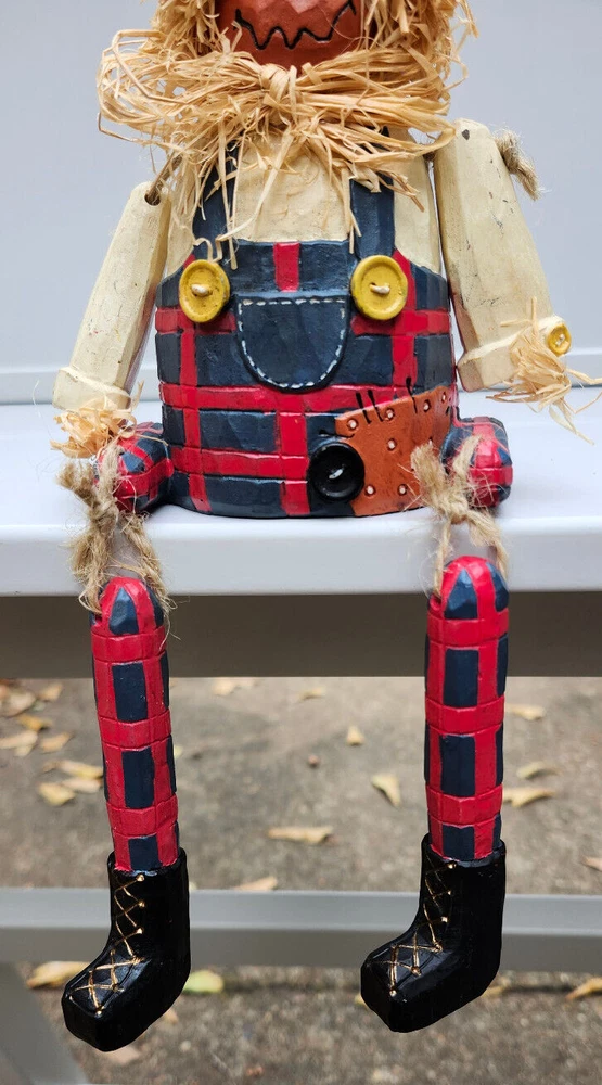 Scarecrow Shelf Sitter, Jack-o-Lantern Pumpkin Head, Vintage Dangling Legs, Patchwork Hat, Overalls. Cool Halloween Fall Decor. Cute piece! 🎃 11" tall x 5" wide